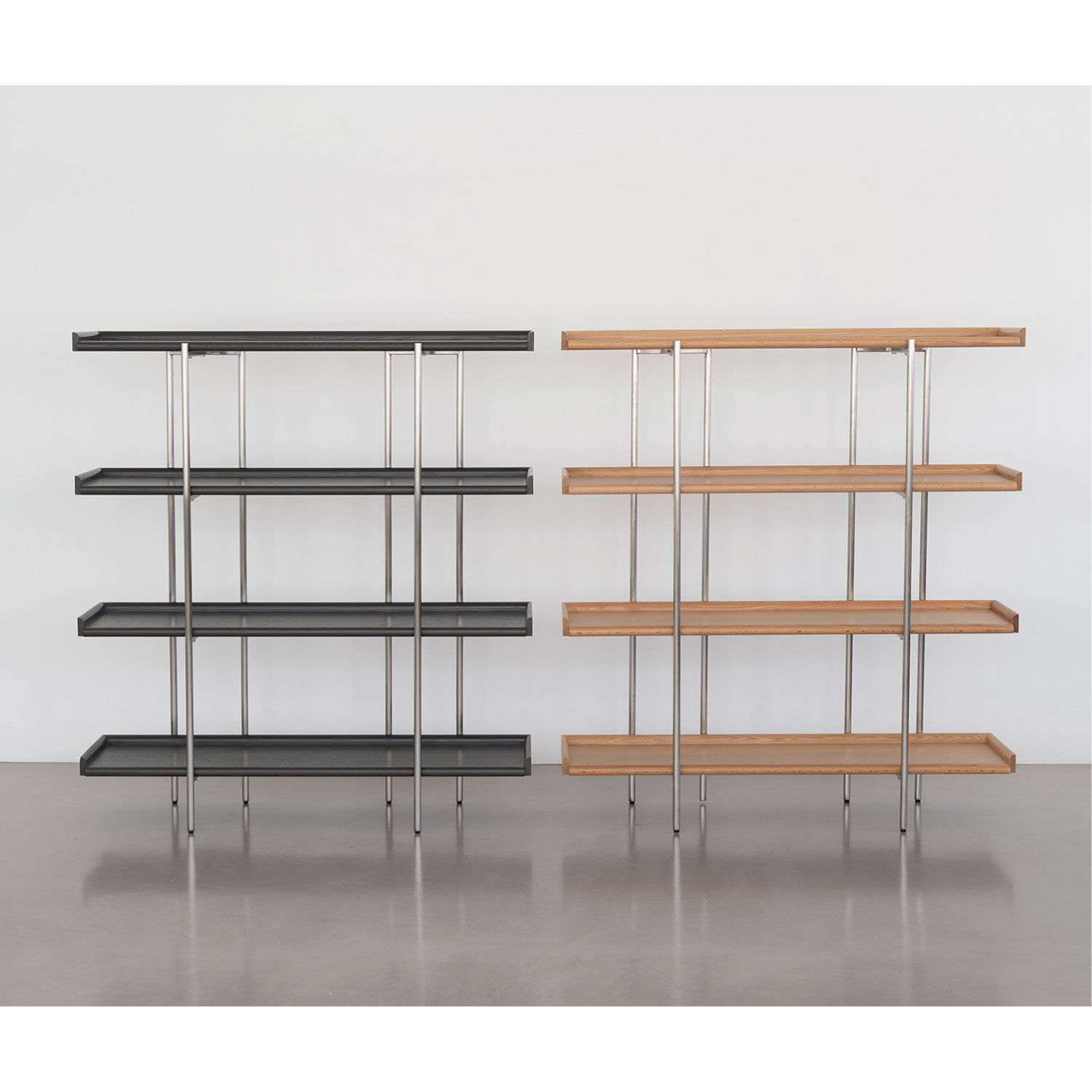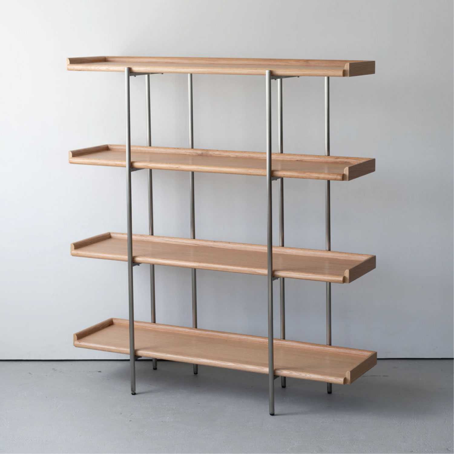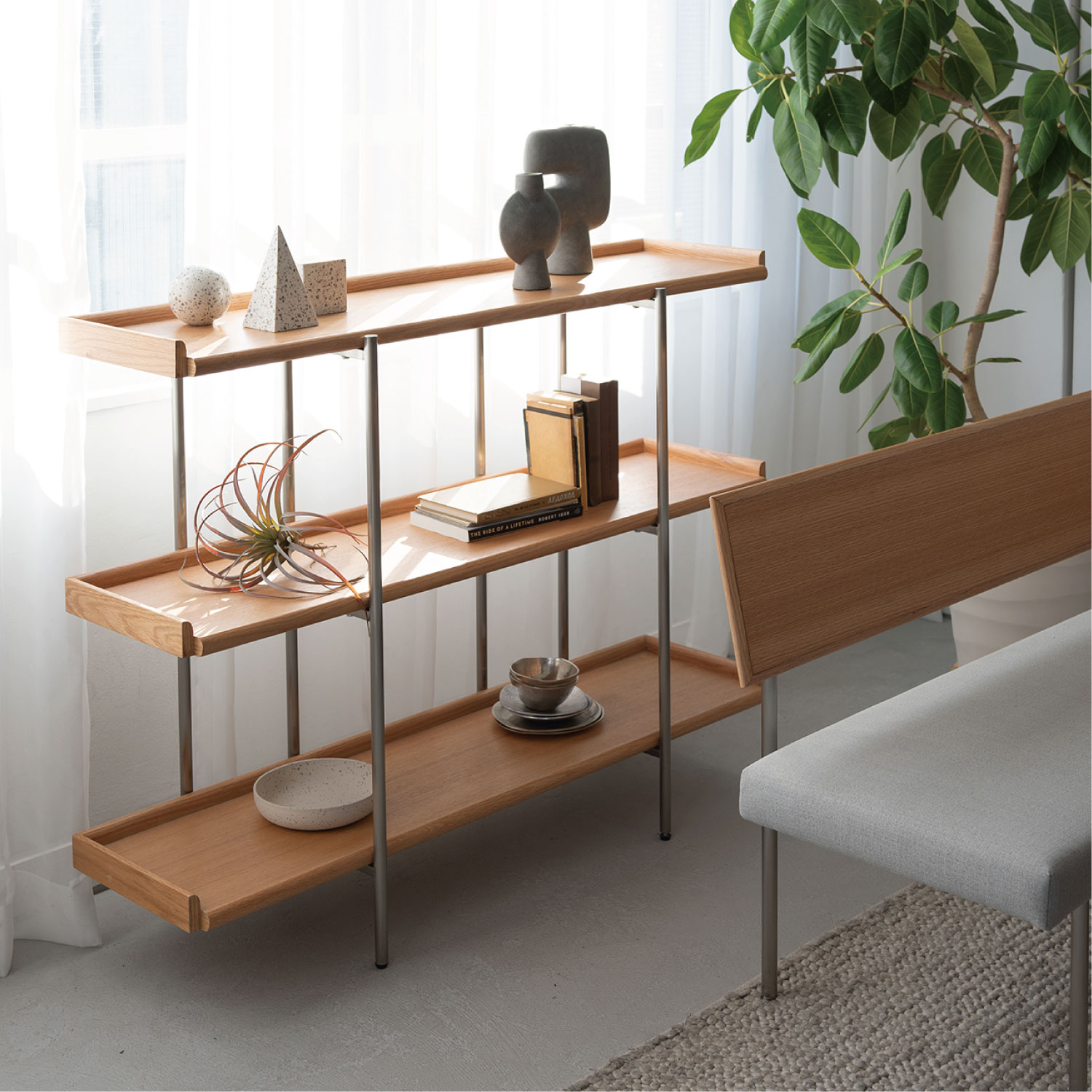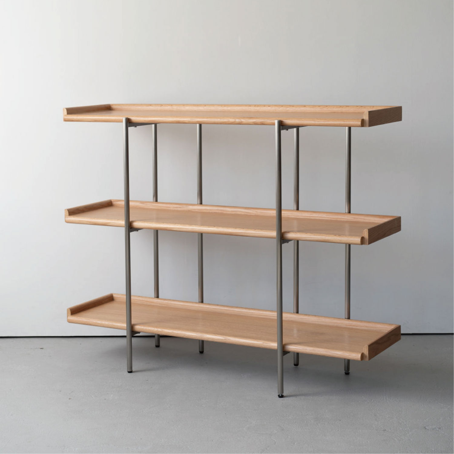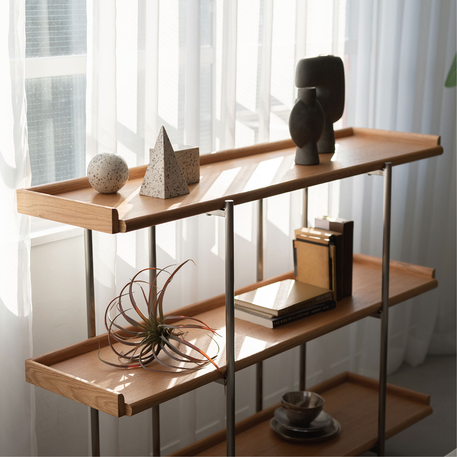 シンプルなオーク材のシェルフ。ヘアライン仕上げのステンレスフレームとのコントラストが美しく、ナチュラルで軽やかさのある佇まいです。書類や小物を収納したり、オブジェを置いたり、自由にお使いいただけます。