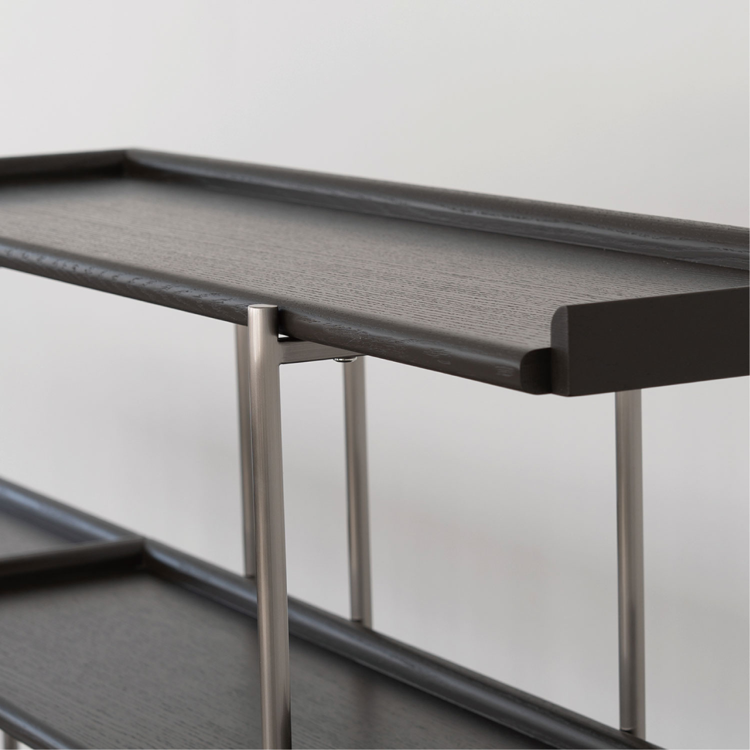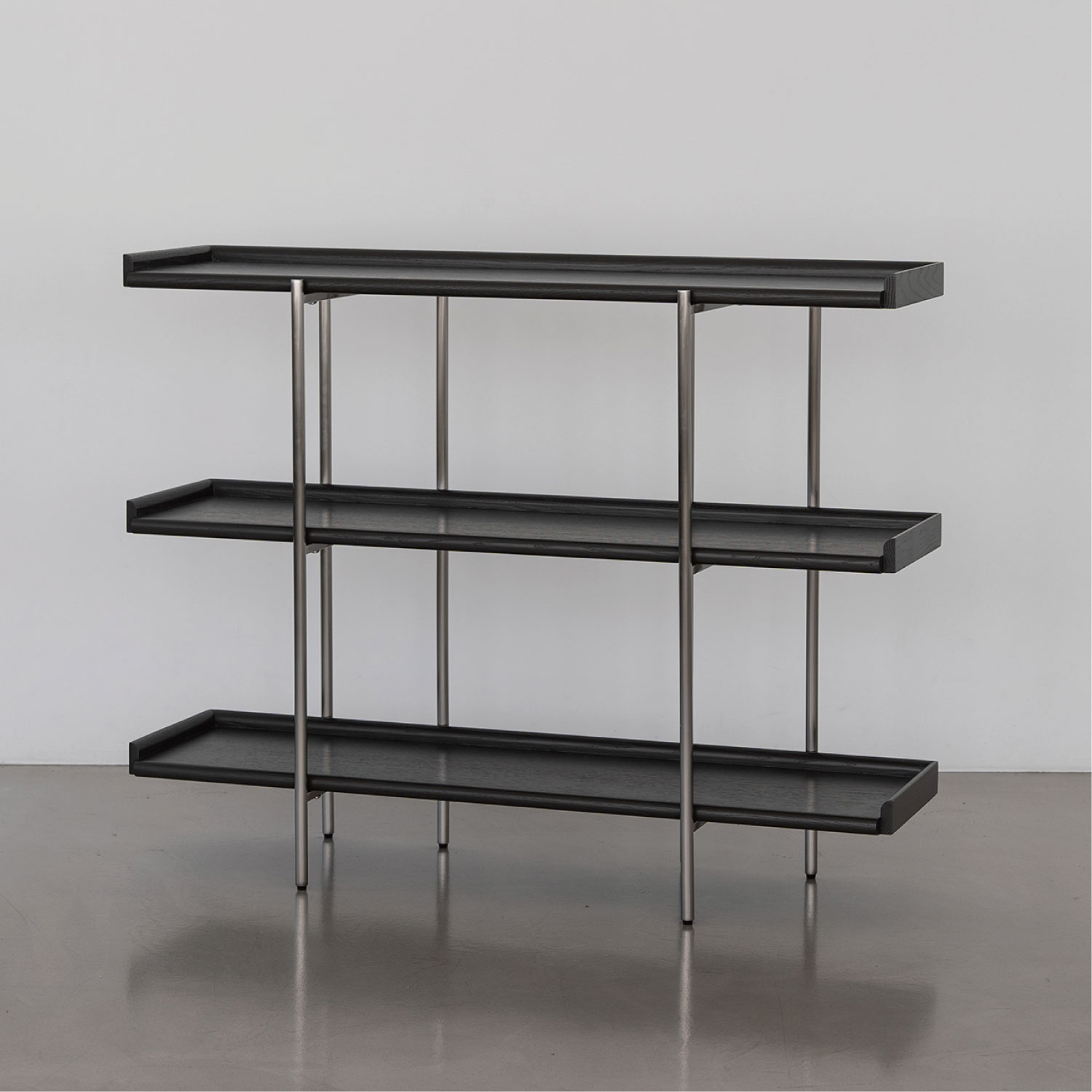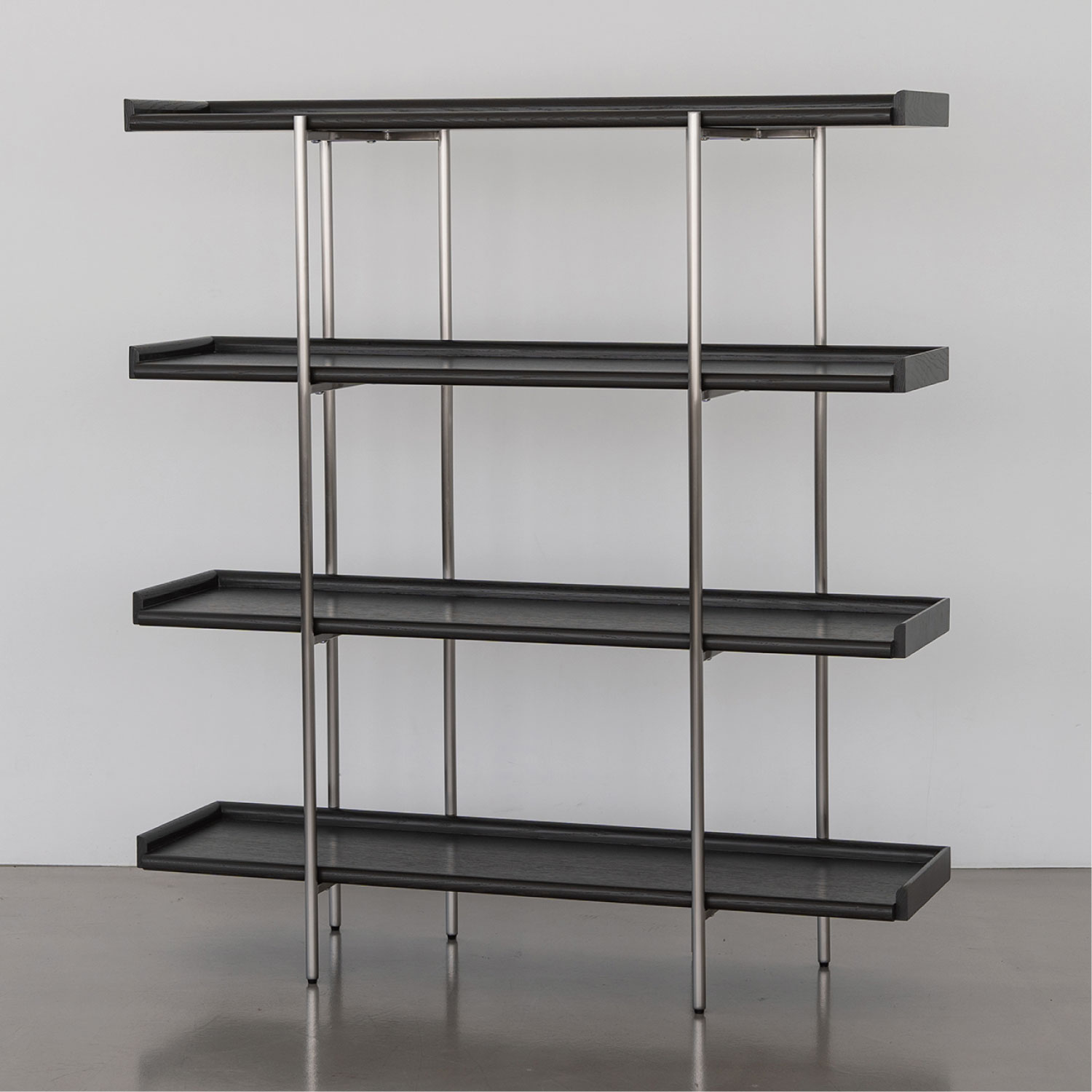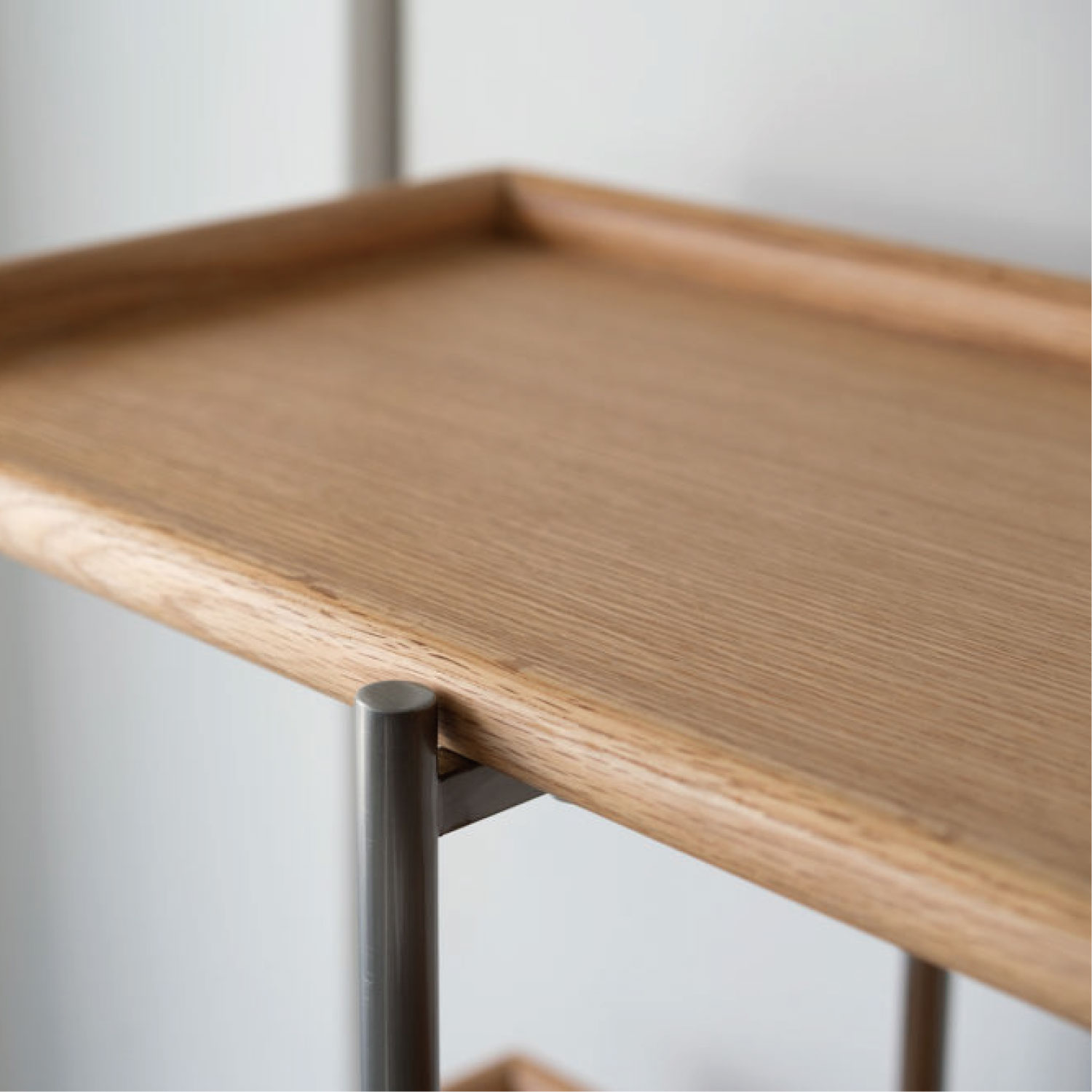 シンプルなオーク材のシェルフ。ヘアライン仕上げのステンレスフレームとのコントラストが美しく、ナチュラルで軽やかさのある佇まいです。書類や小物を収納したり、オブジェを置いたり、自由にお使いいただけます。
