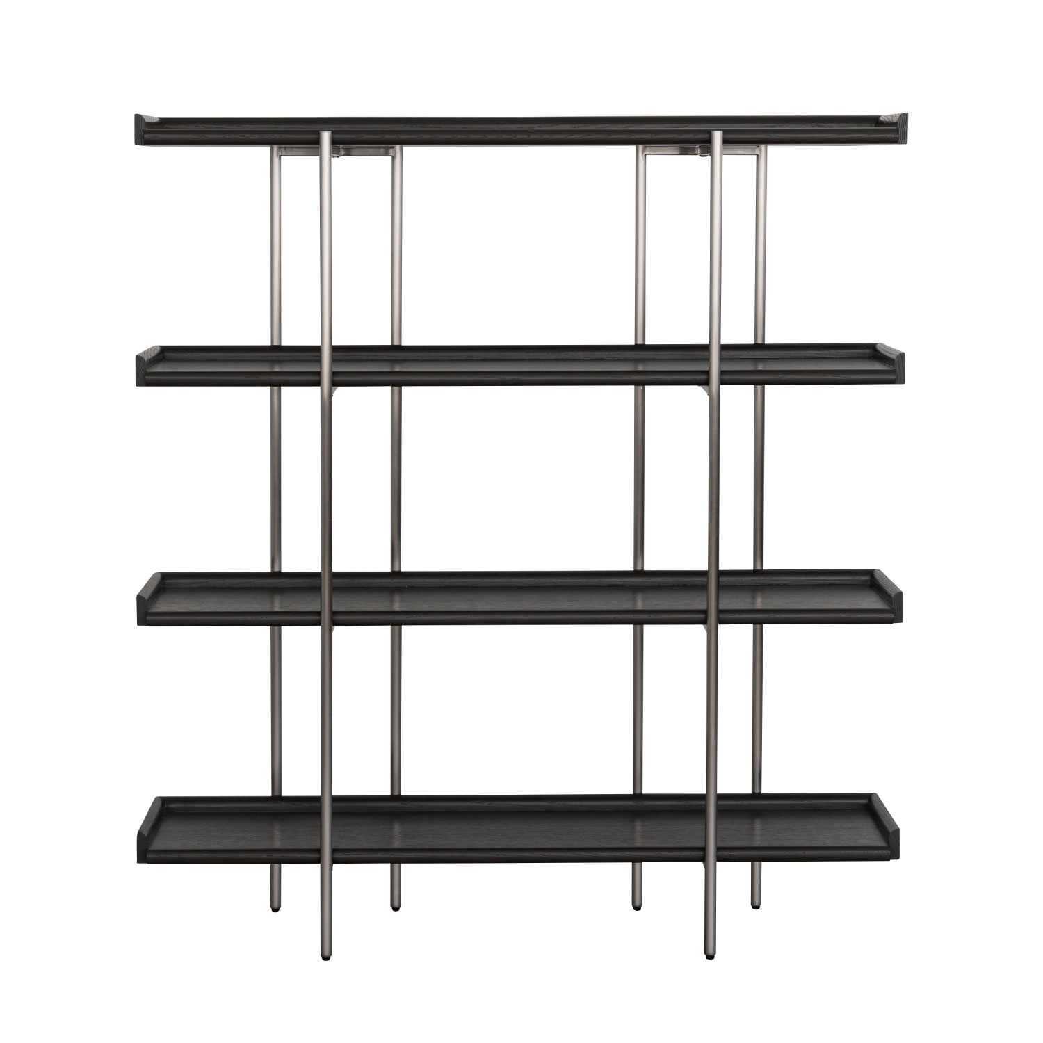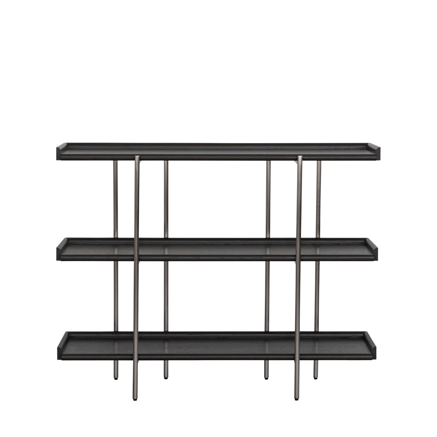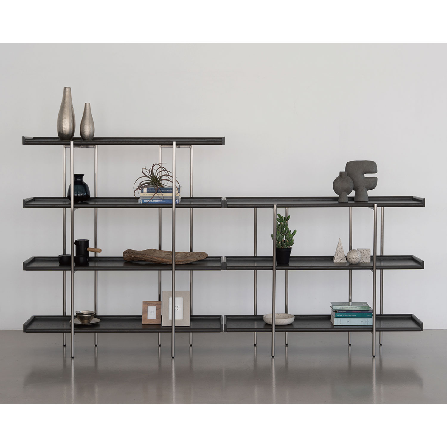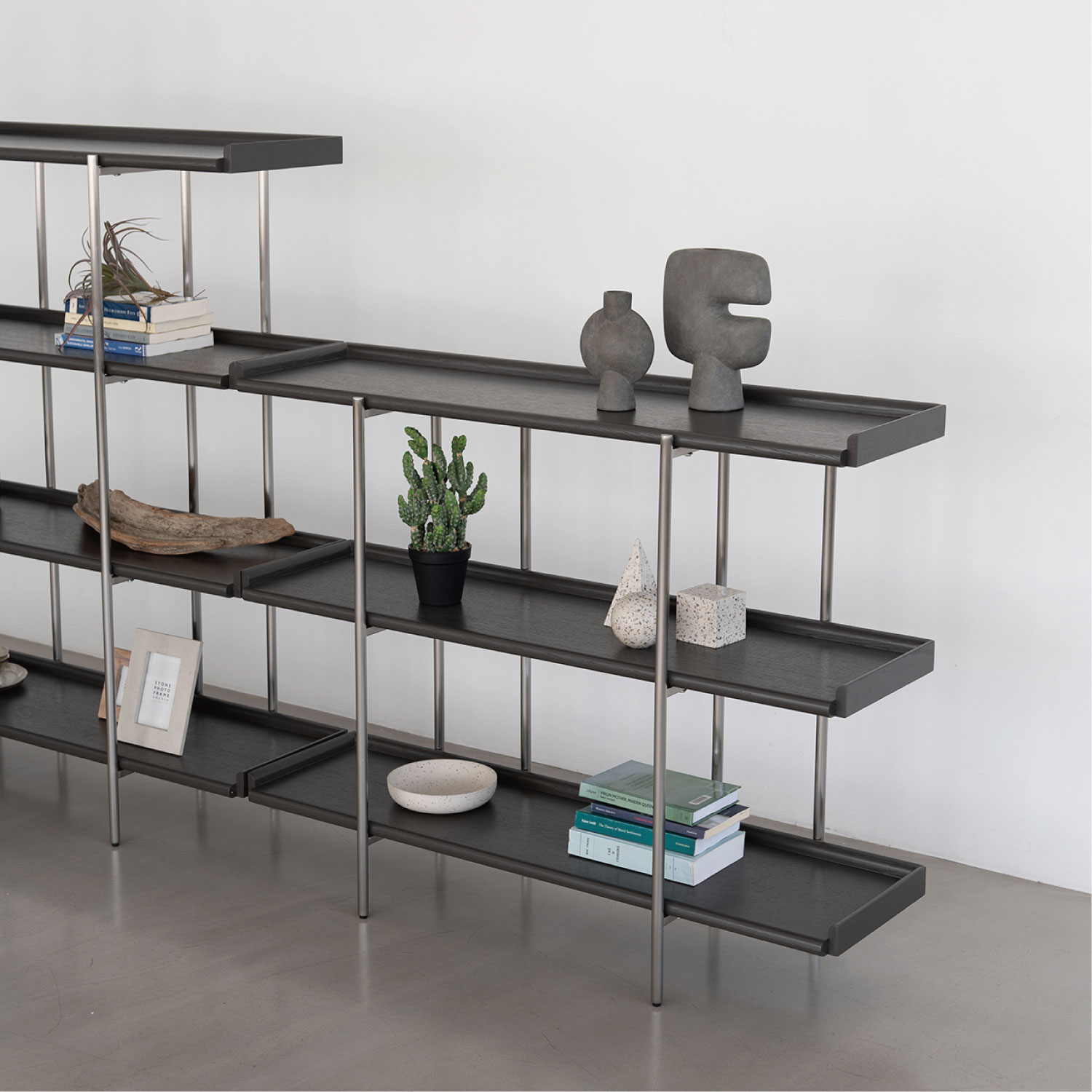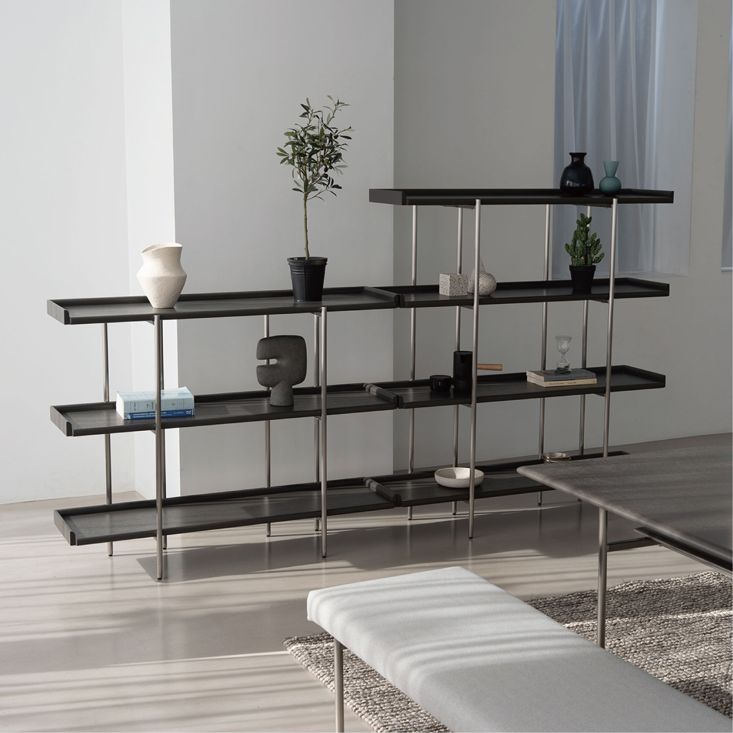 シンプルなオーク材のシェルフ。ヘアライン仕上げのステンレスフレームとのコントラストが美しく、ナチュラルで軽やかさのある佇まいです。書類や小物を収納したり、オブジェを置いたり、自由にお使いいただけます。