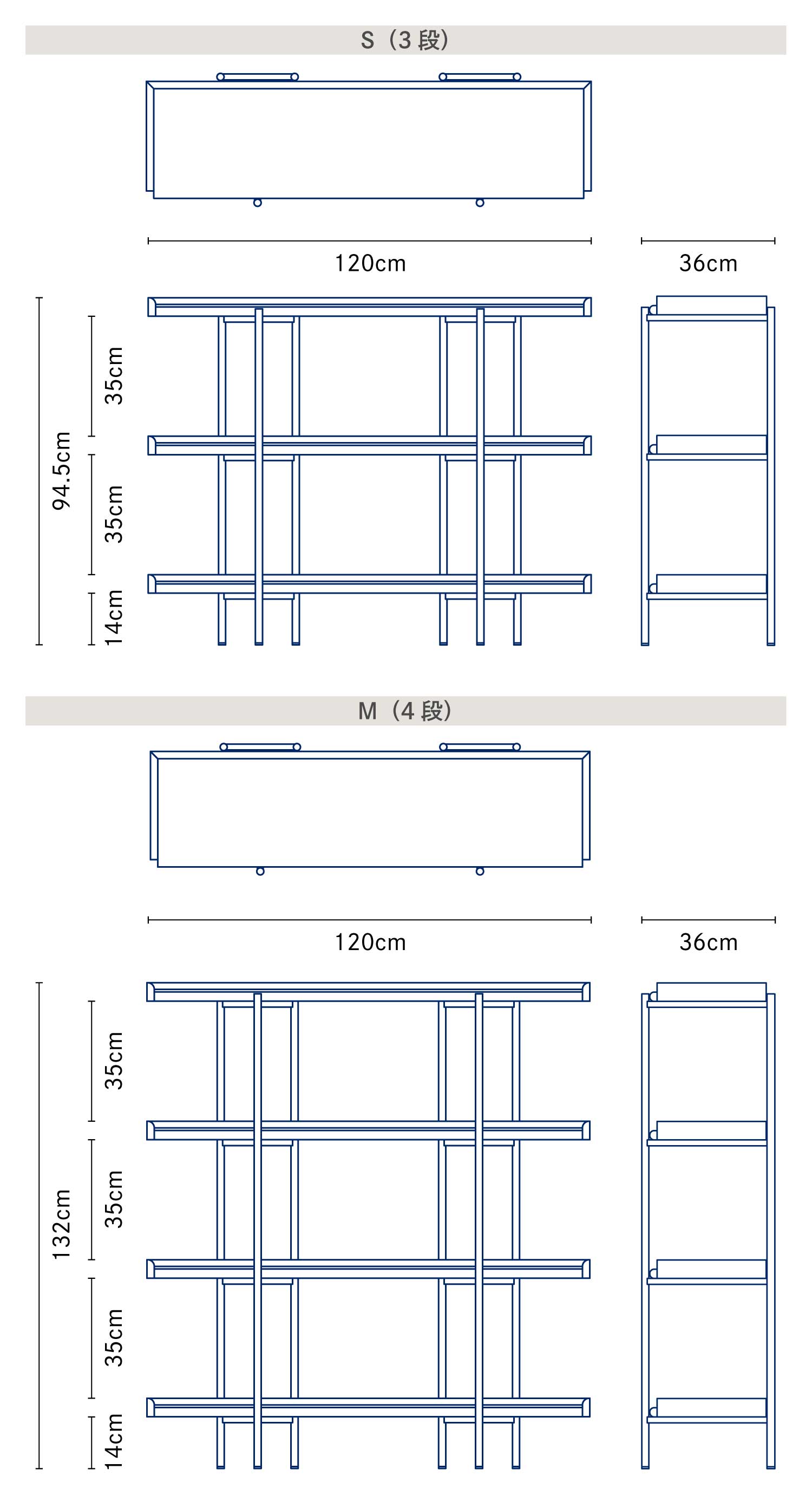 | サイズ | S(3段):W120 × D36 × H94.5cm M(4段):W120 × D36 × H132cm |