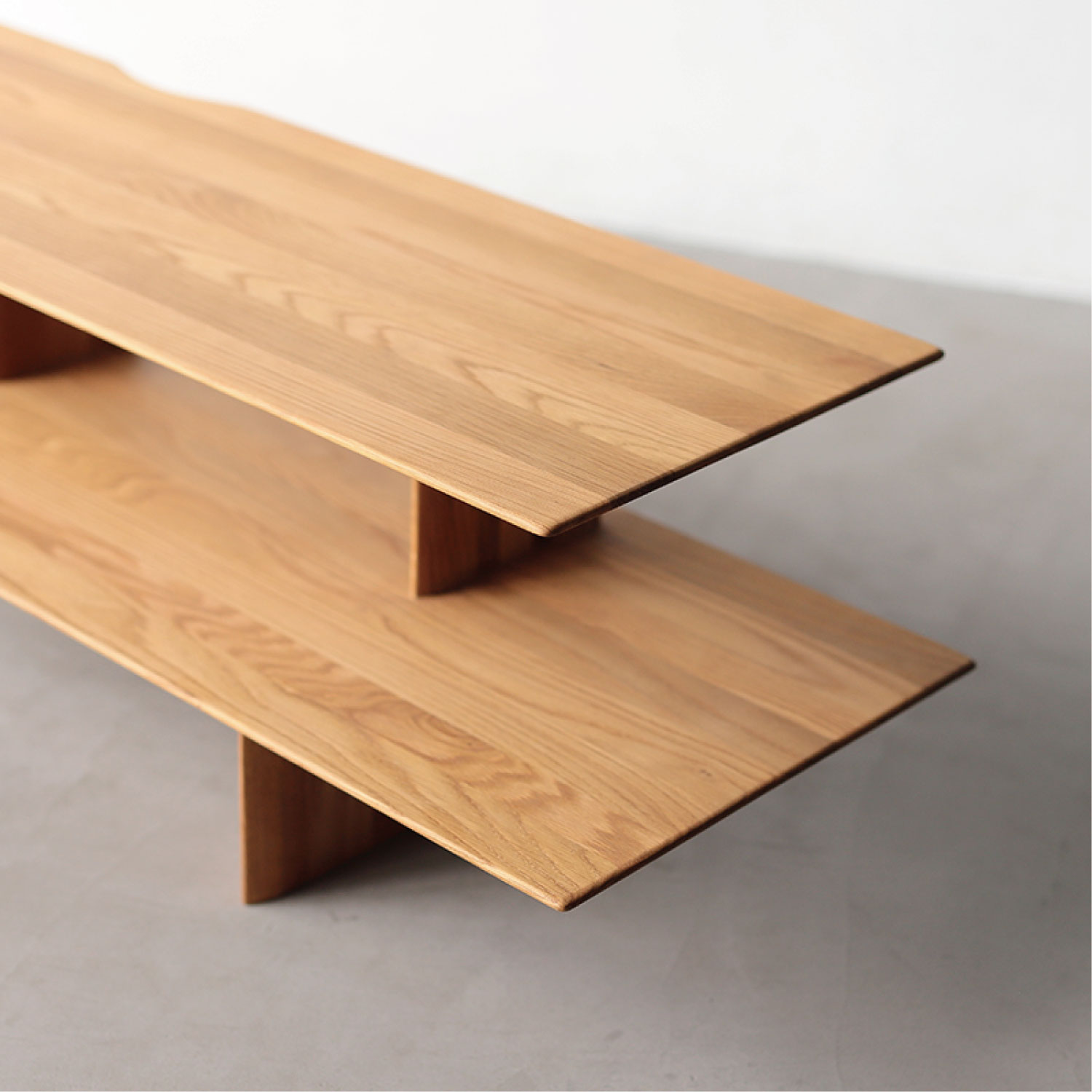 板で構成されたシェルフタイプのローボード。贅沢に使用した無垢板を、繊細なラインに仕上げています。モダンスタイルにも、和モダンスタイルにも馴染むシンプルなデザインです。