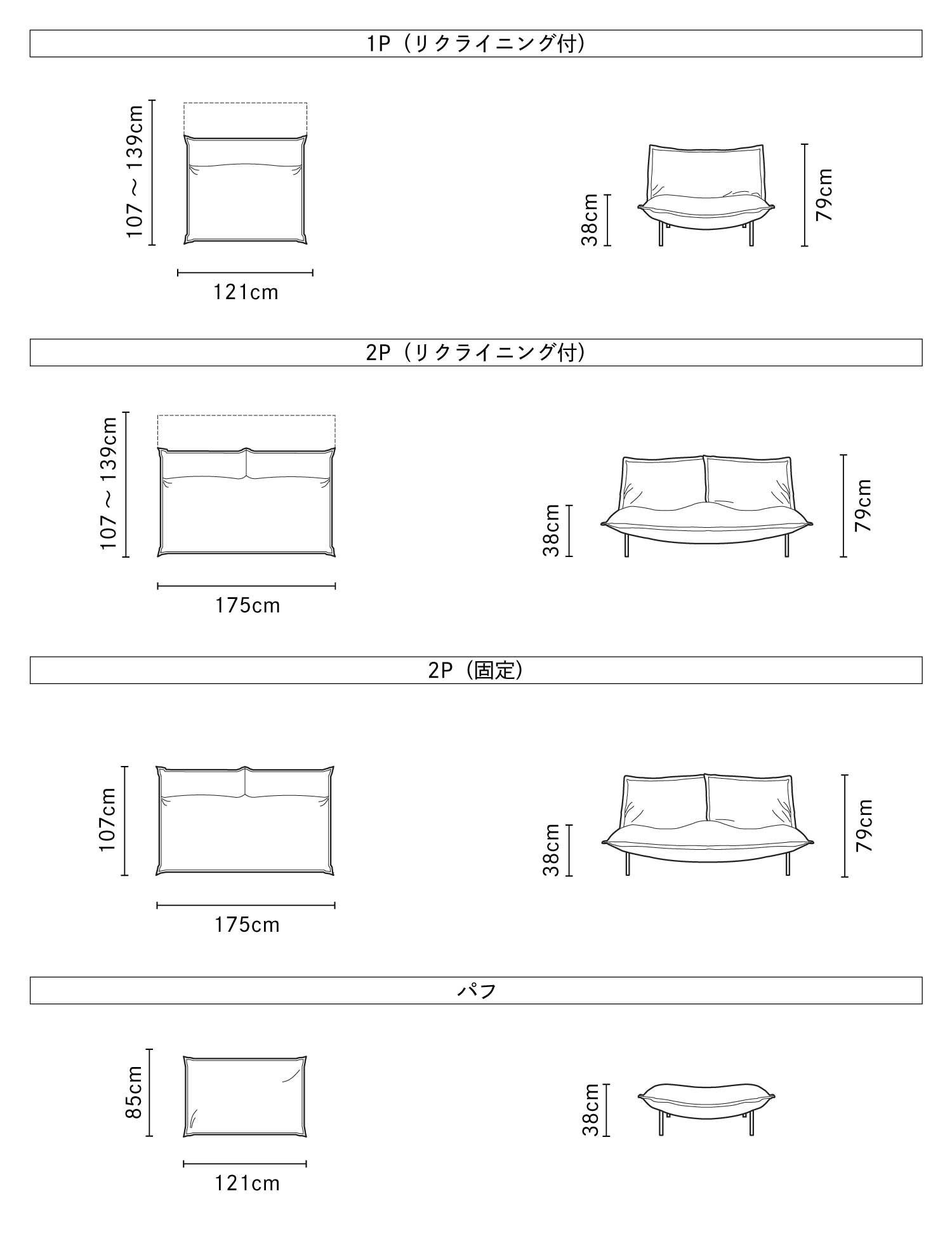 サイズ | 1P(リクライニング付):W121 × D107~139 × H79cm | SH38cm 2P(リクライニング付):W175 × D107~139 × H79cm | SH38cm 2P(固定):W175 × D107 × H79cm | SH38cm パフ:W121 × D85 × H38cm | SH38cm |