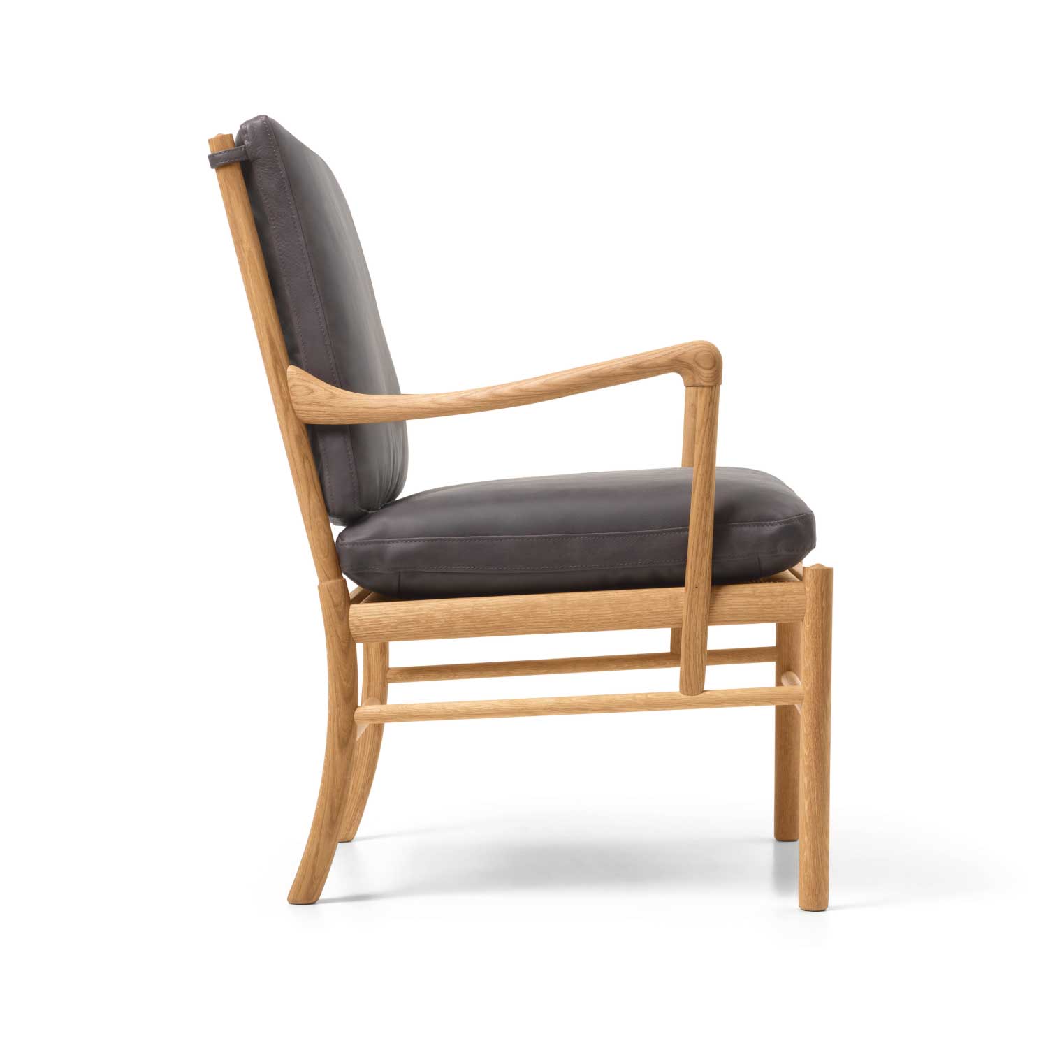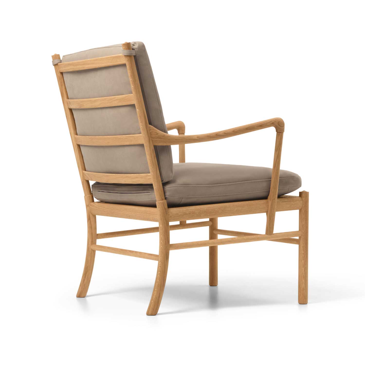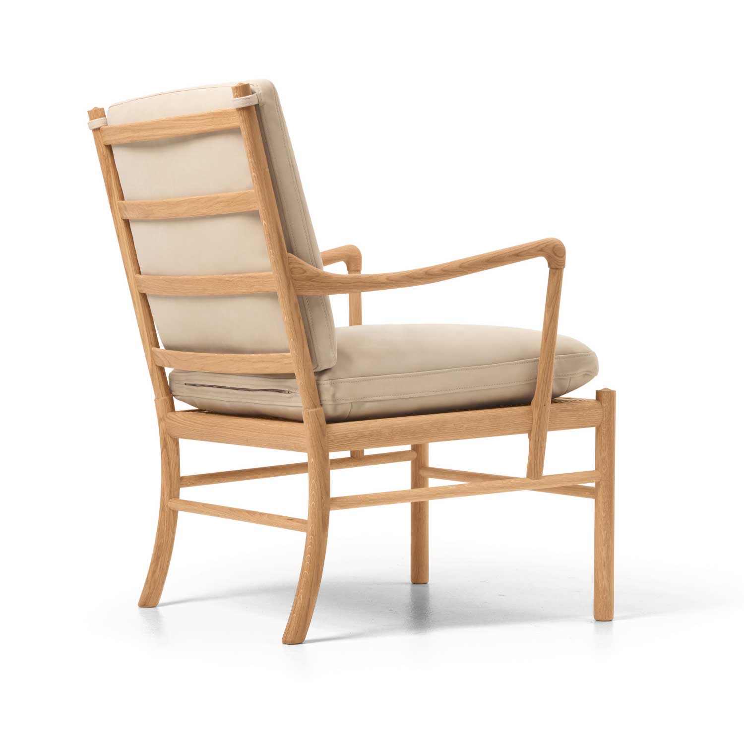ミニマリスト、機能主義者と評価されるオーレ・ヴァンシャー、そのデザインには、洗練された細いラインが多く見られます。コロニアルチェアもその一つ。細く優雅なフレームですが、考え抜かれた構造により、優れた強度を創りだしています。洗練された曲線を描く特徴的なアーム。先端で真下にカーブさせる、ヴァンシャーらしい意匠となっています。丸棒状の前脚と後ろ脚。後ろ脚を若干カーブさせることによって、椅子に安定性を与え、優雅な傾斜のあるシルエットを創り上げています。