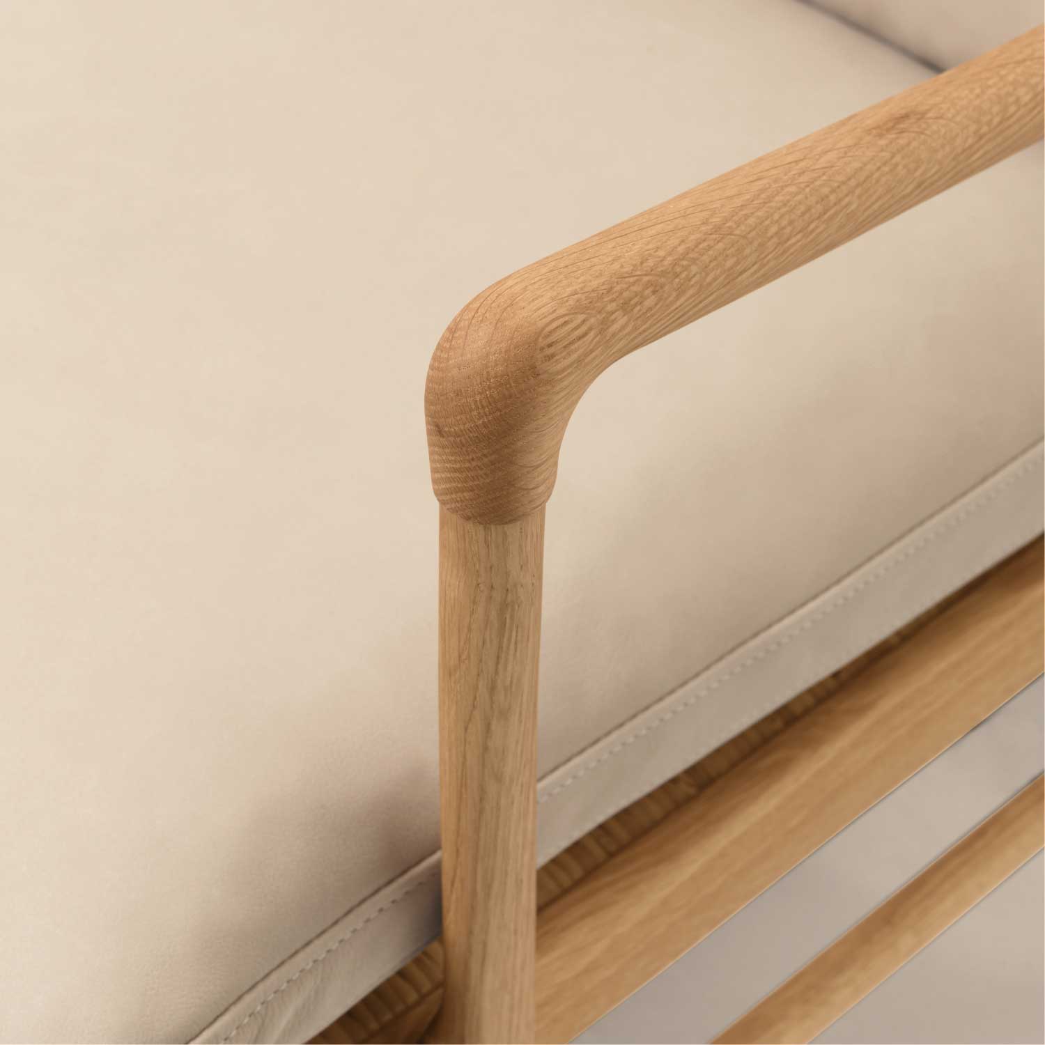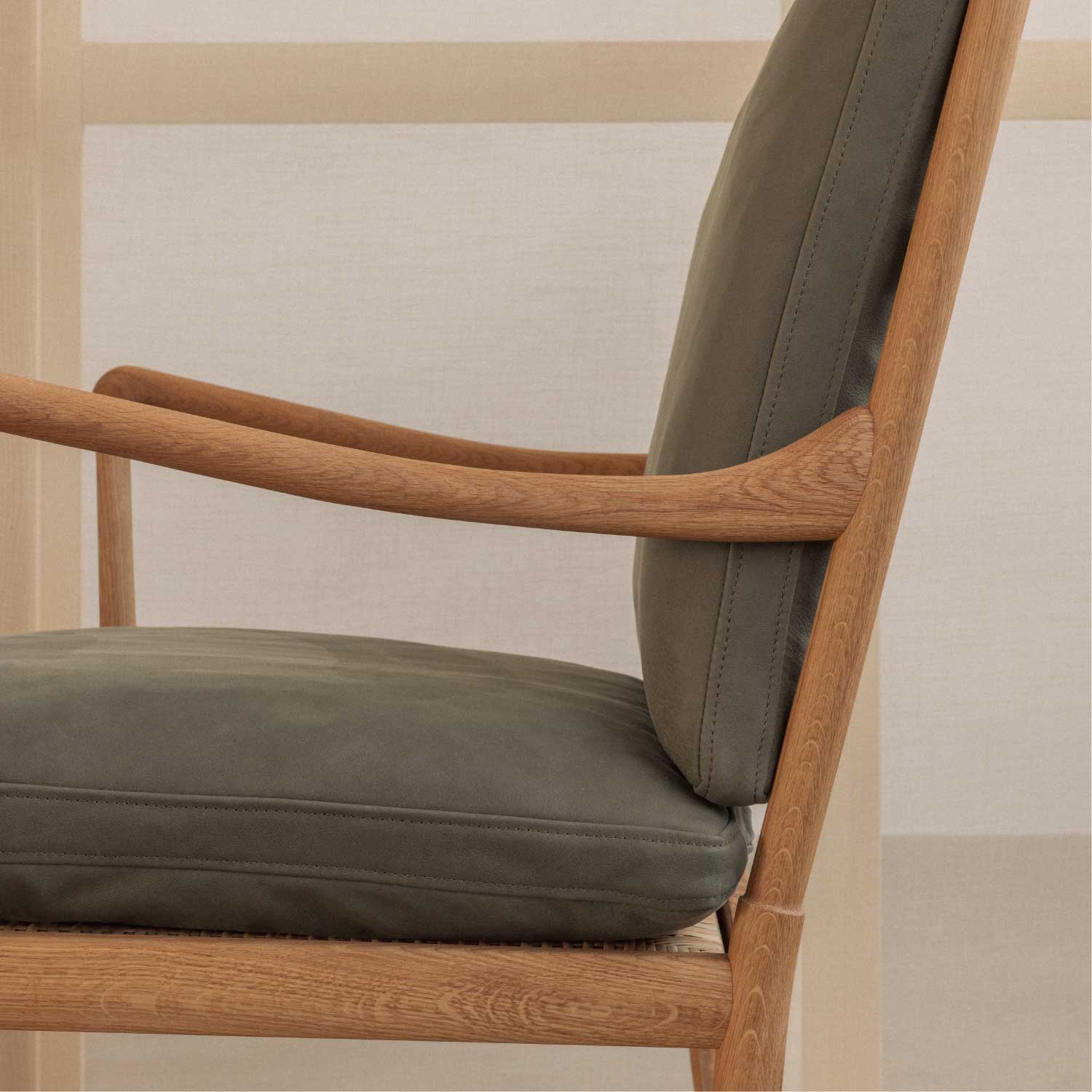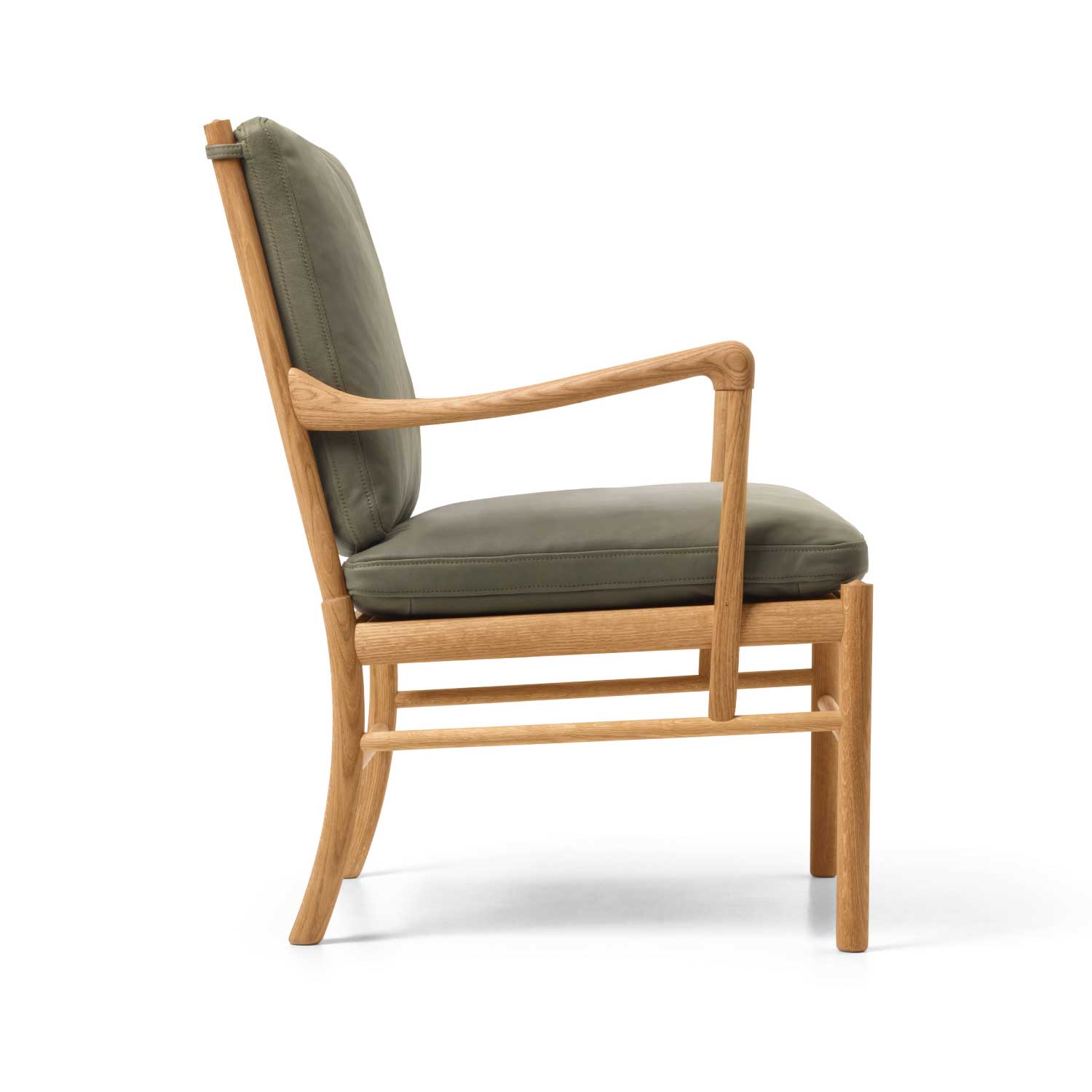ミニマリスト、機能主義者と評価されるオーレ・ヴァンシャー、そのデザインには、洗練された細いラインが多く見られます。コロニアルチェアもその一つ。細く優雅なフレームですが、考え抜かれた構造により、優れた強度を創りだしています。洗練された曲線を描く特徴的なアーム。先端で真下にカーブさせる、ヴァンシャーらしい意匠となっています。丸棒状の前脚と後ろ脚。後ろ脚を若干カーブさせることによって、椅子に安定性を与え、優雅な傾斜のあるシルエットを創り上げています。