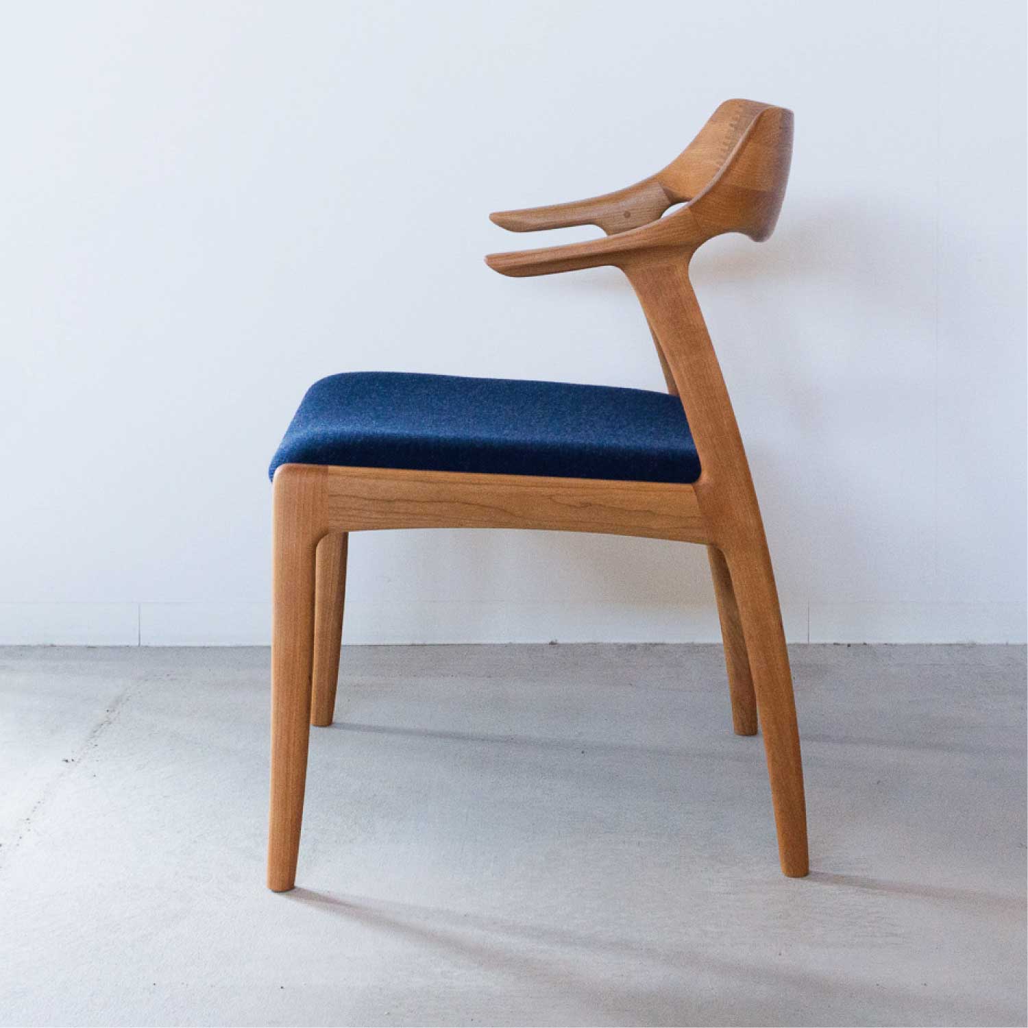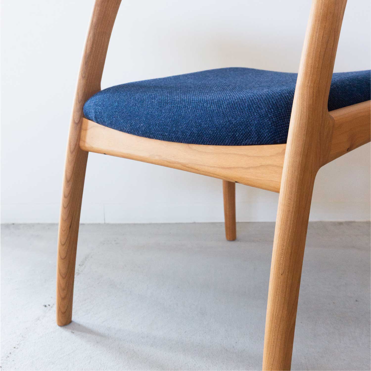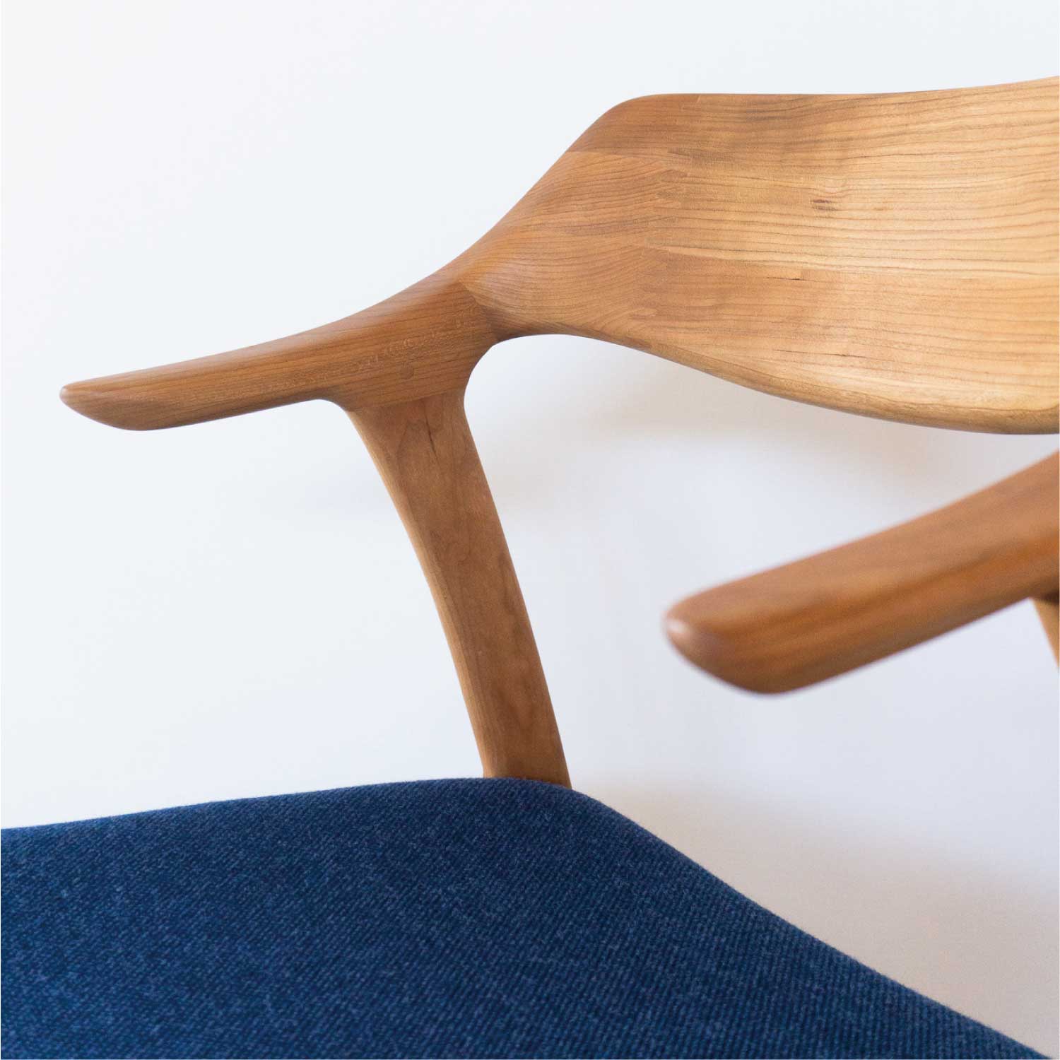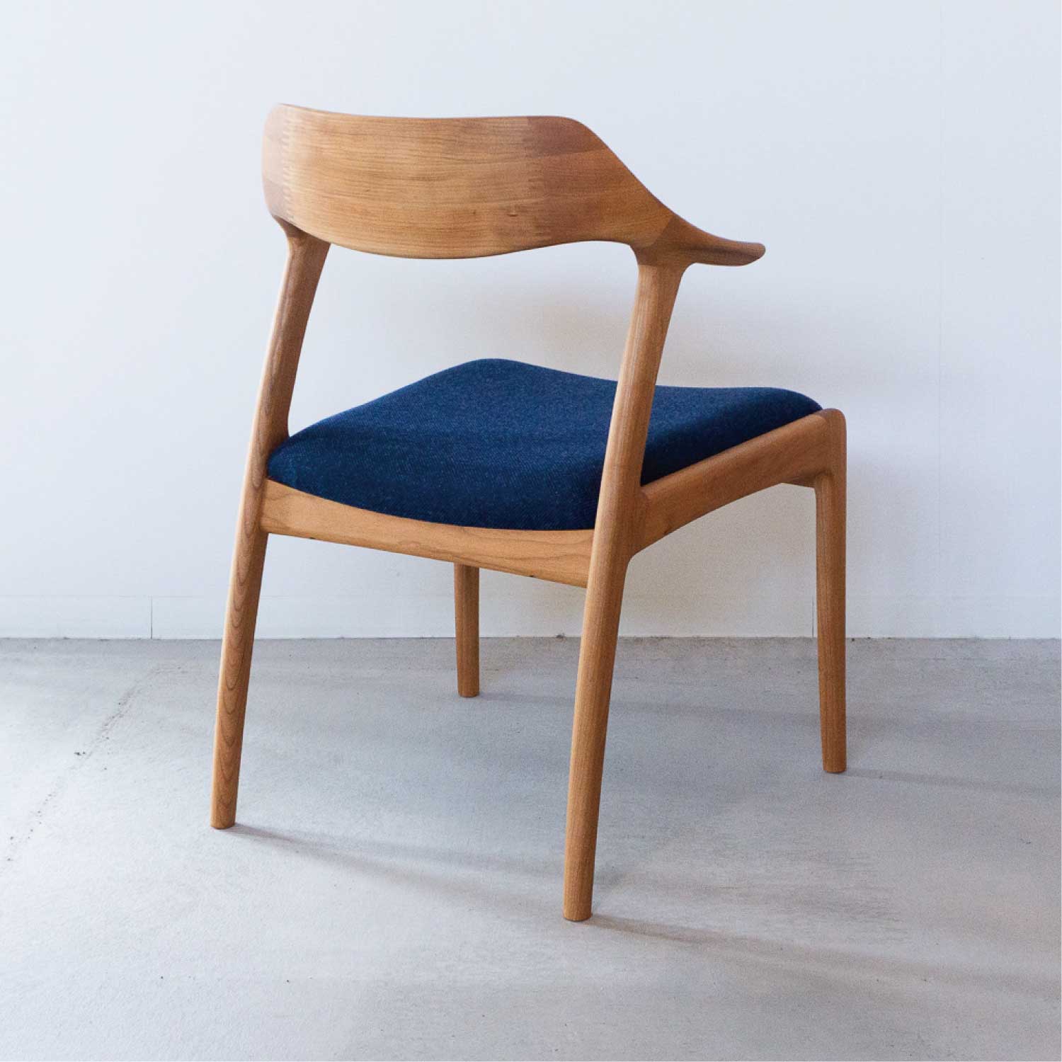 肘から幅広の背に掛けて、ムク材を削り出し一体化したウッディな<ワープ>チェアのセミアームタイプです。柔らかな曲線と大きな面取りによる優しい手触り。カーブの付いた座と幅広の背板がゆったりと身体を支えます。肘をテーブルに掛ければ、お掃除も楽々。材は4種類が用意され、張り地もいろいろと揃えられています。