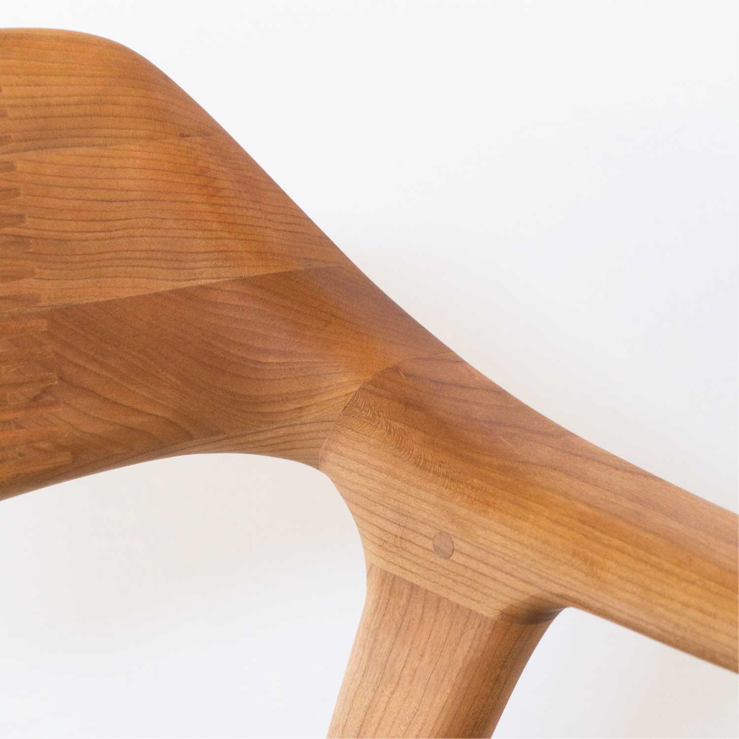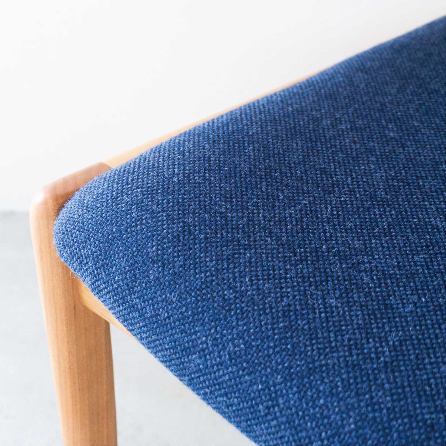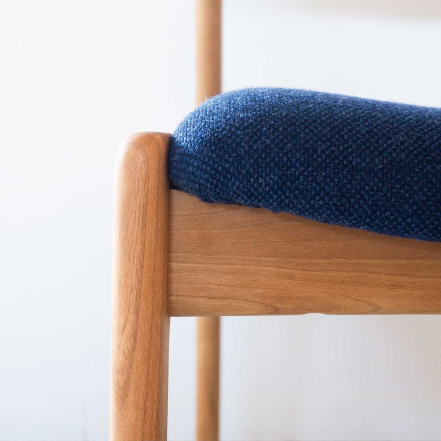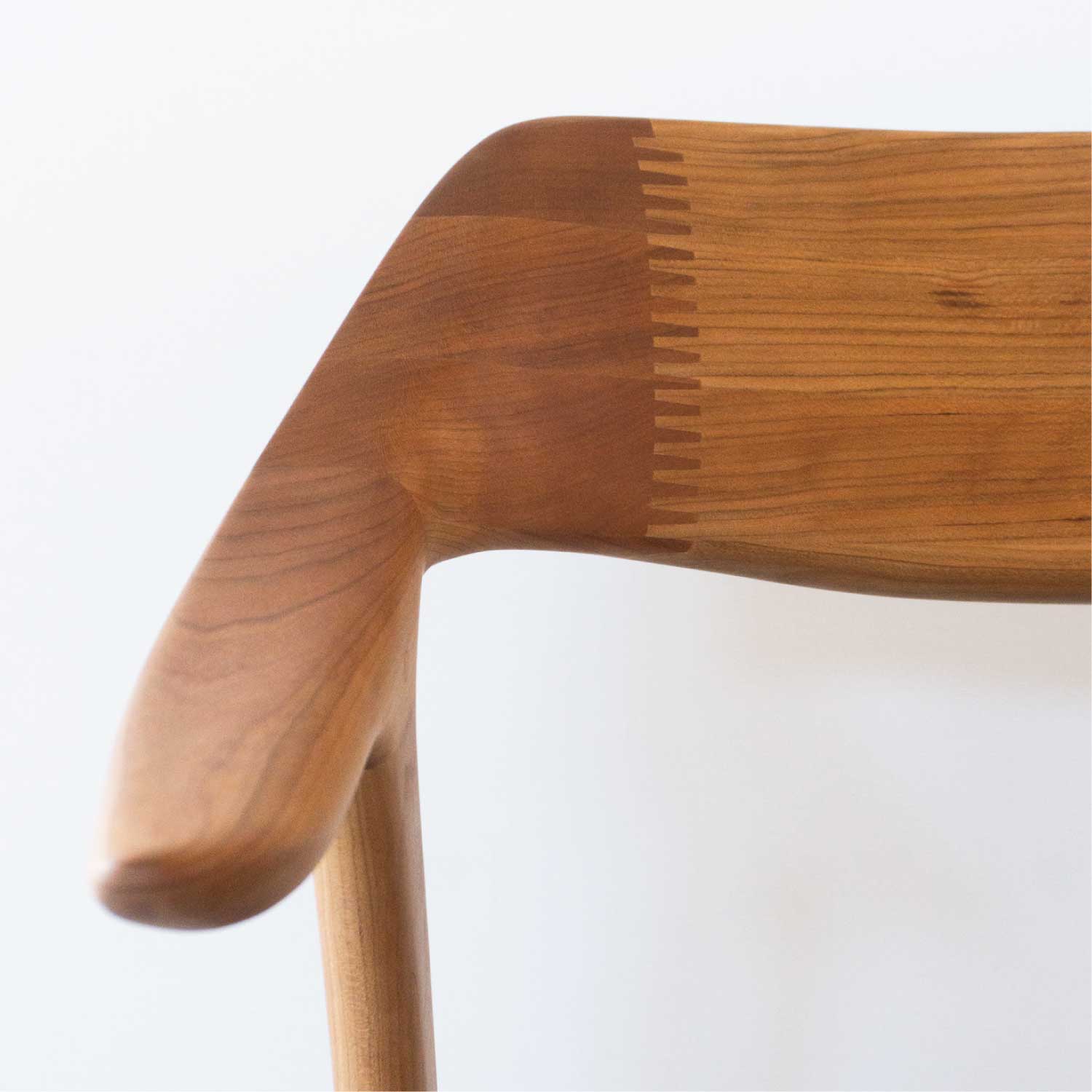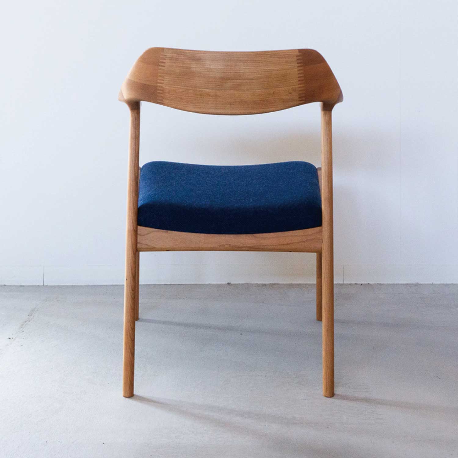 肘から幅広の背に掛けて、ムク材を削り出し一体化したウッディな<ワープ>チェアのセミアームタイプです。柔らかな曲線と大きな面取りによる優しい手触り。カーブの付いた座と幅広の背板がゆったりと身体を支えます。肘をテーブルに掛ければ、お掃除も楽々。材は4種類が用意され、張り地もいろいろと揃えられています。