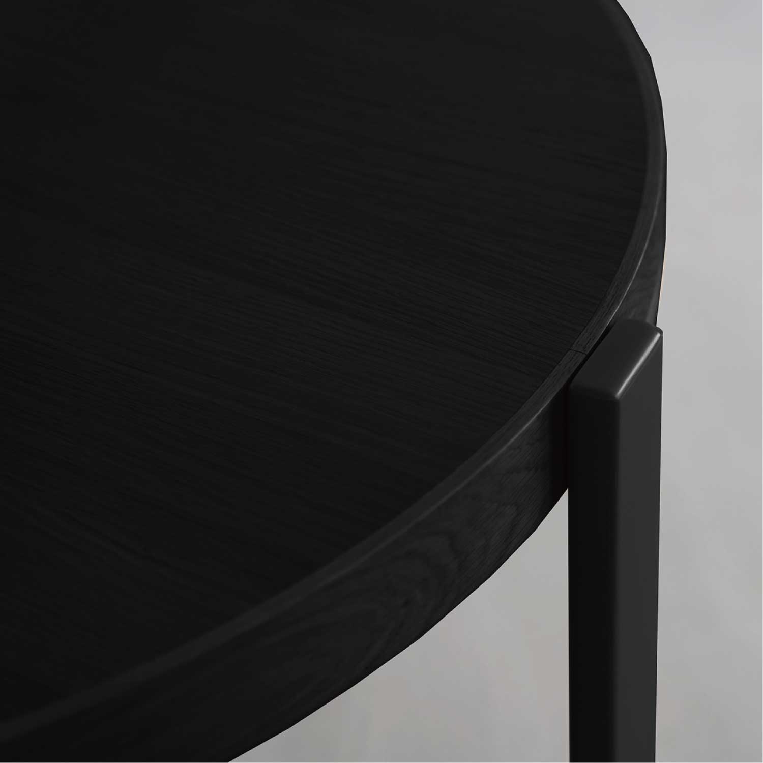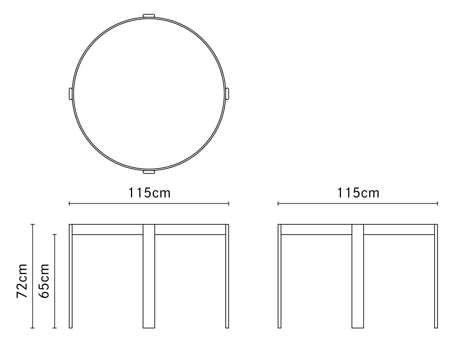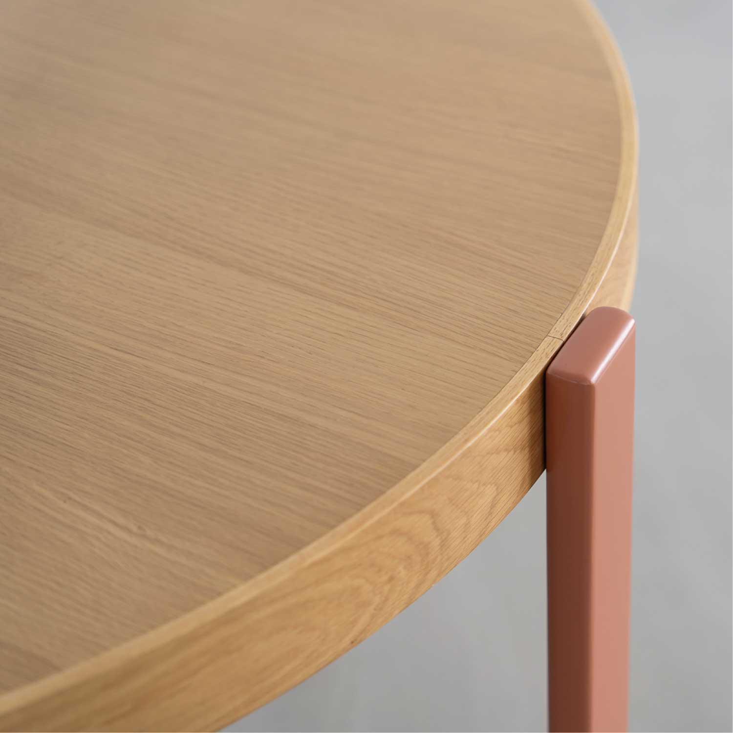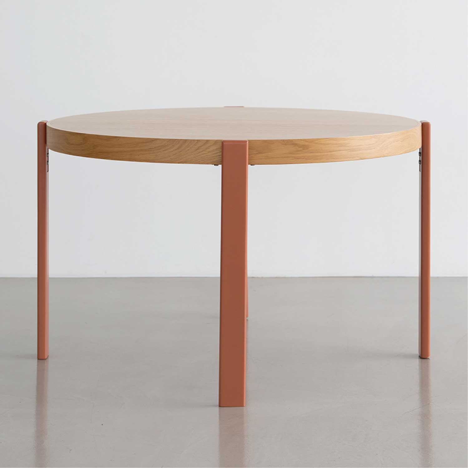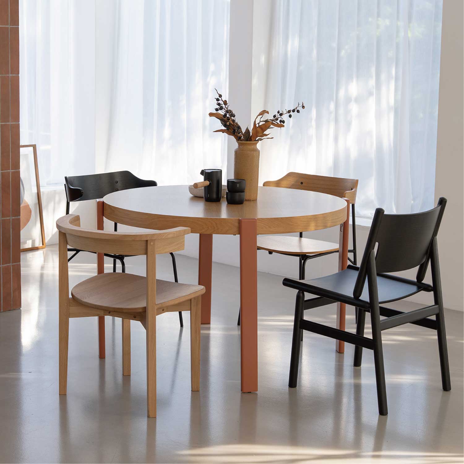 プライウッドで構成された厚みのある天板と、外側についたシンプルな脚が特徴の円形のダイニングテーブル。オーク色の脚には木とも馴染みの良いやや落ち着いたオレンジをセレクトしています。