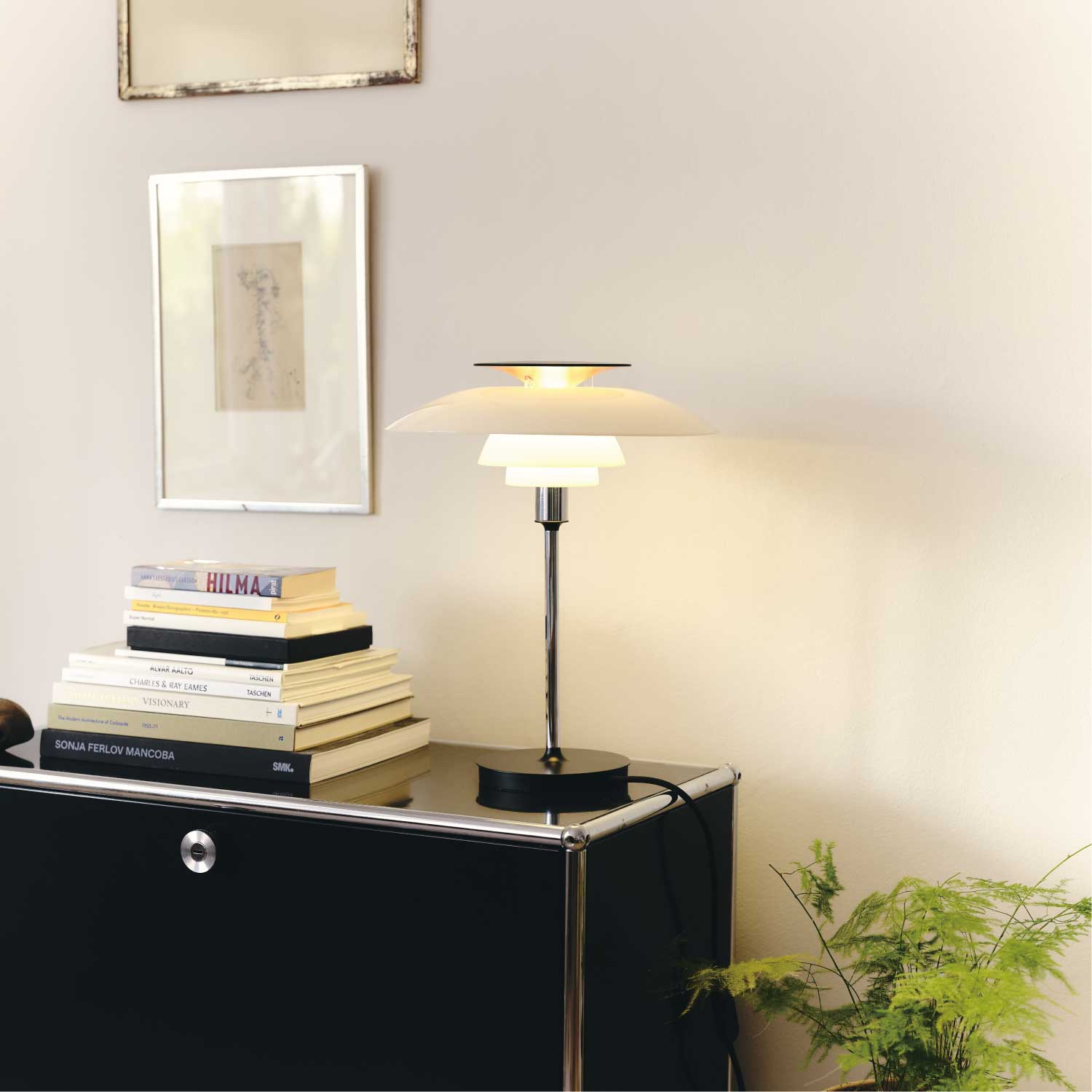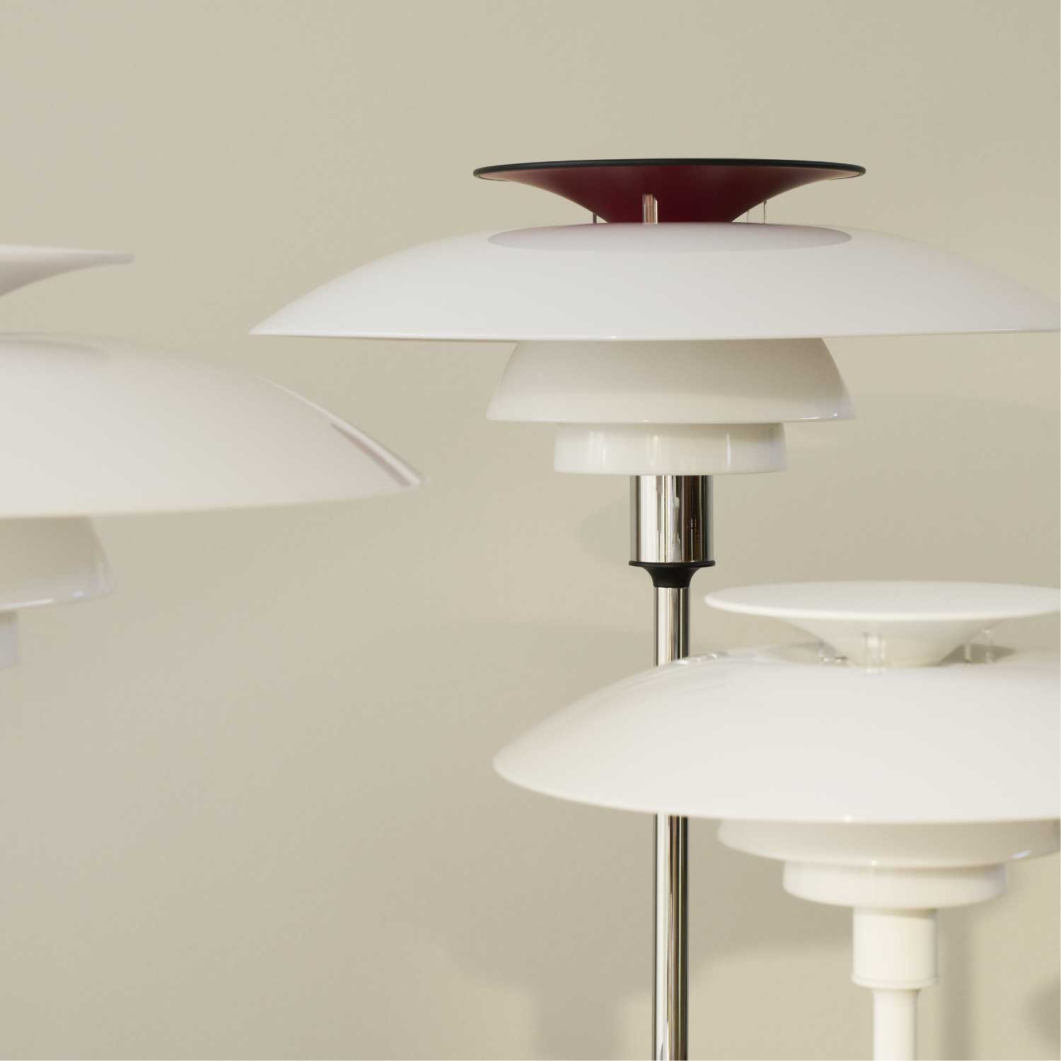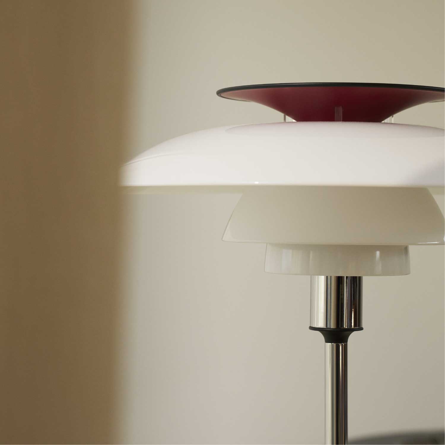 PH 80 テーブルランプは、拡散光と反射光を放ち、光の多くは下方に向けられます。乳白色のアクリルシェードは、快適なアンビエントライトを提供します。クロームメッキのタイプは、赤いトップ・リフレクターが光に暖かみを加えます。ホワイトタイプは、白いトップ・リフレクターがクリーンでエレガントな印象をもたらします。