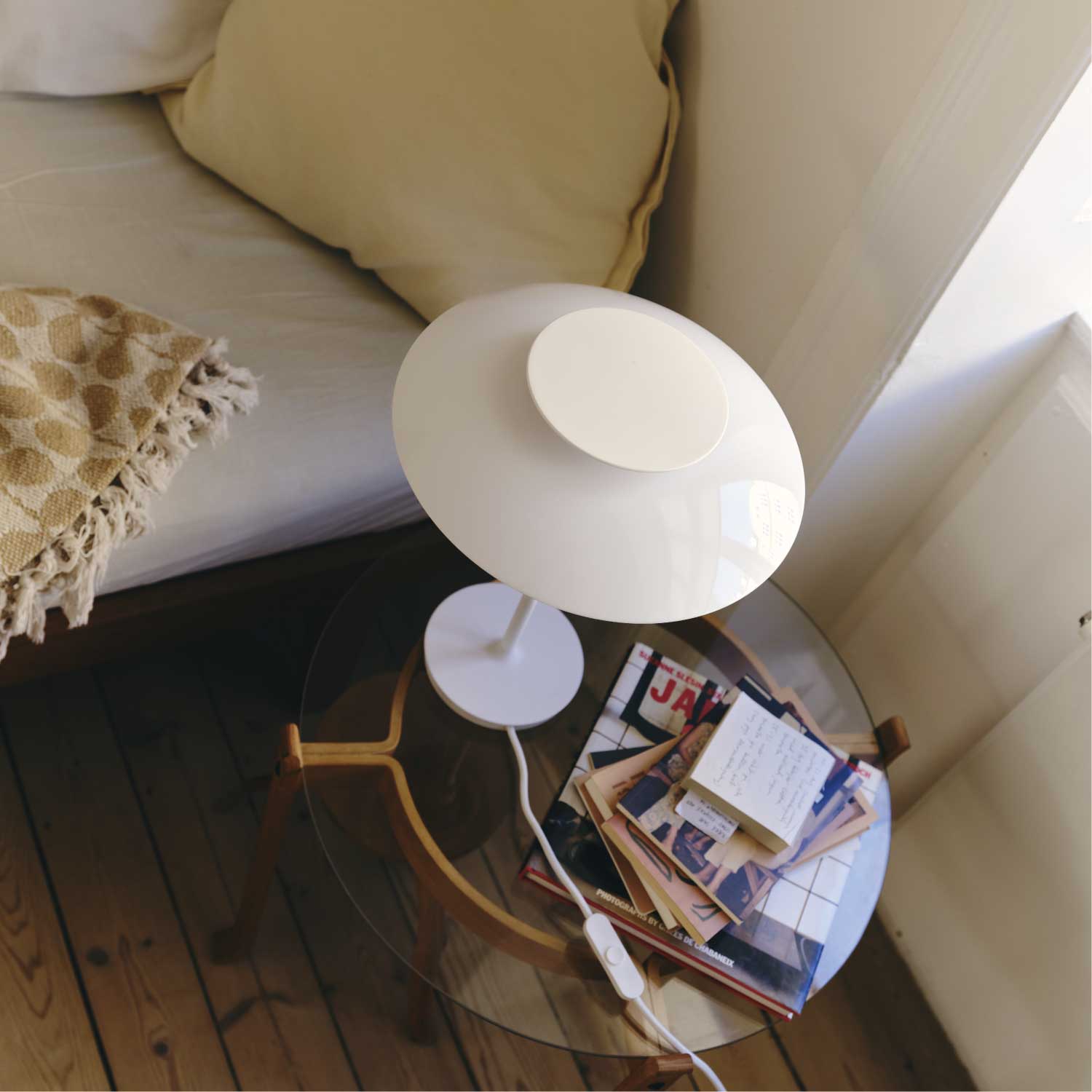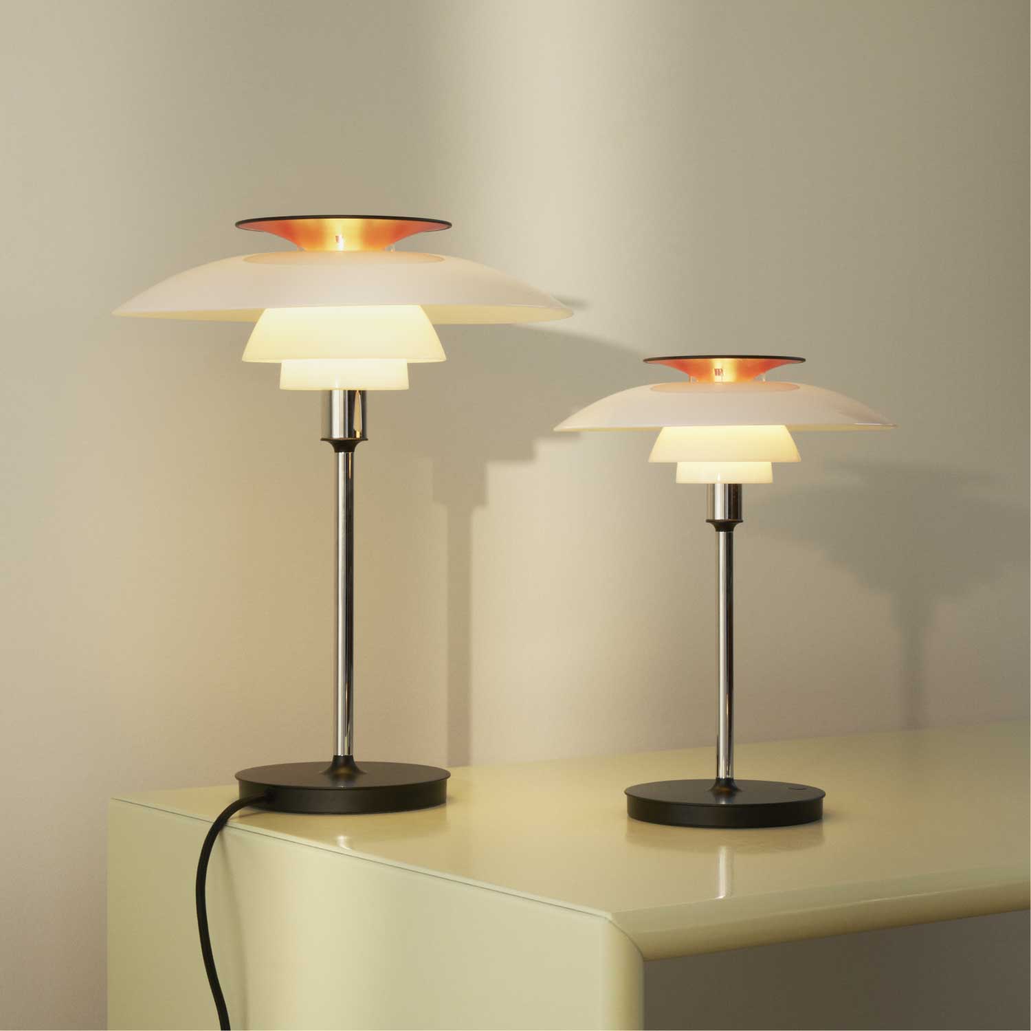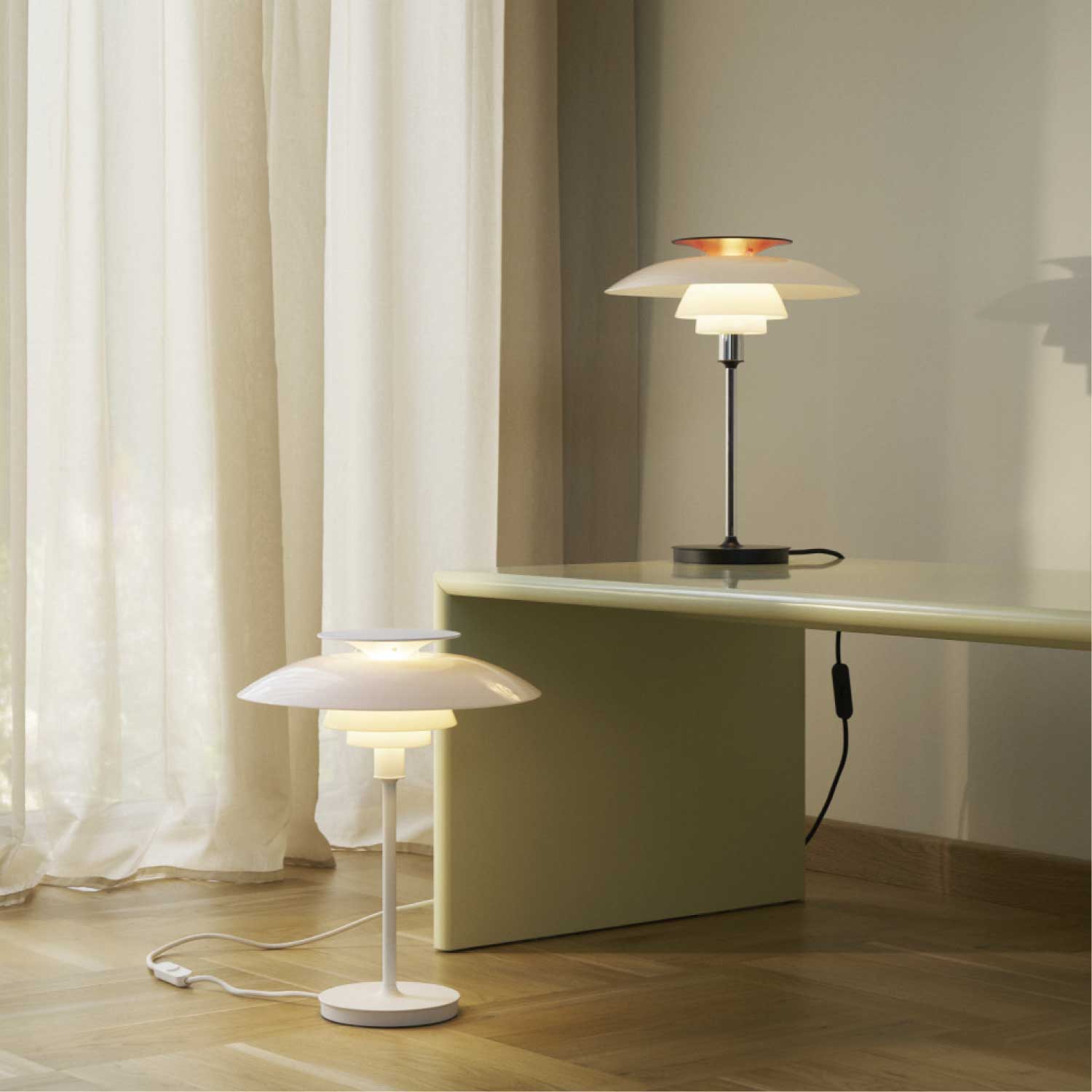 PH 80 テーブルランプは、拡散光と反射光を放ち、光の多くは下方に向けられます。乳白色のアクリルシェードは、快適なアンビエントライトを提供します。クロームメッキのタイプは、赤いトップ・リフレクターが光に暖かみを加えます。ホワイトタイプは、白いトップ・リフレクターがクリーンでエレガントな印象をもたらします。