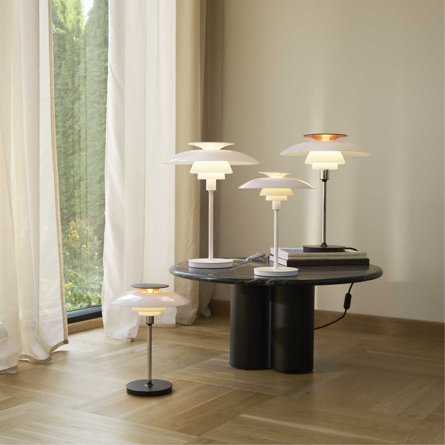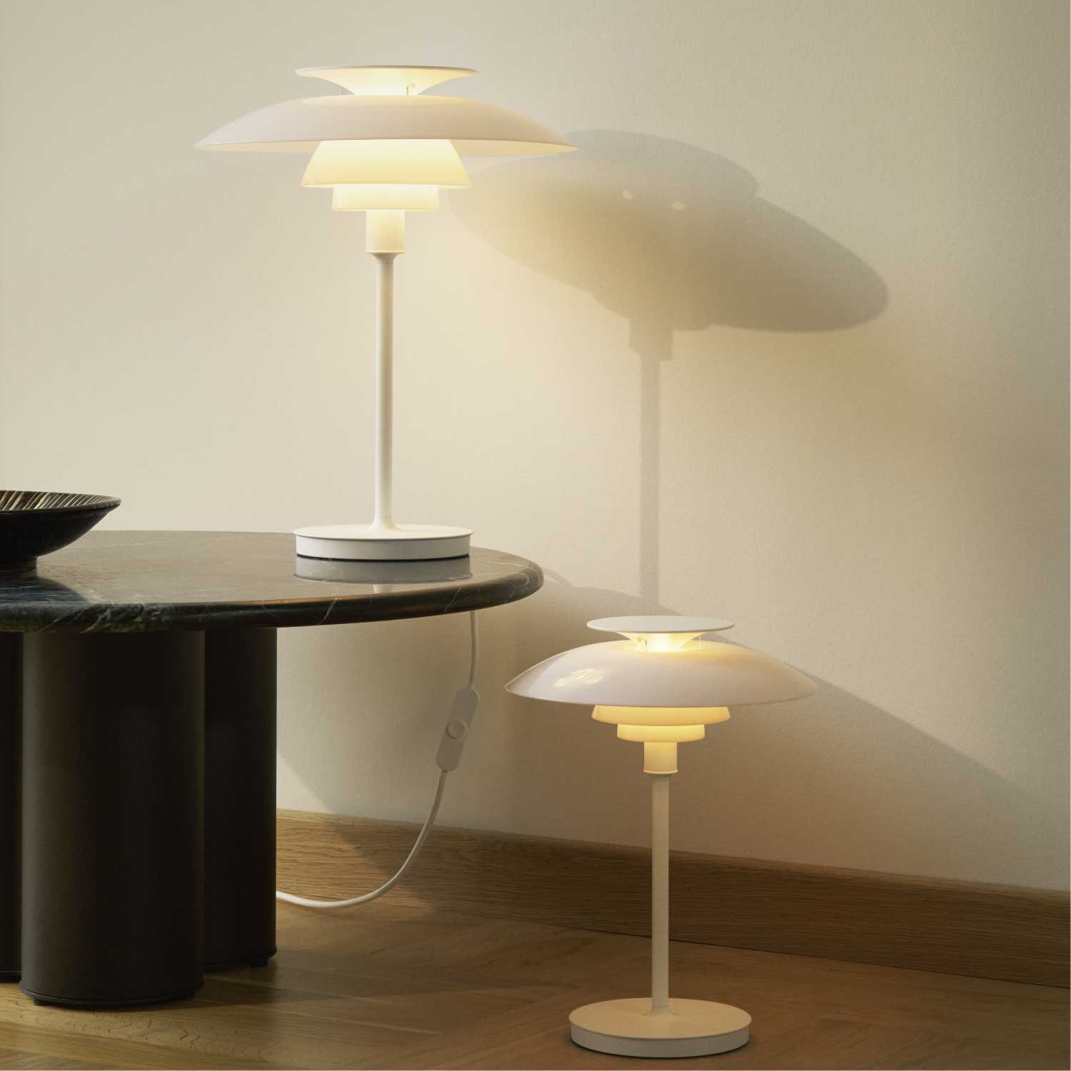 オリジナルのPH 80はヘニングセンの有名な「PHシリーズ」の一部であり、複数のシェードによってグレアのない照明を生みだす、彼のデザイン原理を継承しています。機能性と美しさを兼ね備えるPH 80 テーブルランプは暖かみのある拡散光を発し、住宅と建築施設の両方の環境で活躍します。