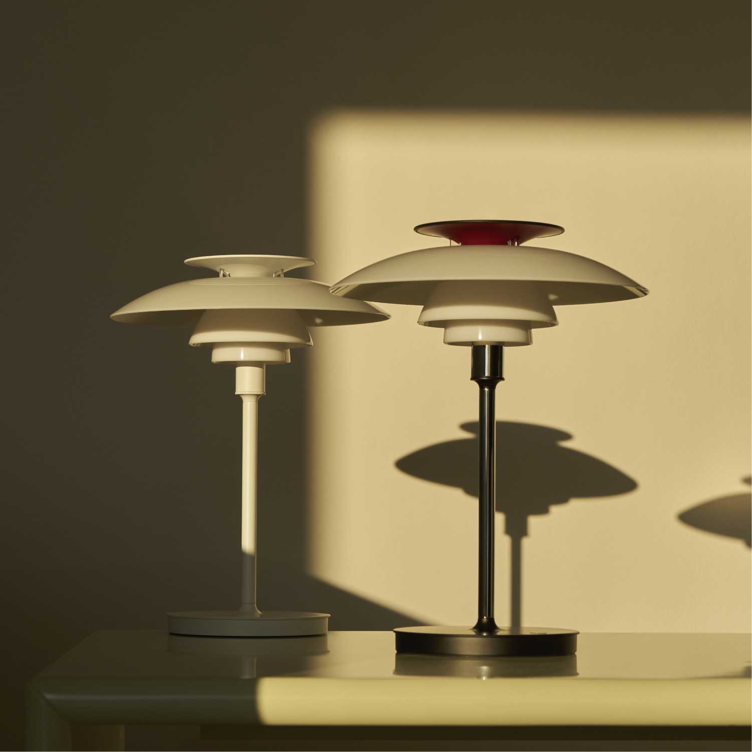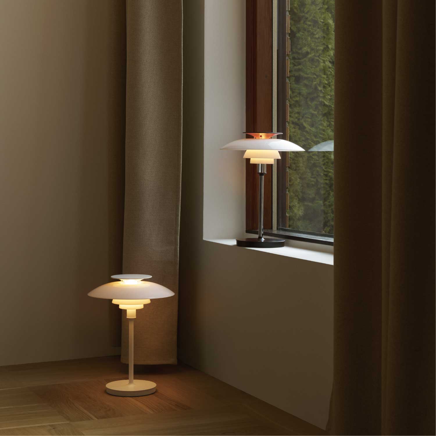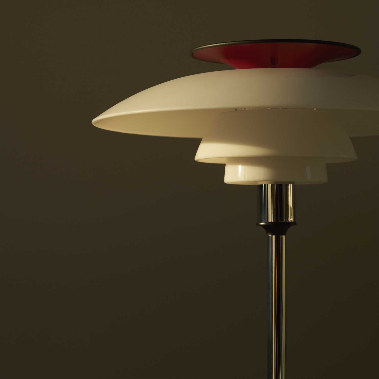 PH 80 ポータブルは、拡散光と反射光を放ち、光の多くは下方に向けられます。乳白色のアクリルシェードは、快適なアンビエントライトを提供します。クロームメッキのタイプは、赤いトップ・リフレクターが光に暖かみを加えます。ホワイトタイプは、白いトップ・リフレクターがクリーンでエレガントな印象をもたらします。