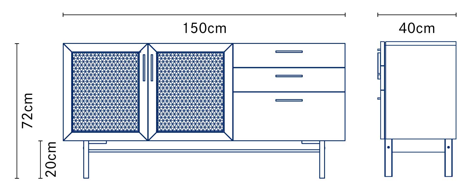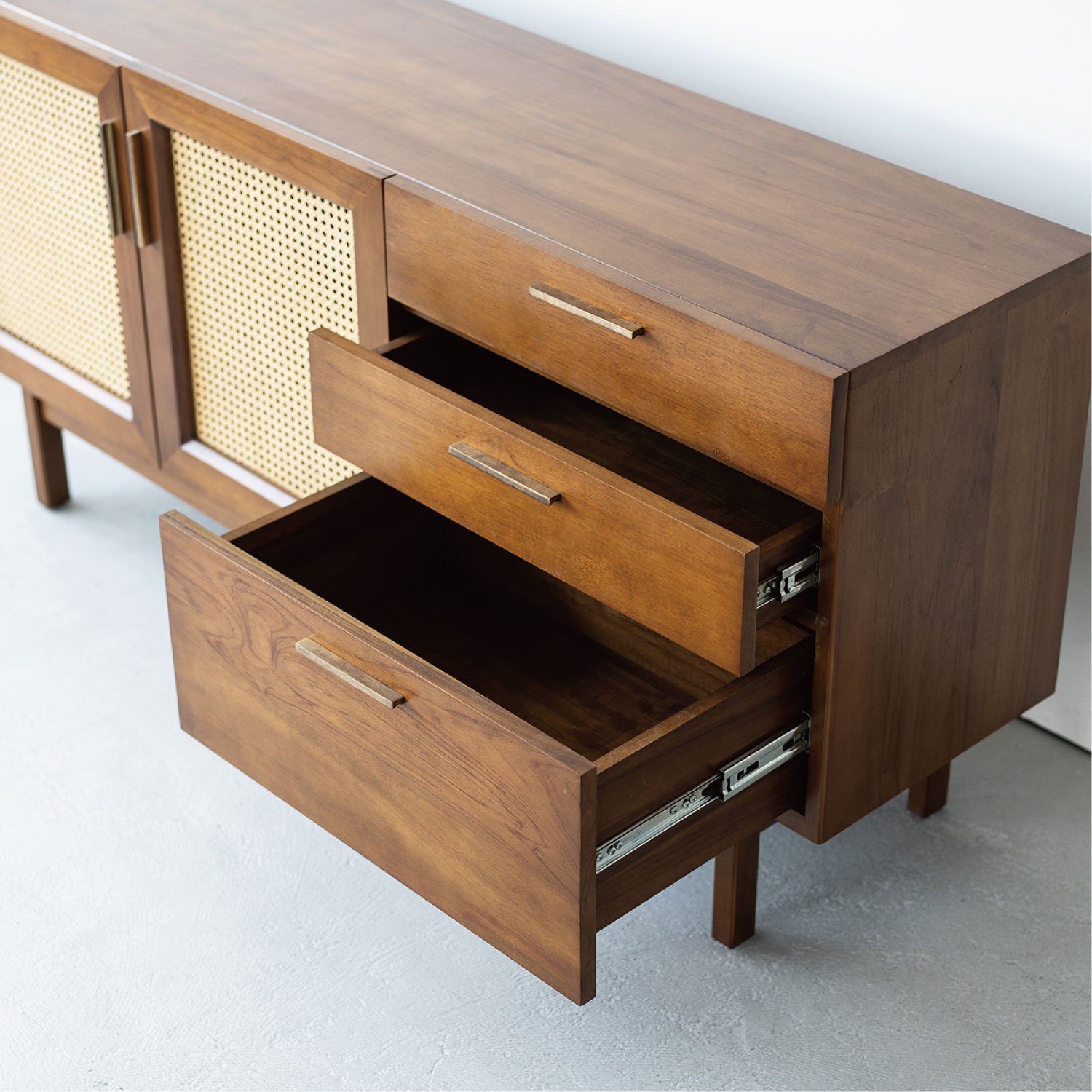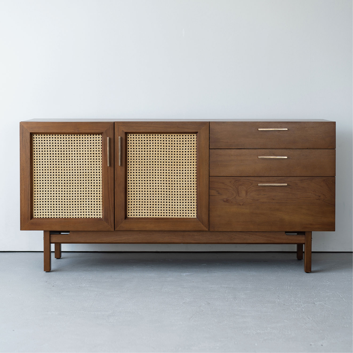 ヴィンテージ家具の雰囲気を再現したサイドボード。真鍮のハンドルは、使い込むほどに風合いが増していきます。風格のある佇まいにラタンの扉が程よい抜け感を生み出します。