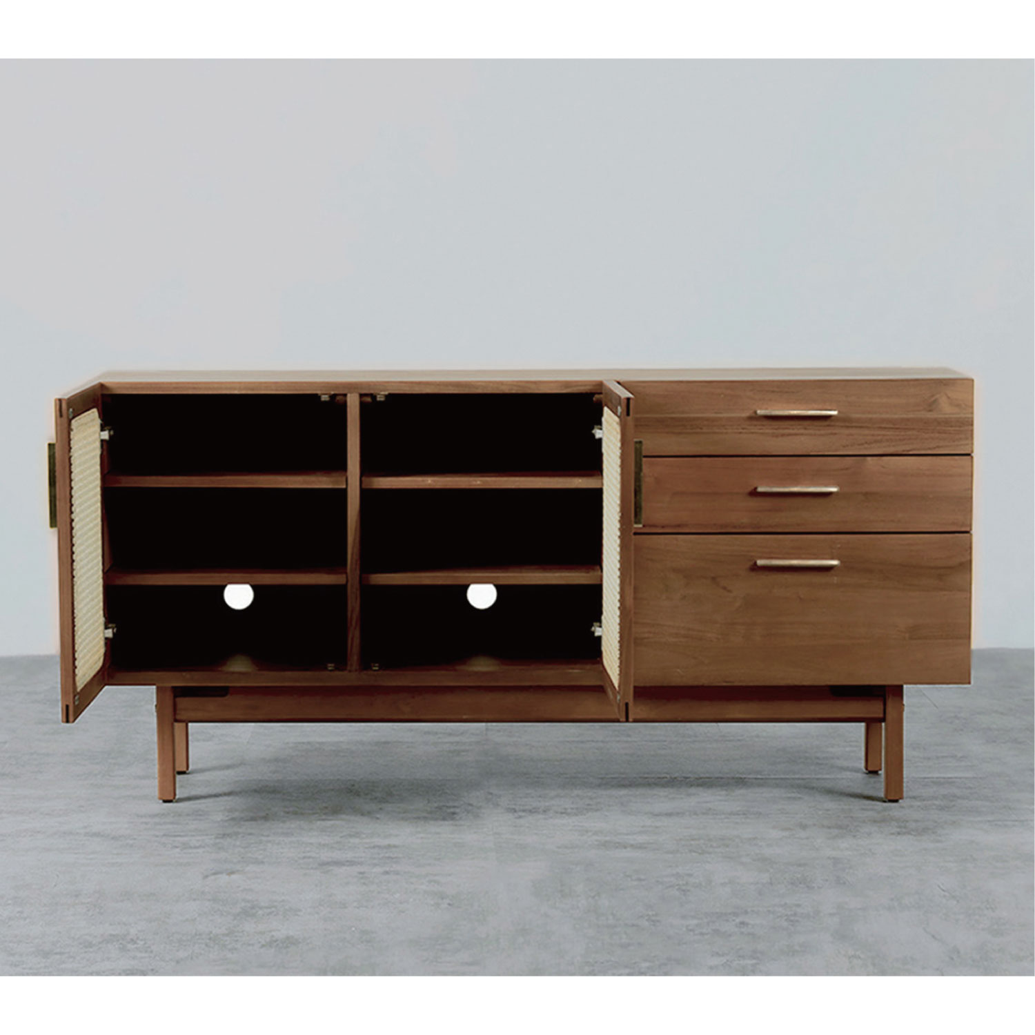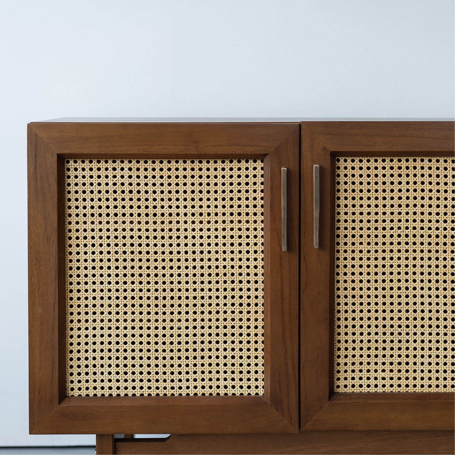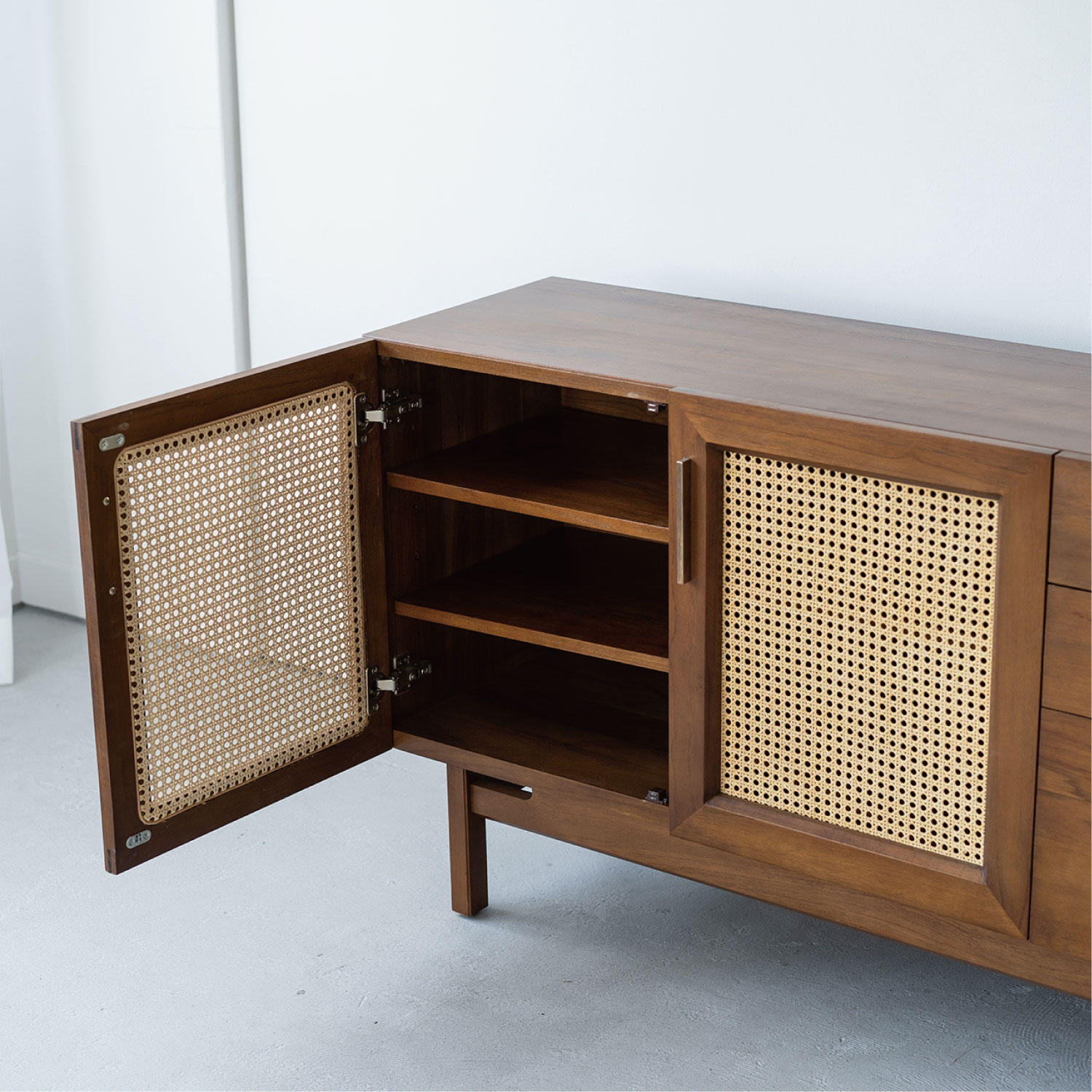 ヴィンテージ家具の雰囲気を再現したサイドボード。真鍮のハンドルは、使い込むほどに風合いが増していきます。風格のある佇まいにラタンの扉が程よい抜け感を生み出します。