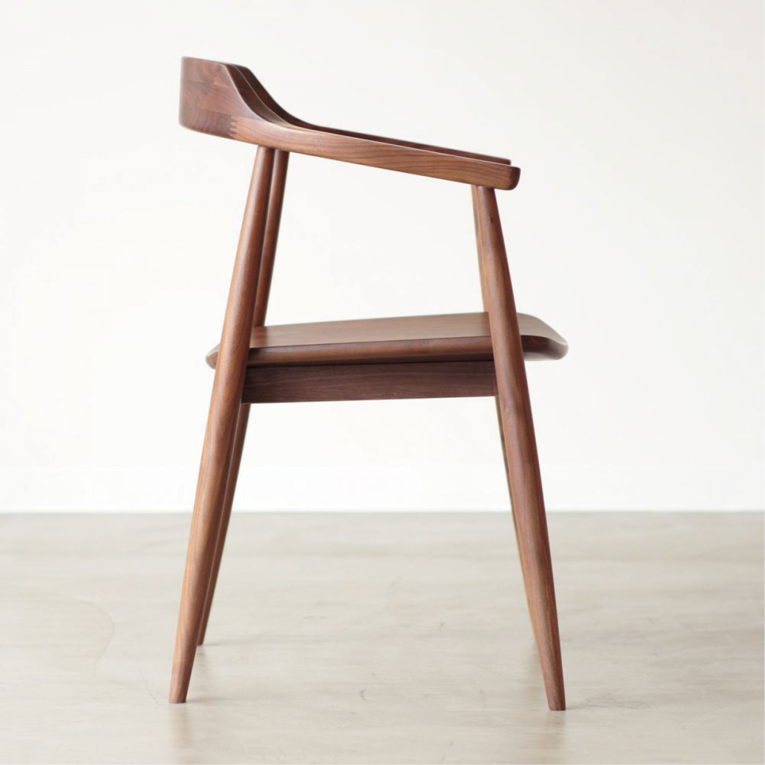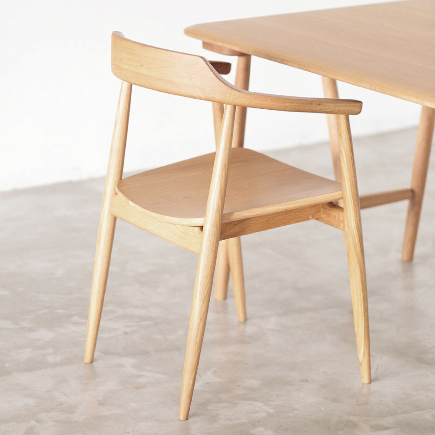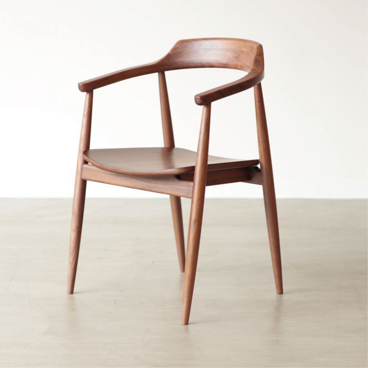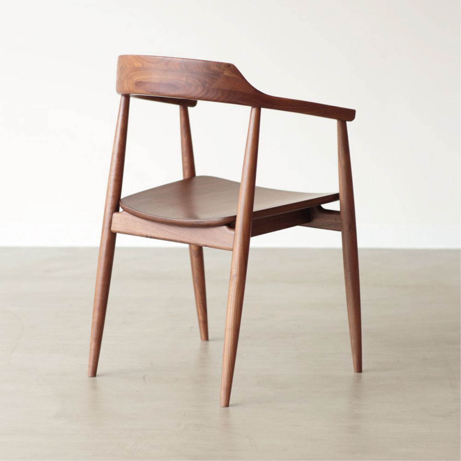 ベーシックなデザインでありながら、凛とした佇まいが美しいアームチェア。曲線を多用した温かみのあるデザインが上質な木材の表情を引き立てます。腰をしっかりとサポートする座り心地も魅力です。