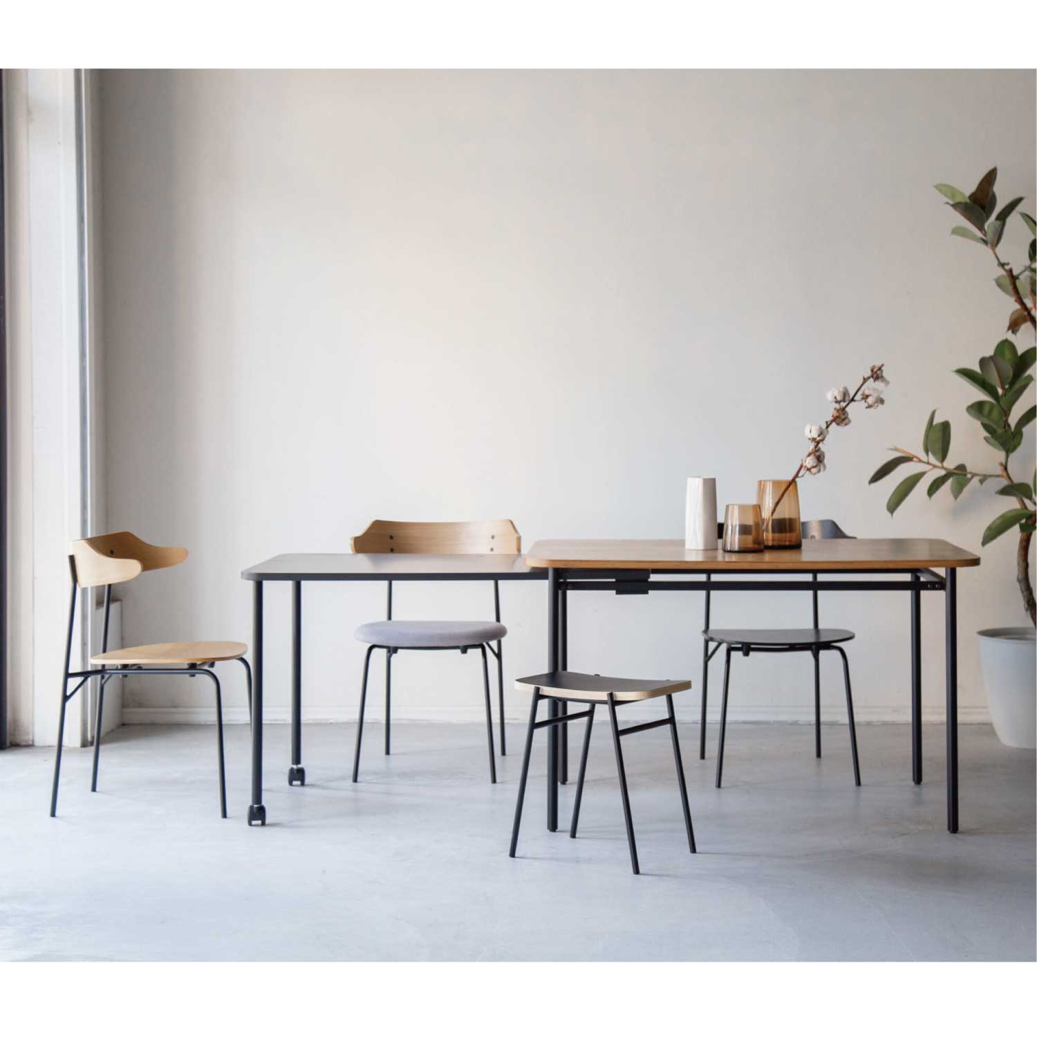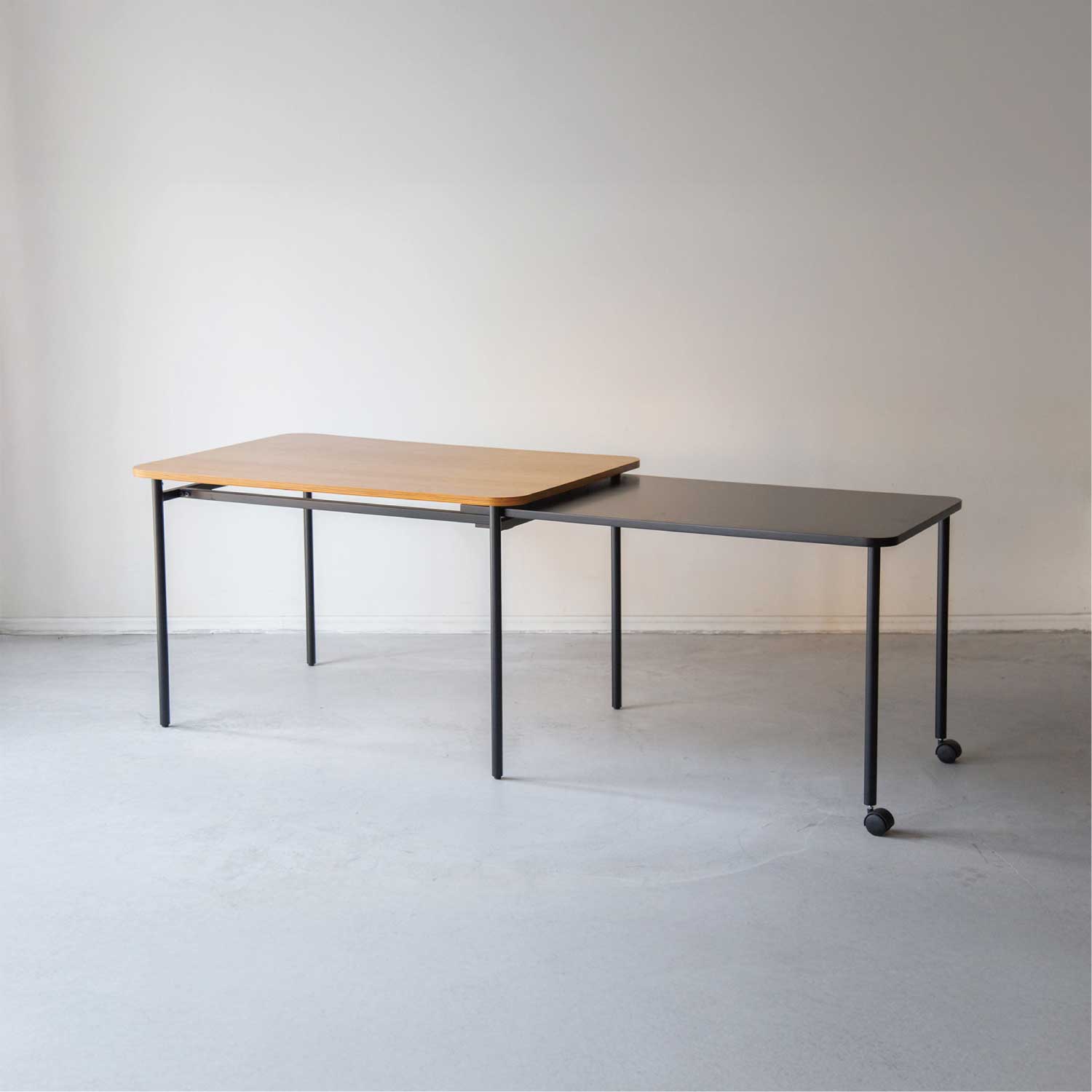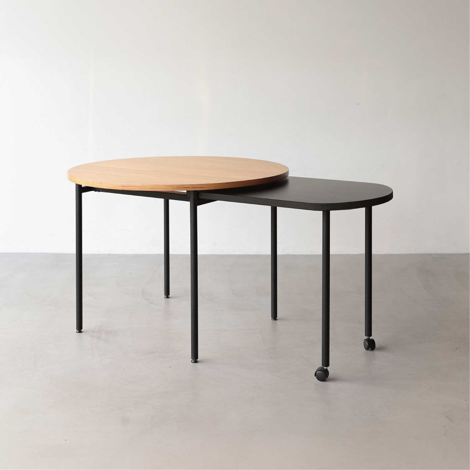 伸縮式のテーブル。通常時はコンパクトに、来客の時などにサブ天板を引き出して大きなテーブルとして使用することができます。天然木の表情とブラックカラーのコントラストが美しいテーブルです。アイコニックな丸型と、使いやすい長方形の2タイプ展開です。