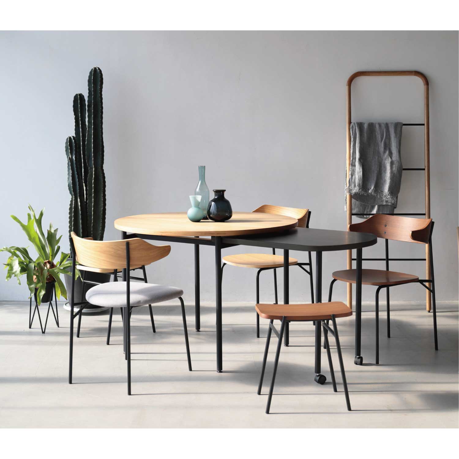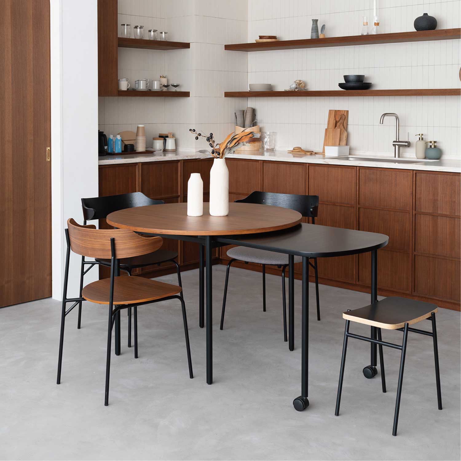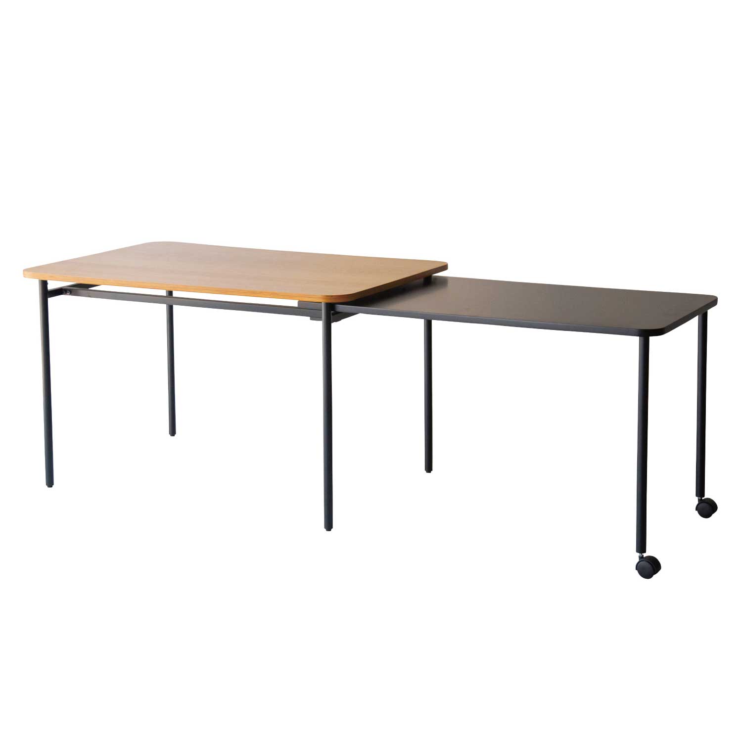 伸縮式のテーブル。通常時はコンパクトに、来客の時などにサブ天板を引き出して大きなテーブルとして使用することができます。天然木の表情とブラックカラーのコントラストが美しいテーブルです。アイコニックな丸型と、使いやすい長方形の2タイプ展開です。