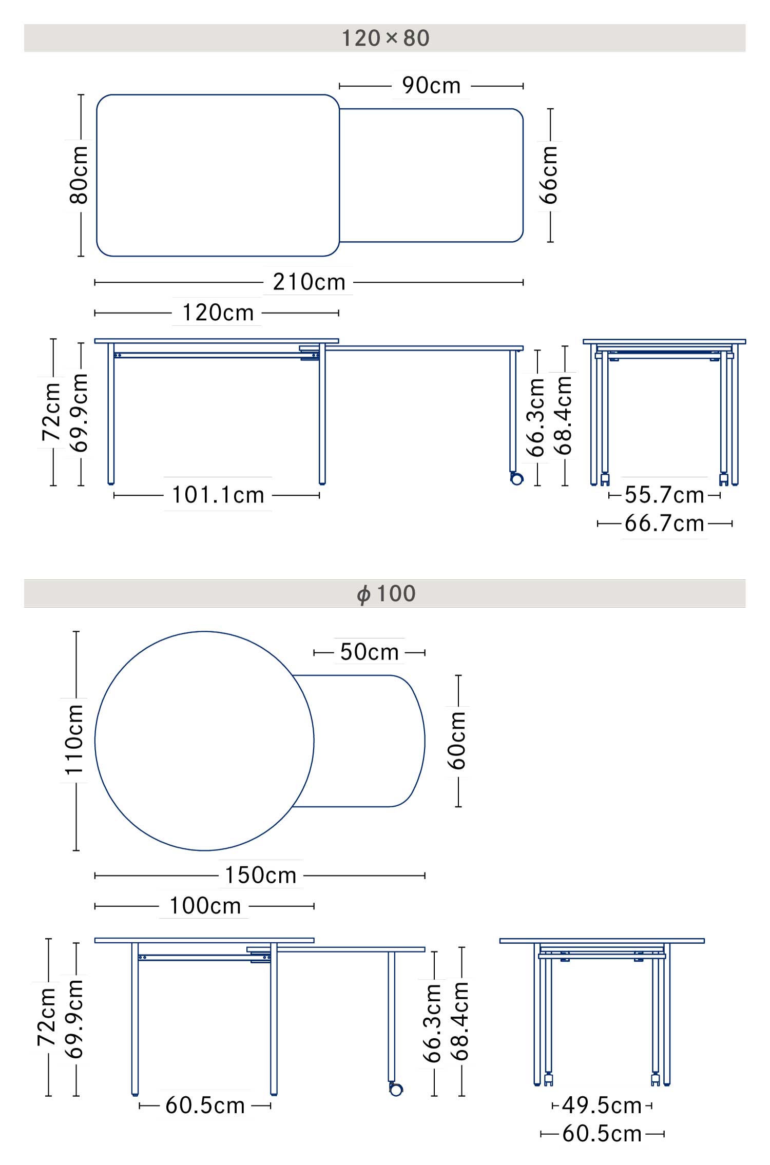 | サイズ | [φ100]W100 – 150 × D100(60) × H72(68.4)cm [120 × 80]W120 – 2100 × D80(66) × H72(68.4)cm ():サブ天板のサイズ |