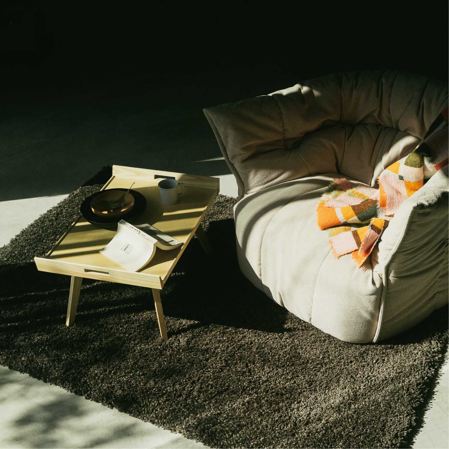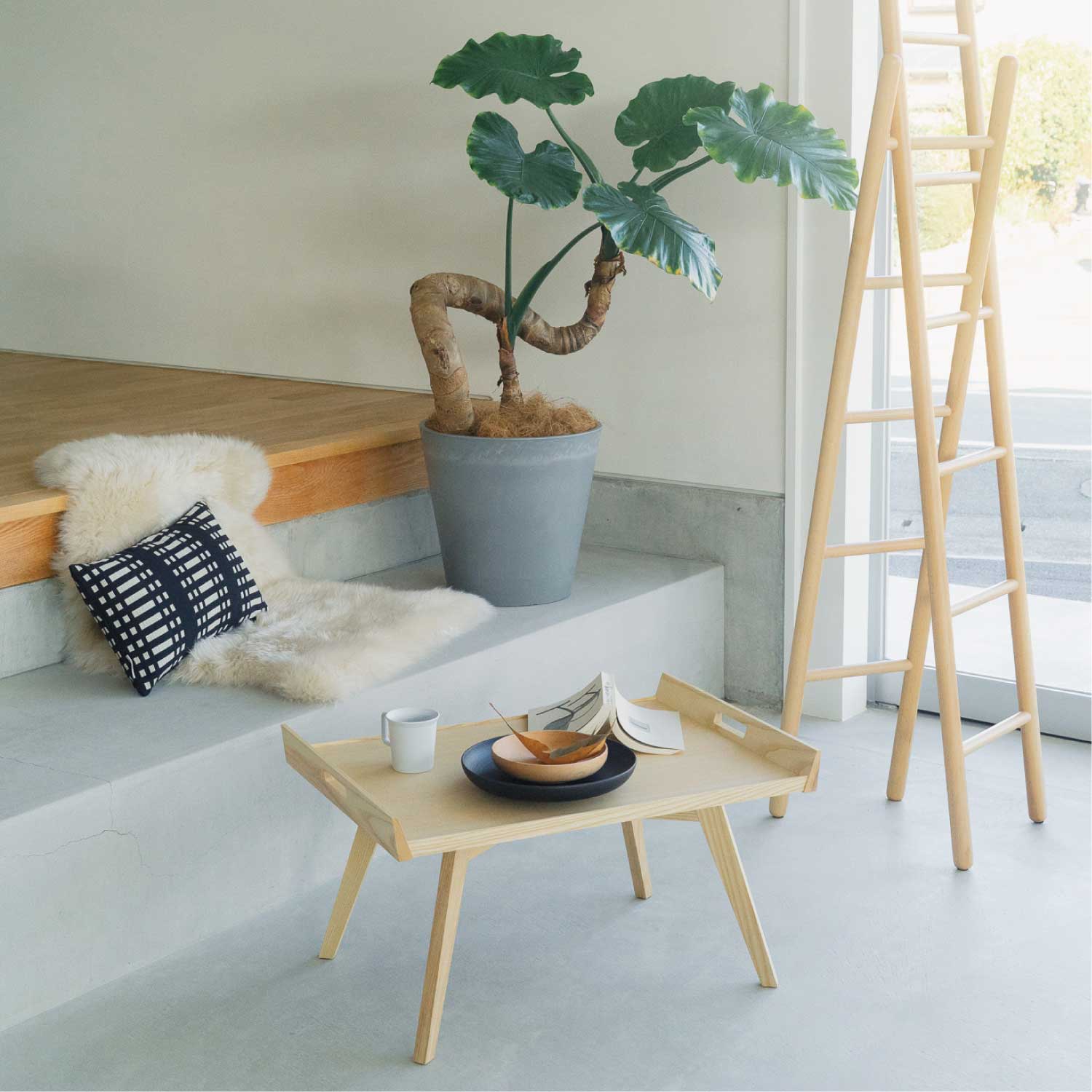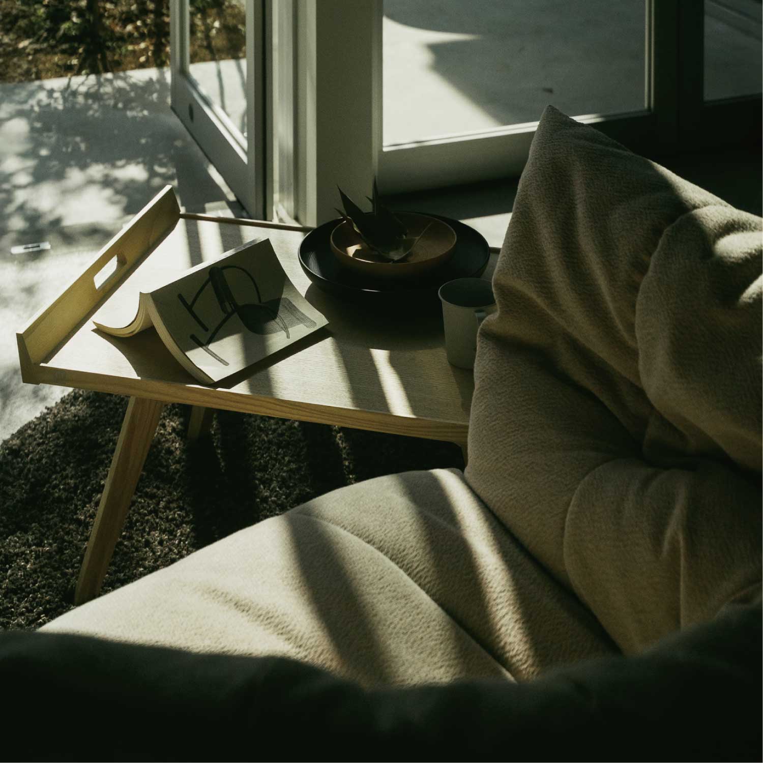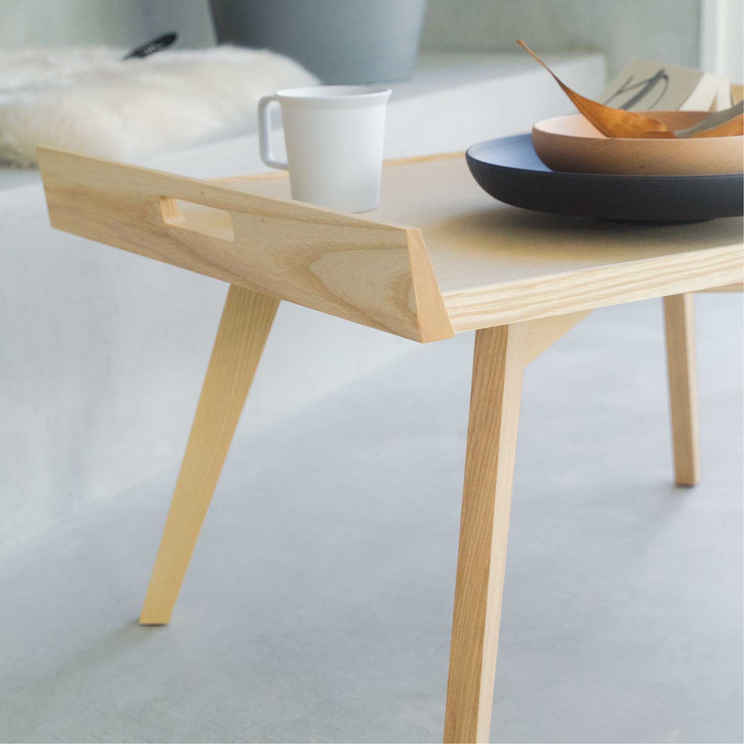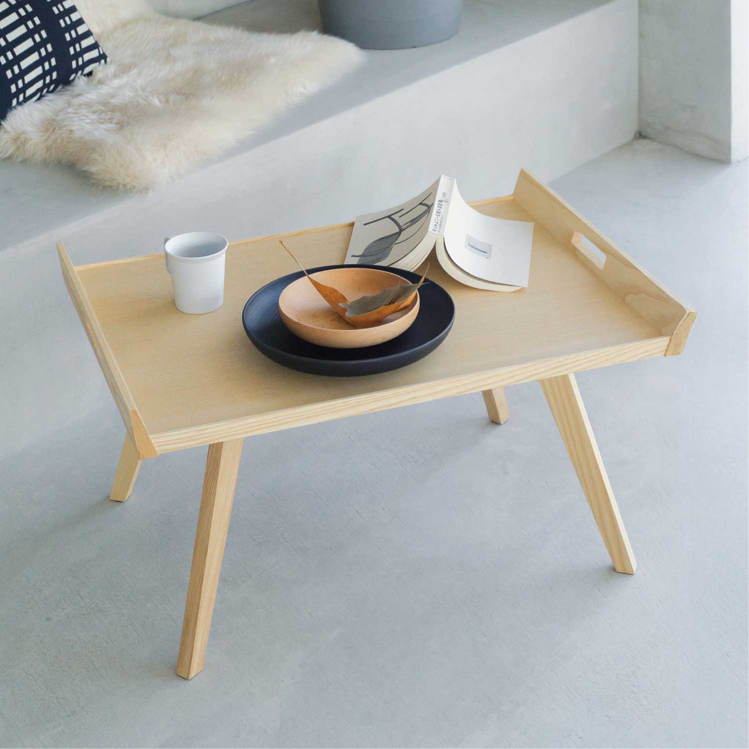 1953年にピエール・ポランがデザインし、2009年にリーン・ロゼから復刻発売されたローテーブルです。スカンジナビアンスタイルにインスパイアされたこのテーブルは、直線的で幾何学的なフォルムが特徴で、特に斜めに伸びる4本の脚は1950年代のデザイン様式を色濃く反映しています。天板に施された取っ手により移動がしやすく、朝食を運ぶトレイや、サイドテーブルとしても活躍します。天板の側面には、ピエール・ポランのロゴマークがあしらわれています。