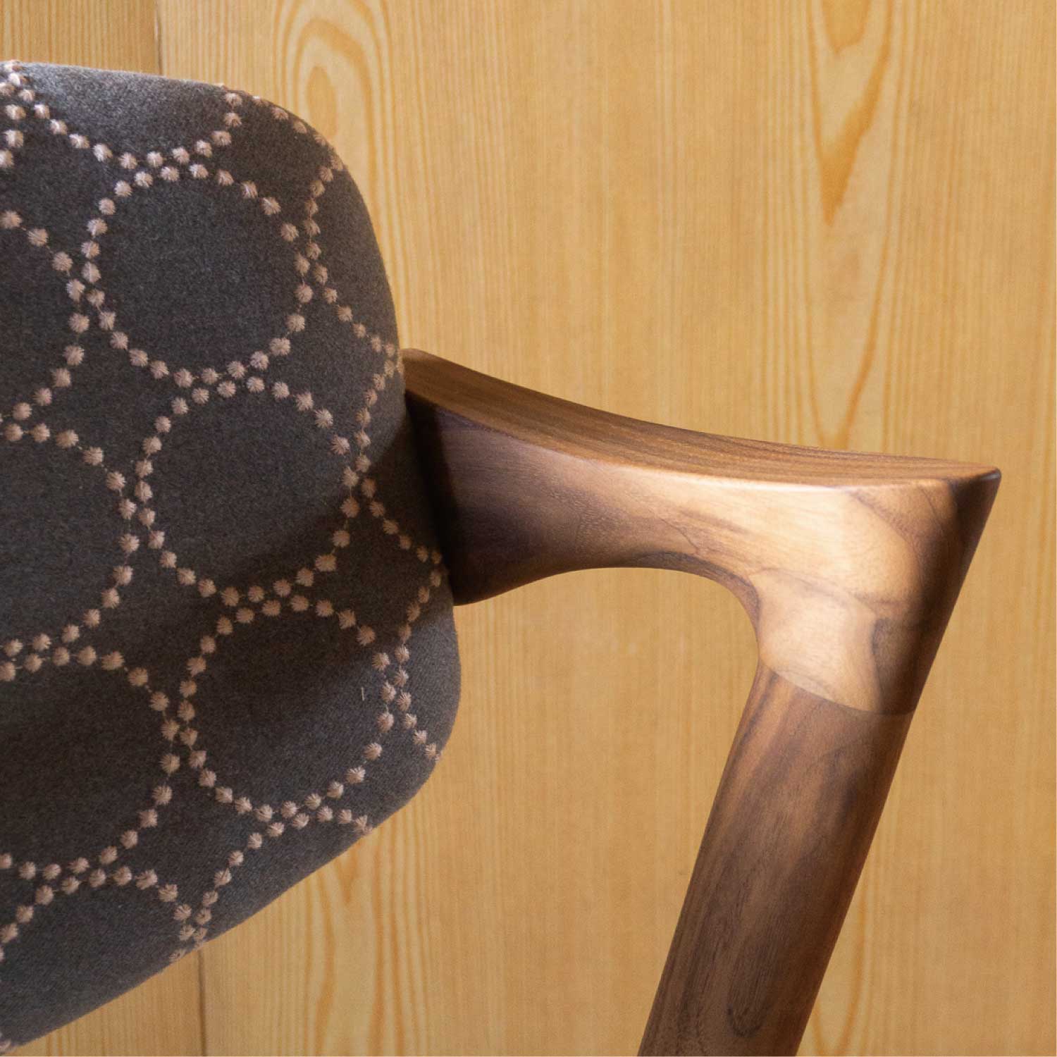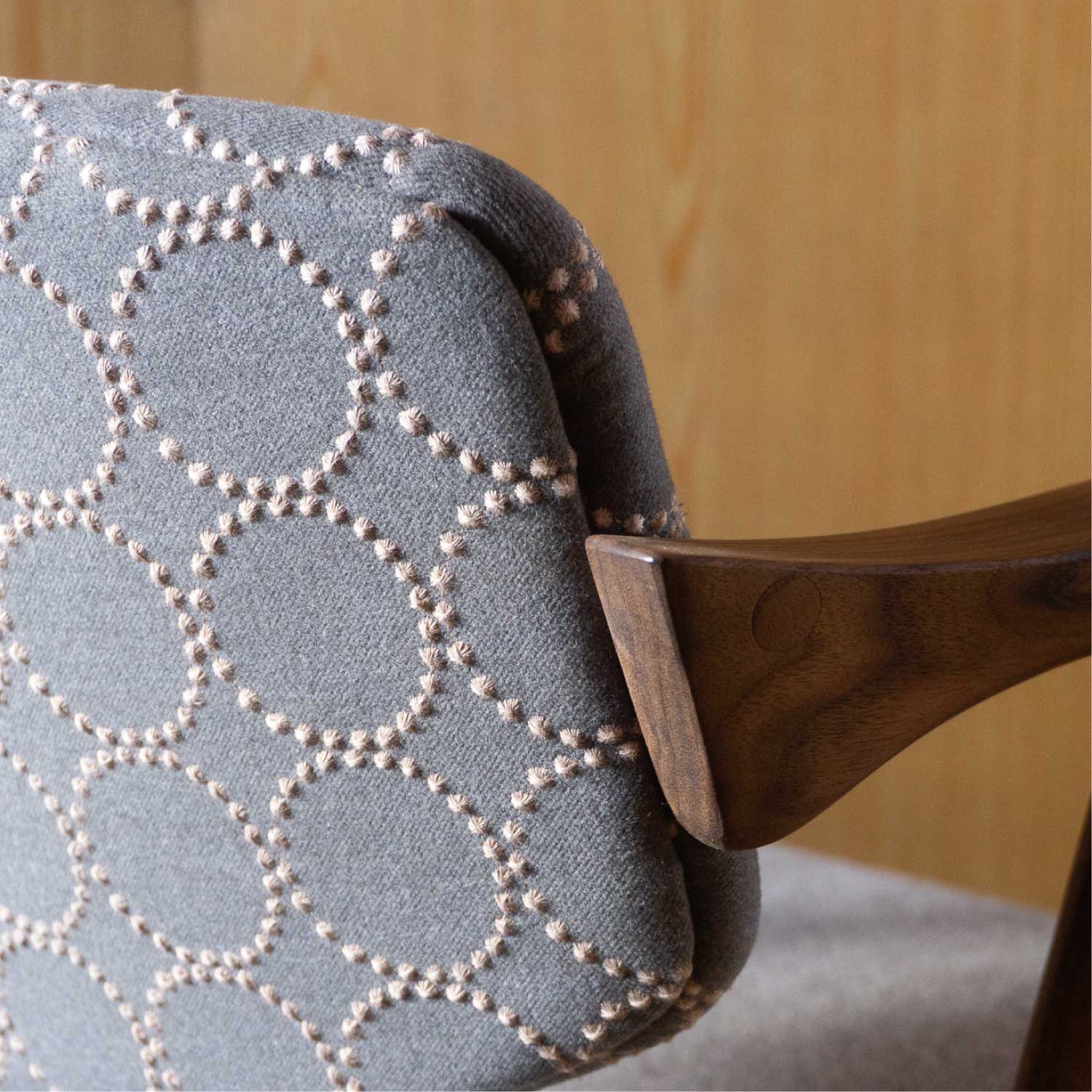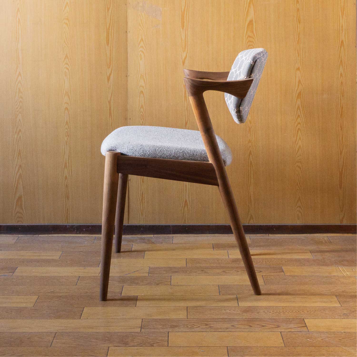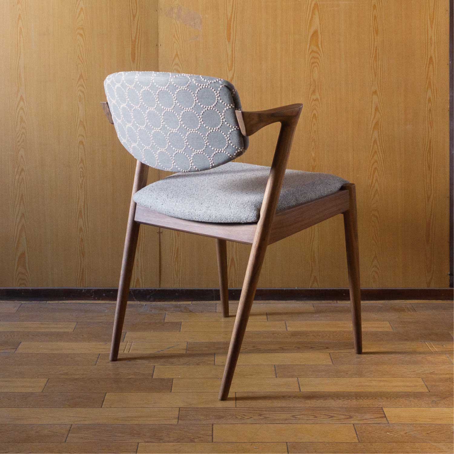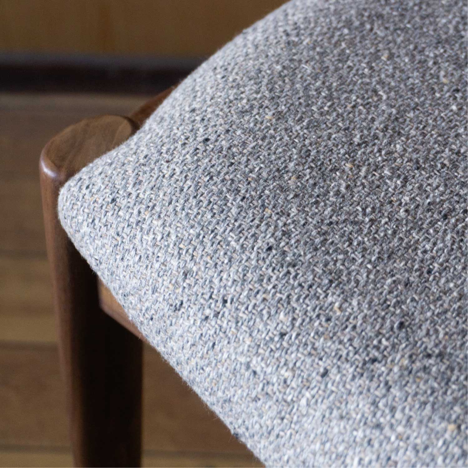 カイ・クリスチャンセン氏デザインの名作チェア”No.42″を mina perhonenの人気生地tambourineを使い別注で制作しました。 腕の収まりが良い絶妙な大きさのハーフアームが備わり、長時間座っていても疲れにくい構造です。 造りの難しさのためか製造中止となっていましたが、復刻製作が実現しました。 さすが名作の名に違わず、どこから見ても美しいです。 名作椅子と言われる所以はデザインだけでなく、この計算された座り心地の良さがあってこそだと思います。