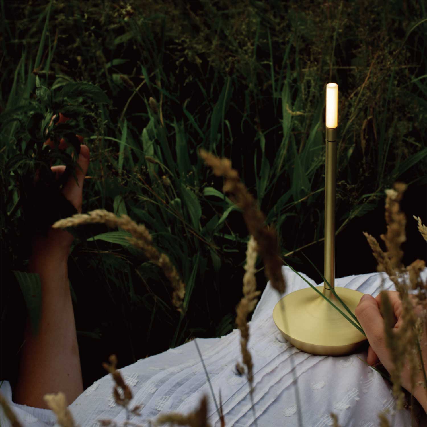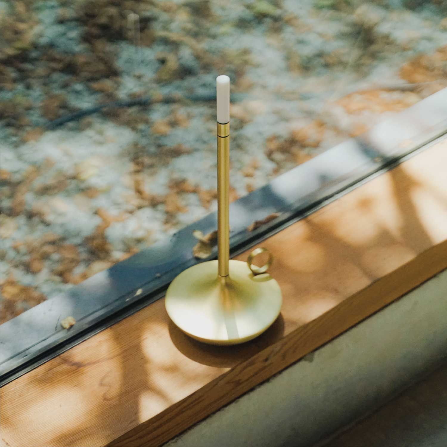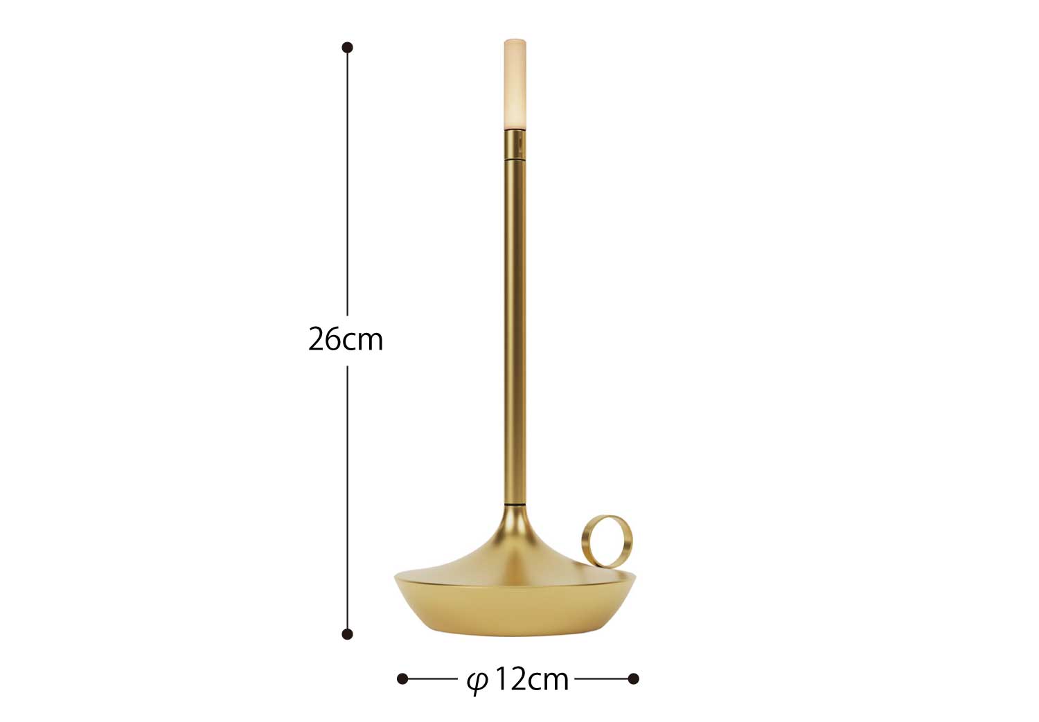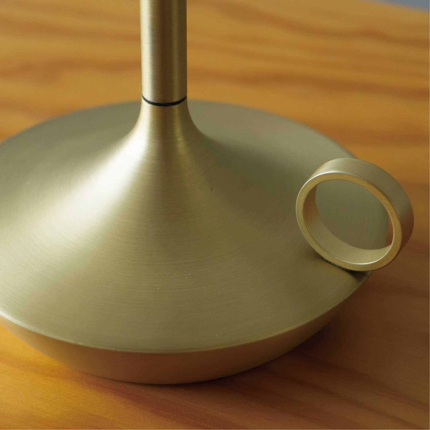手持ちキャンドルホルダーのような上品なポータブルライトです。LEDモジュールの下を指でタッチすると3段階で調光します。カラーはゴールドとなります。