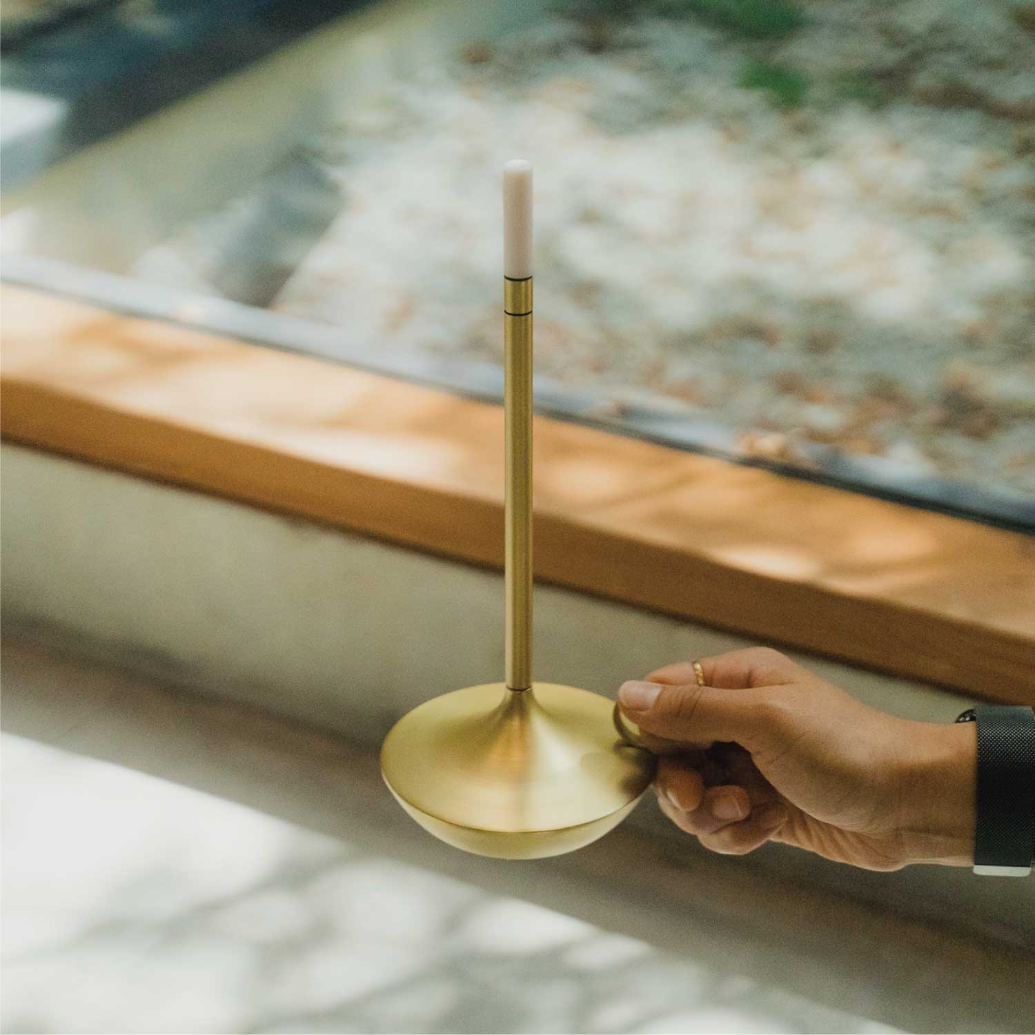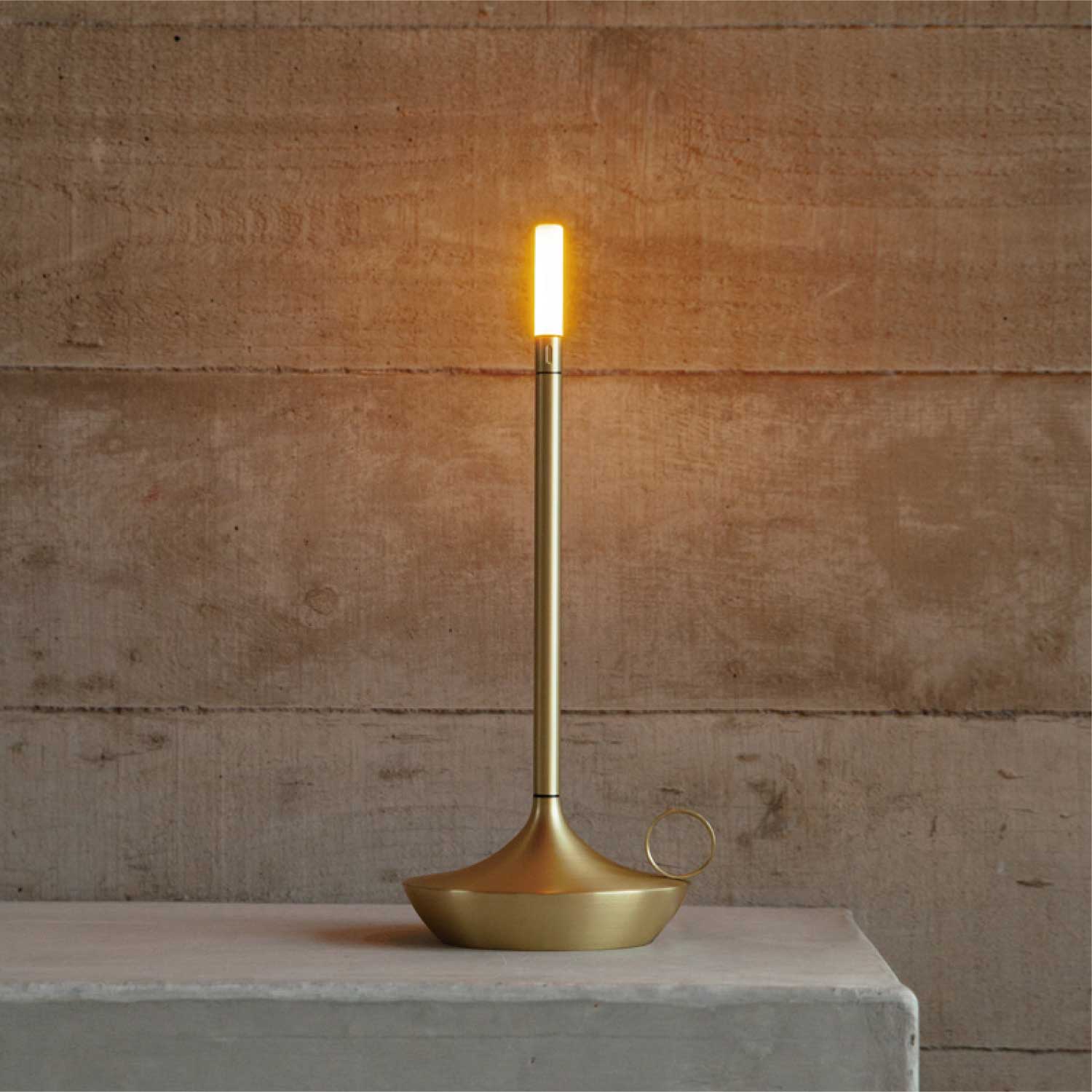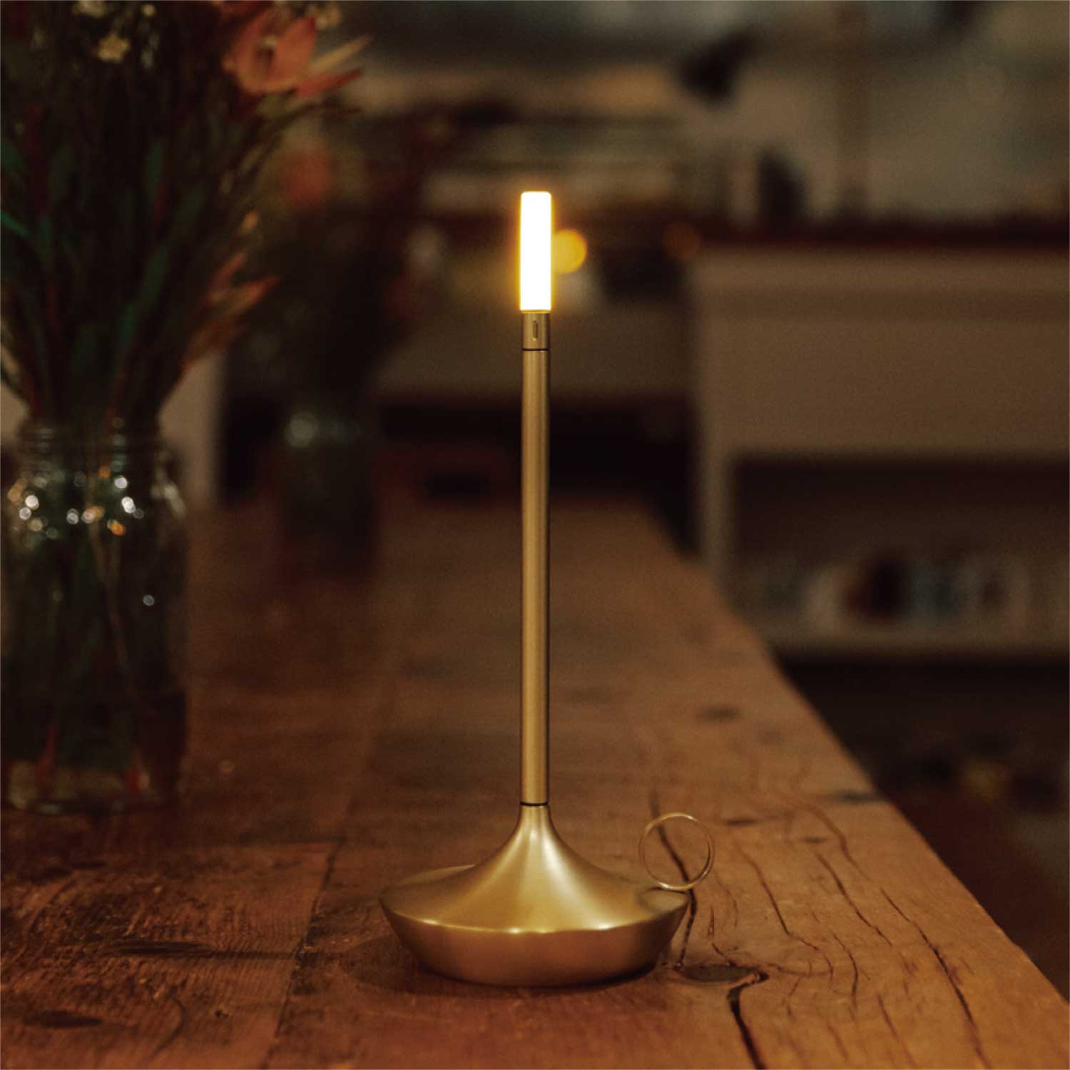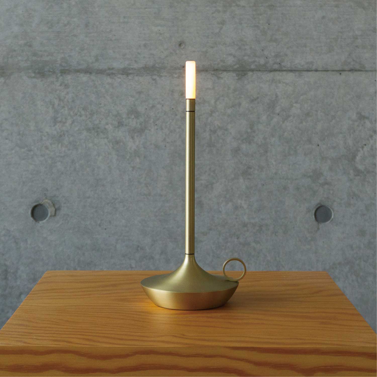 手持ちキャンドルホルダーのような上品なポータブルライトです。LEDモジュールの下を指でタッチすると3段階で調光します。カラーはゴールドとなります。
