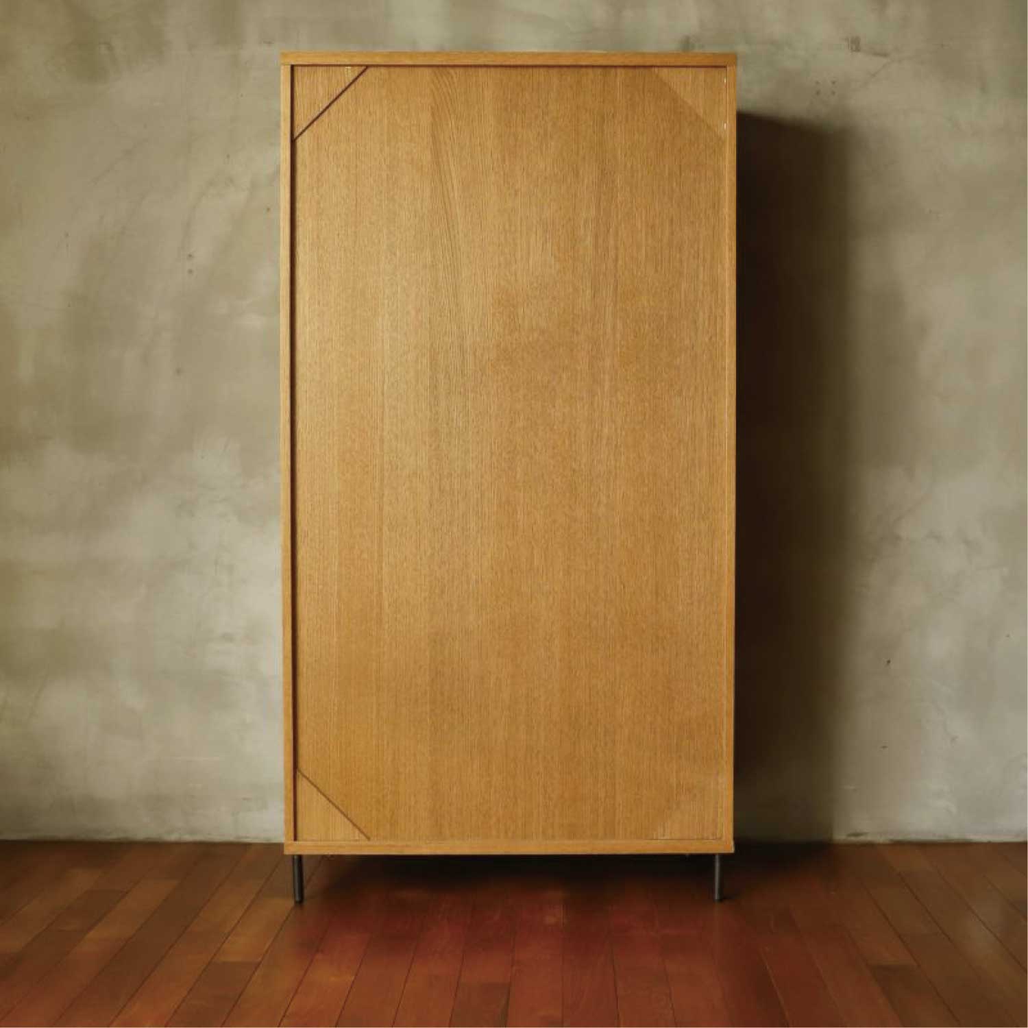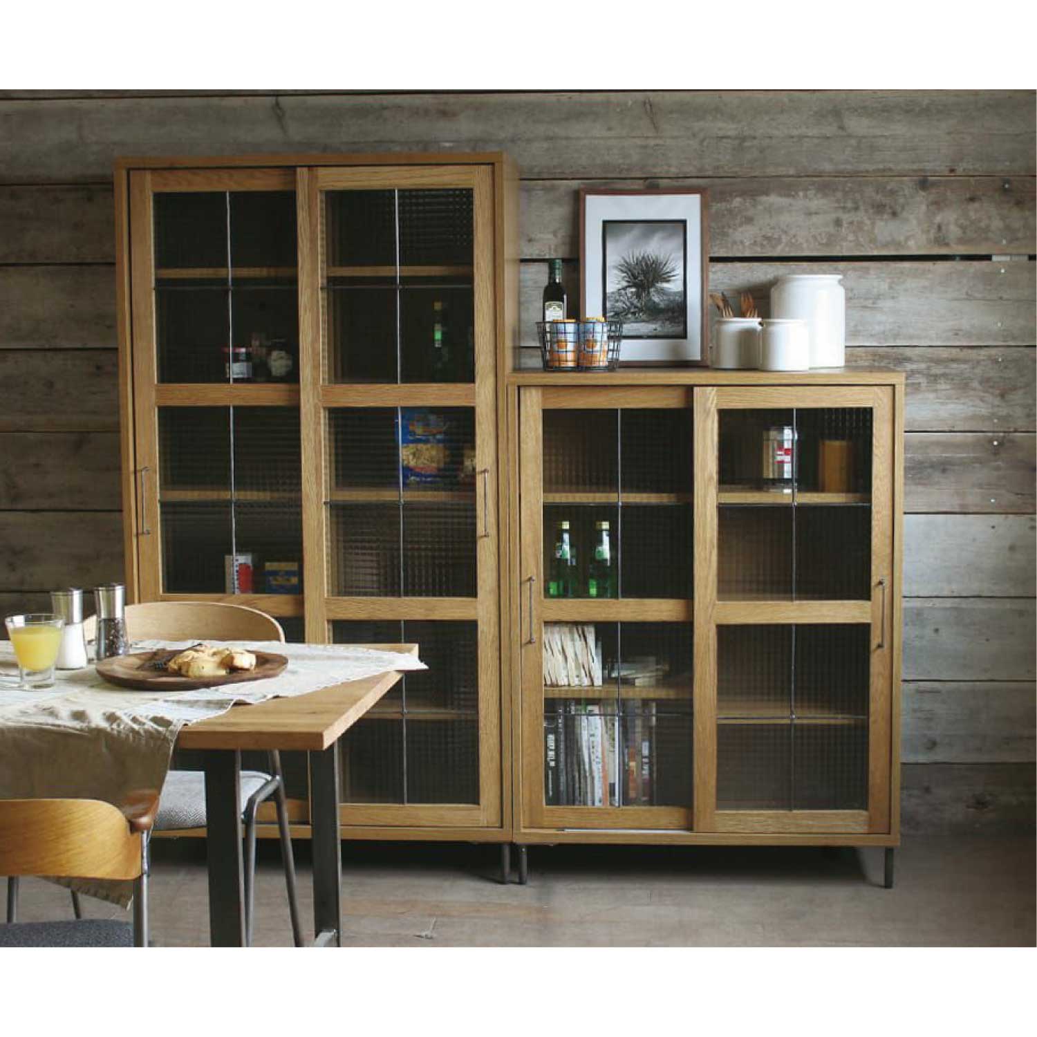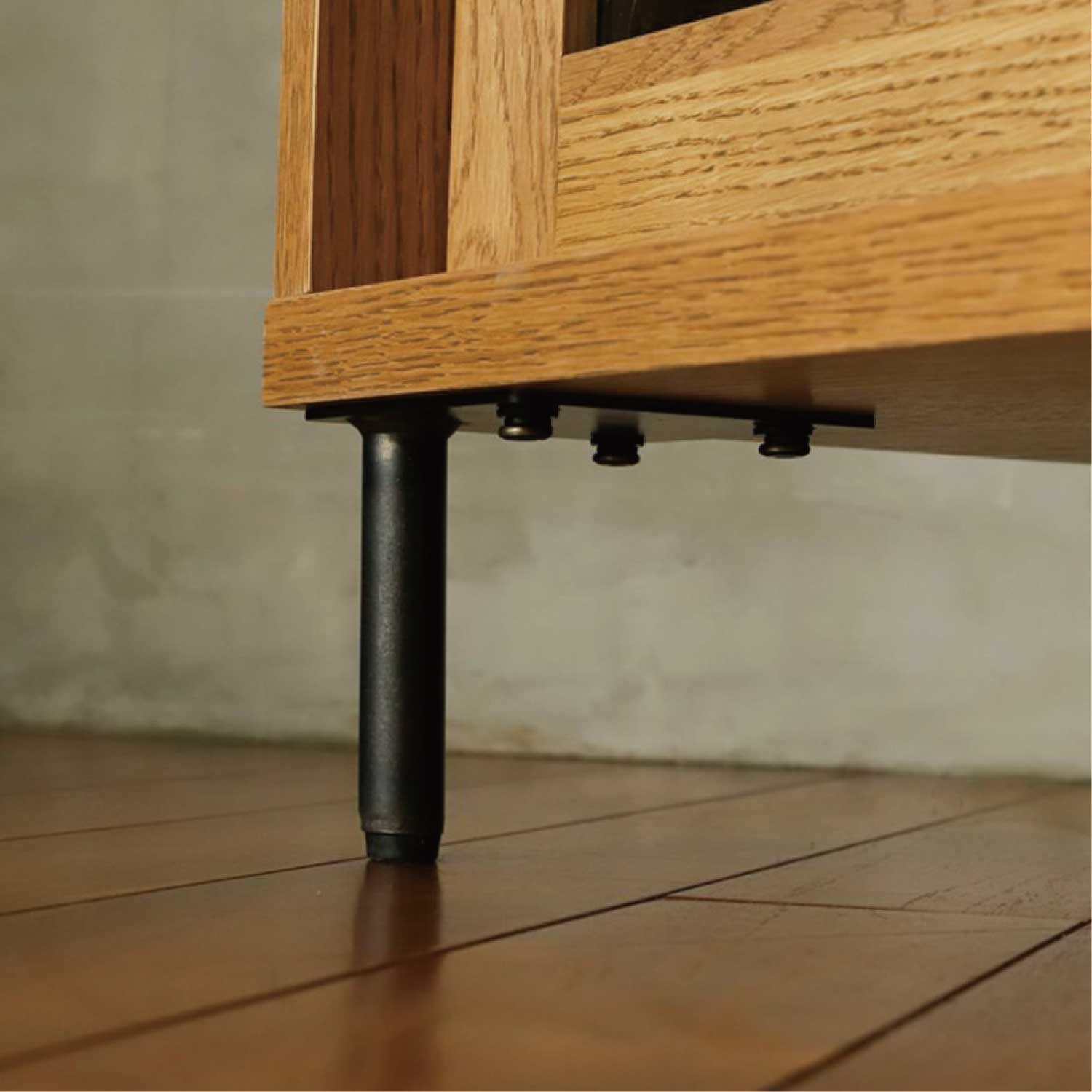 | 素材 | 天板:オーク突板(オイル調ウレタン仕上げ) 前板:オーク無垢材(オイル仕上げ) フレーム:プリント化粧板 棚板:プリント化粧板 背面:プリント化粧板 脚・取っ手:スチール(ラッカー仕上げ) ガラス:クロスガラス |