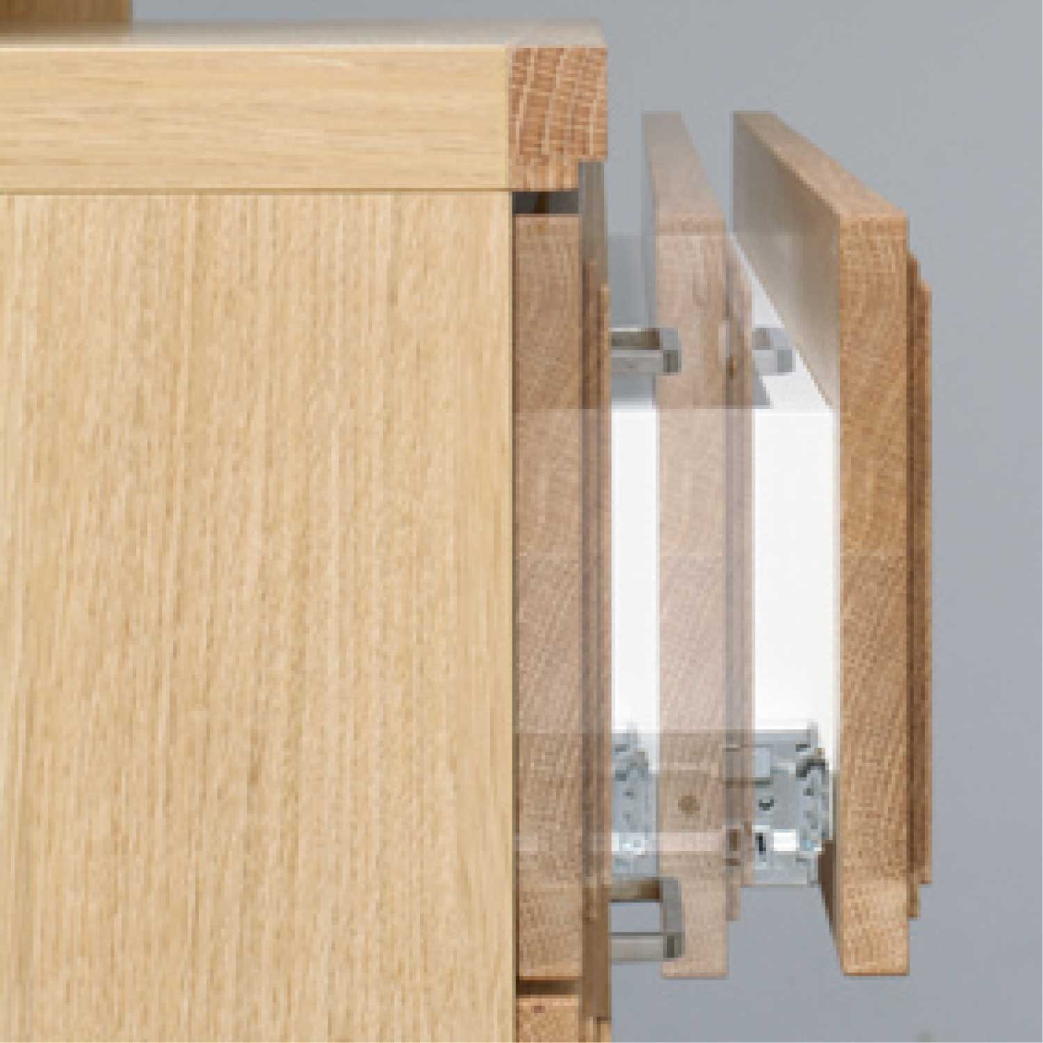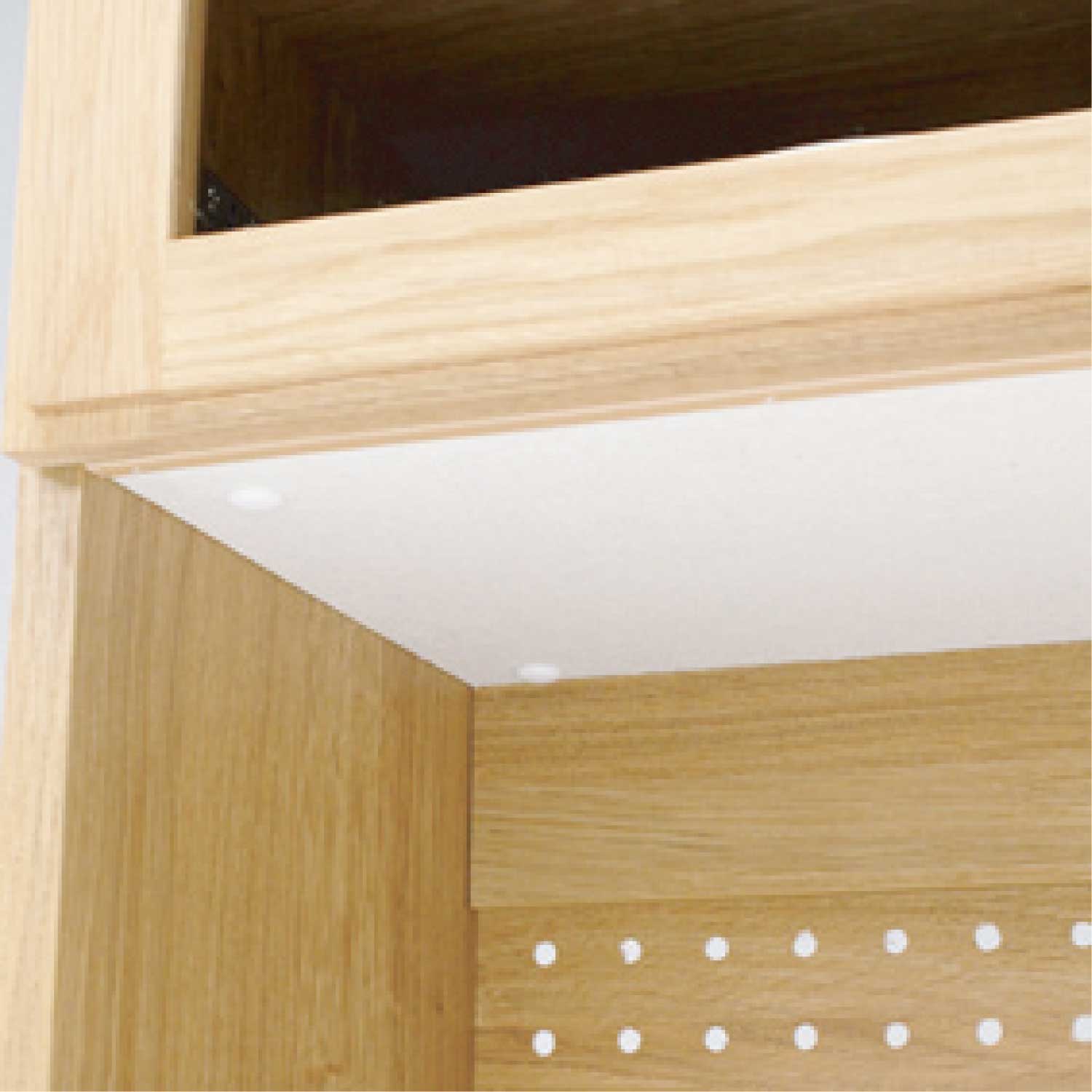 | 素材 | 前板:ウォールナット無垢材(オイル塗装) 本体:プリント化粧板 ガラス(飛散防止フィルム貼) |