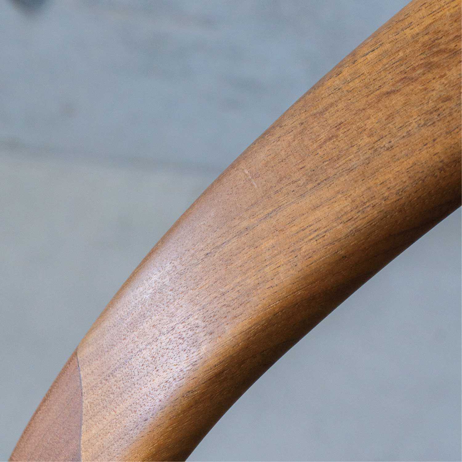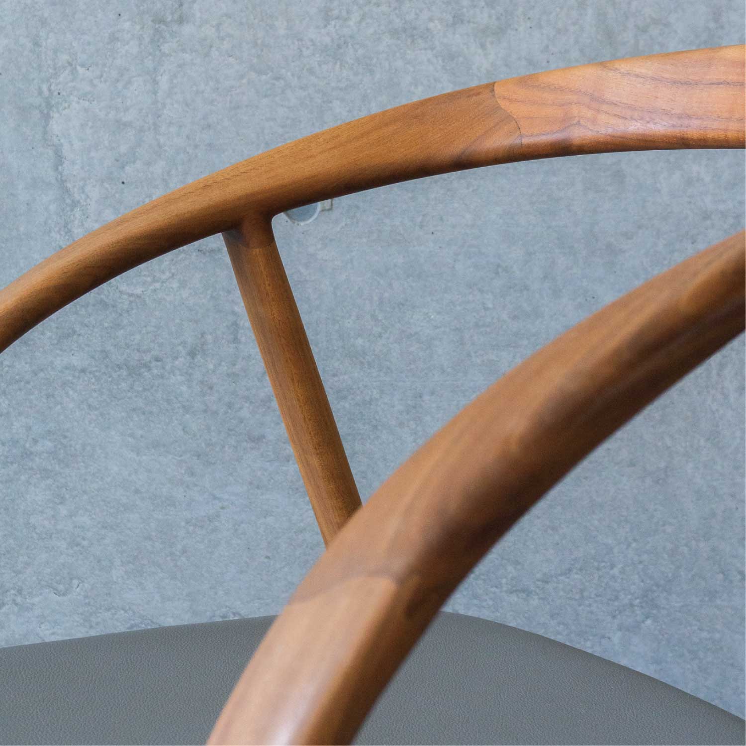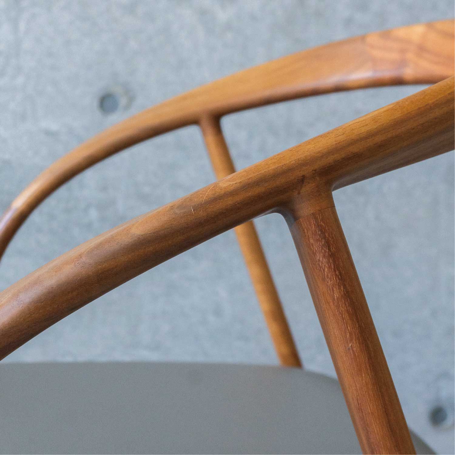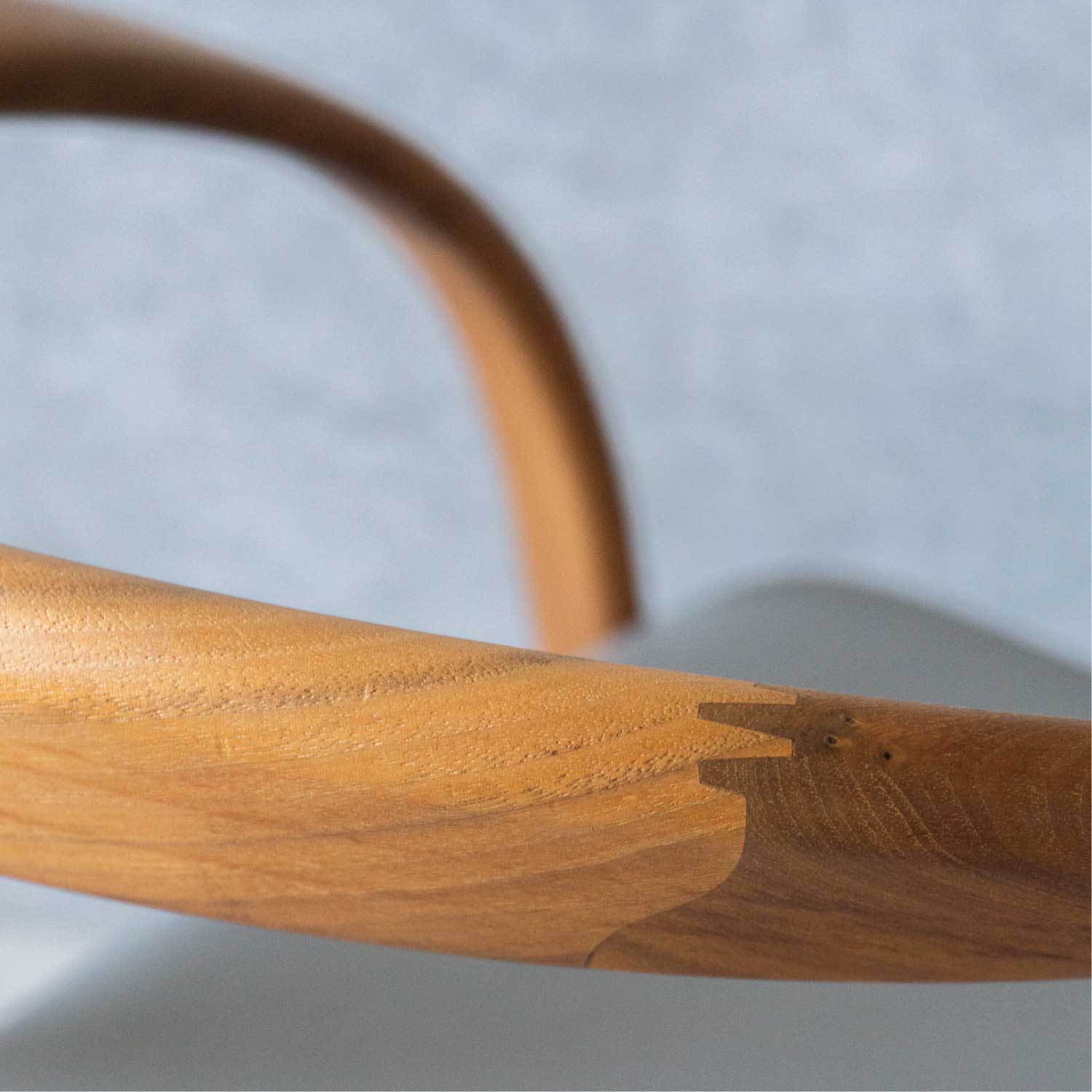 脚・肘・背もたれ等、木部のすべての断面が楕円となっています。ひねりを加えてひとつなぎとなったフレームはずっと撫でていたくなるほどなめらかで抜群の座り心地です。