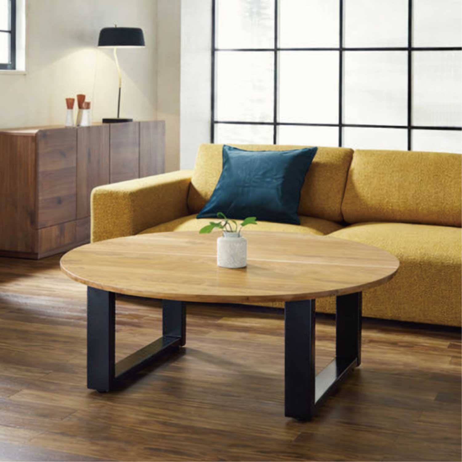 無垢材の天板とスチール脚を用いた丸ローテーブルです。天板はオイル塗装で仕上げを行い、エッジの部分はアールをつけておりますので、丸い形もあいまって柔らかく親しみやすい印象です。