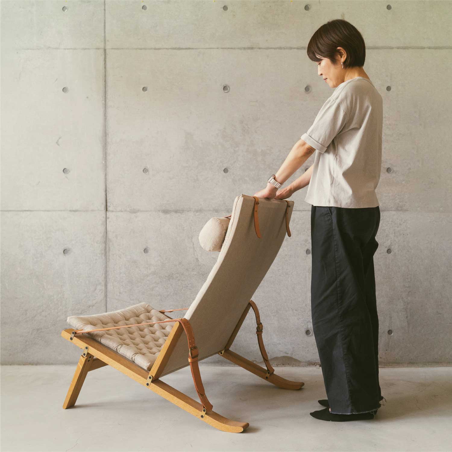 この椅子のコンセプトは使用しない時に場所をとらず、しかもコンフォートに優れたラウンジチェア。