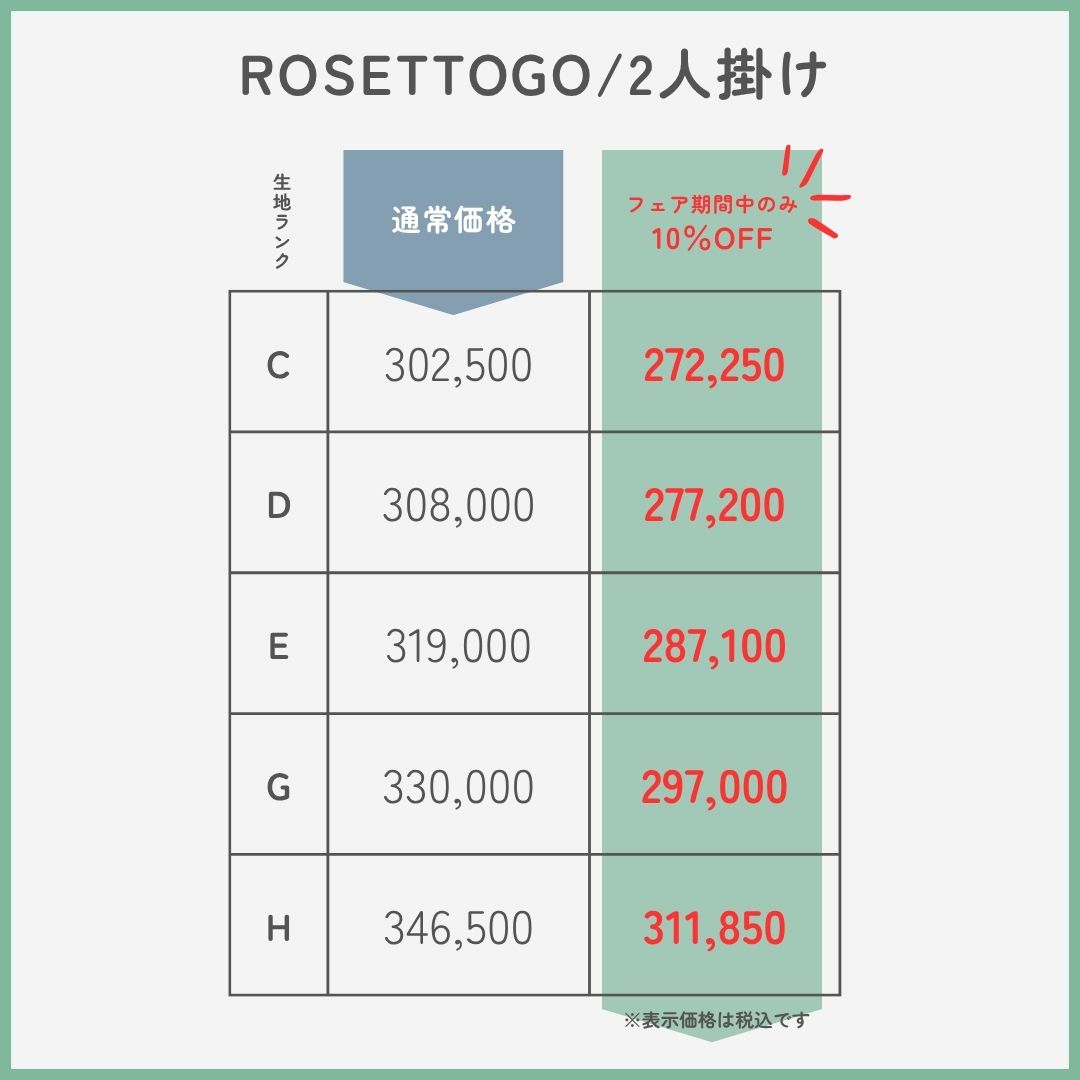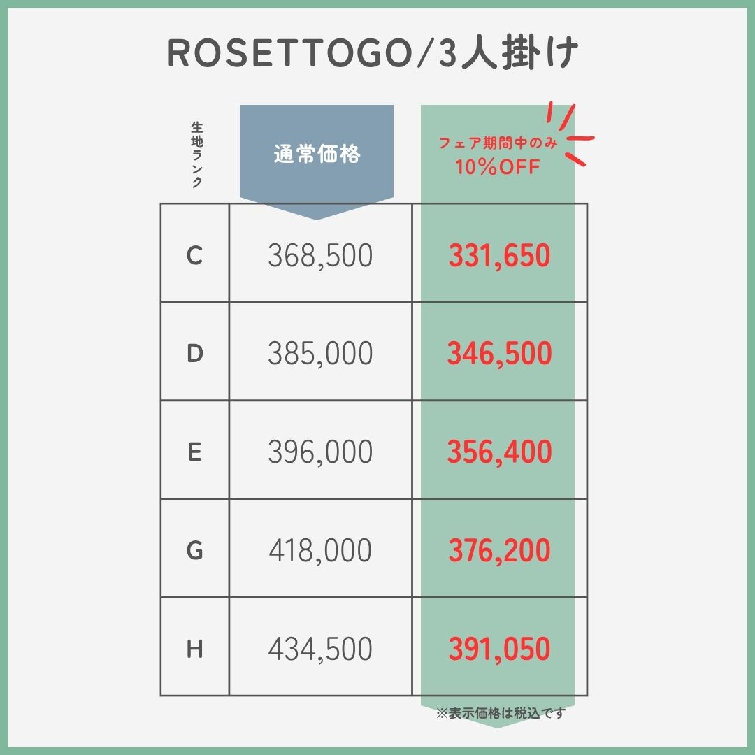 「ロゼトーゴ」の1人掛け~3人掛けの価格は下記をご確認ください。「10%OFF」って魅力的な価格になりますね~この際だから「生地ランクをあげようかな…」と悩むのもありです。まずは「ロゼトーゴ」に座ってみましょう!