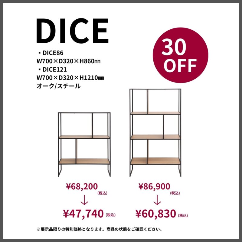 「DICE (ダイス)」は、オークと黒スチールフレームですっきりとしたデザインのシェルフです。サイズ違いの組み合わせで使う事もでき、小物や洋書・ポータブルランプを配置するとインテリアを楽しんでいるお洒落な空間となります。軽量な点も嬉しく、お部屋の中で配置を変える事が簡単におこなえます。ありそうでなかなかないデザインのシェルフを是非暮らしにプラスしませんか?