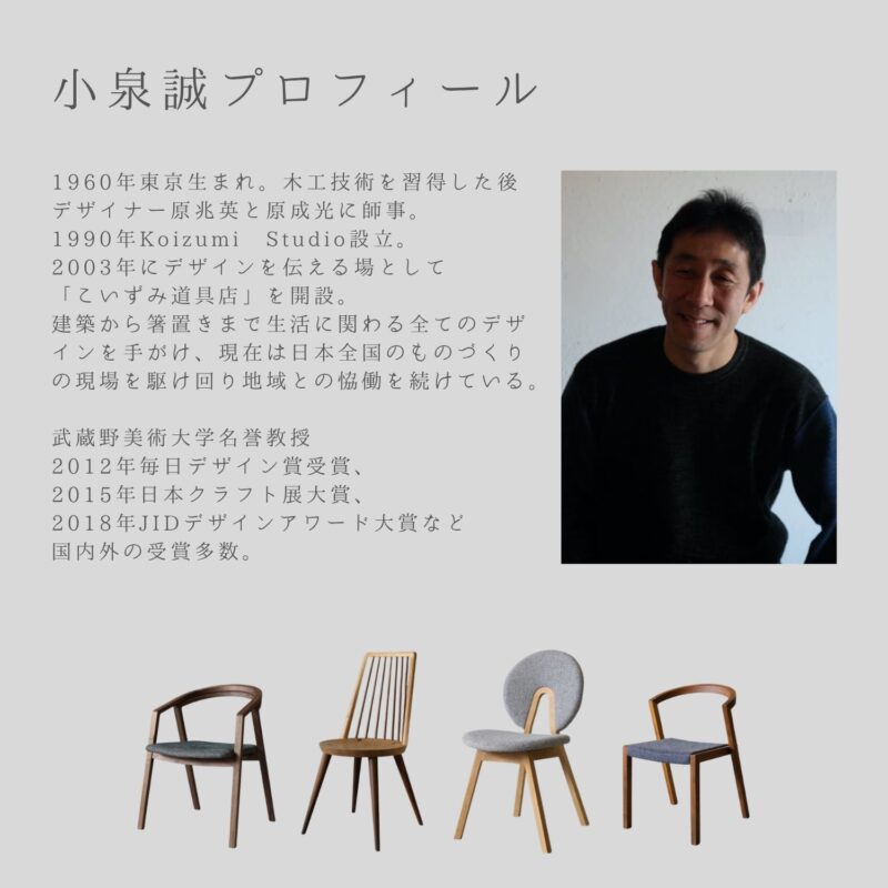 小泉誠さんは、「暮らしに根ざしたデザイン」を大切にする家具デザイナーです。木の表情や手ざわりを活かしながら、使うほどに愛着が深まるような、やさしいデザインを数多く手がけています。シンプルで飾らない佇まいの中に、素材の温もりと丁寧なつくりの美しさが息づいています。