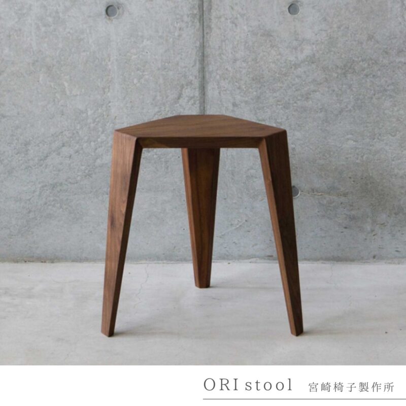 宮崎椅子製作所の「ORI Stool」は、伝統的な折り紙の「折る」という形態を木の折曲げ構造で強度を保つ為、ジョイントの仕方や削り方に工夫を施し製作されています。角度によって脚や座面の形状が違って見える視覚的な面白さもあります。
