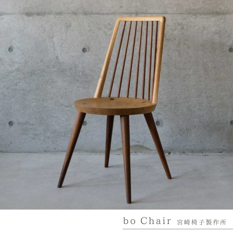 宮崎椅子製作所の「bo Chair」は、どこから見ても美しいスポーク構造の背もたれが目をひきます。座ってみると背中をやさしく支え、包み込まれるような感覚の座り心地です。丸い座面が削り込まれているのもポイントになっており、座面の裏面も削っているので、重量も軽く、お掃除の際など移動も楽に行えます。