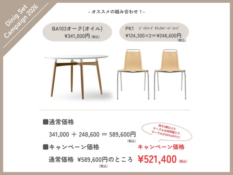 今回のセールはテーブルとチェア(2脚以上)をセットで購入するとテーブルが20%OFFにてお求めいただけます。