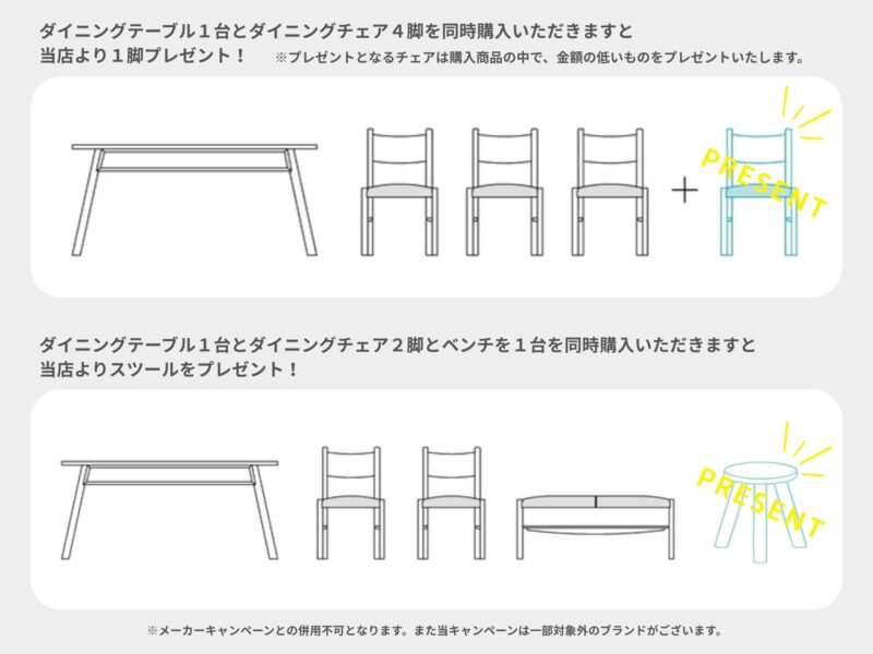 特典内容:ダイニングチェア1脚プレゼント(またはスツールを1脚プレゼント)