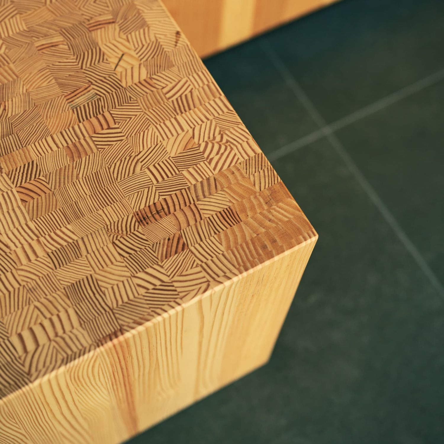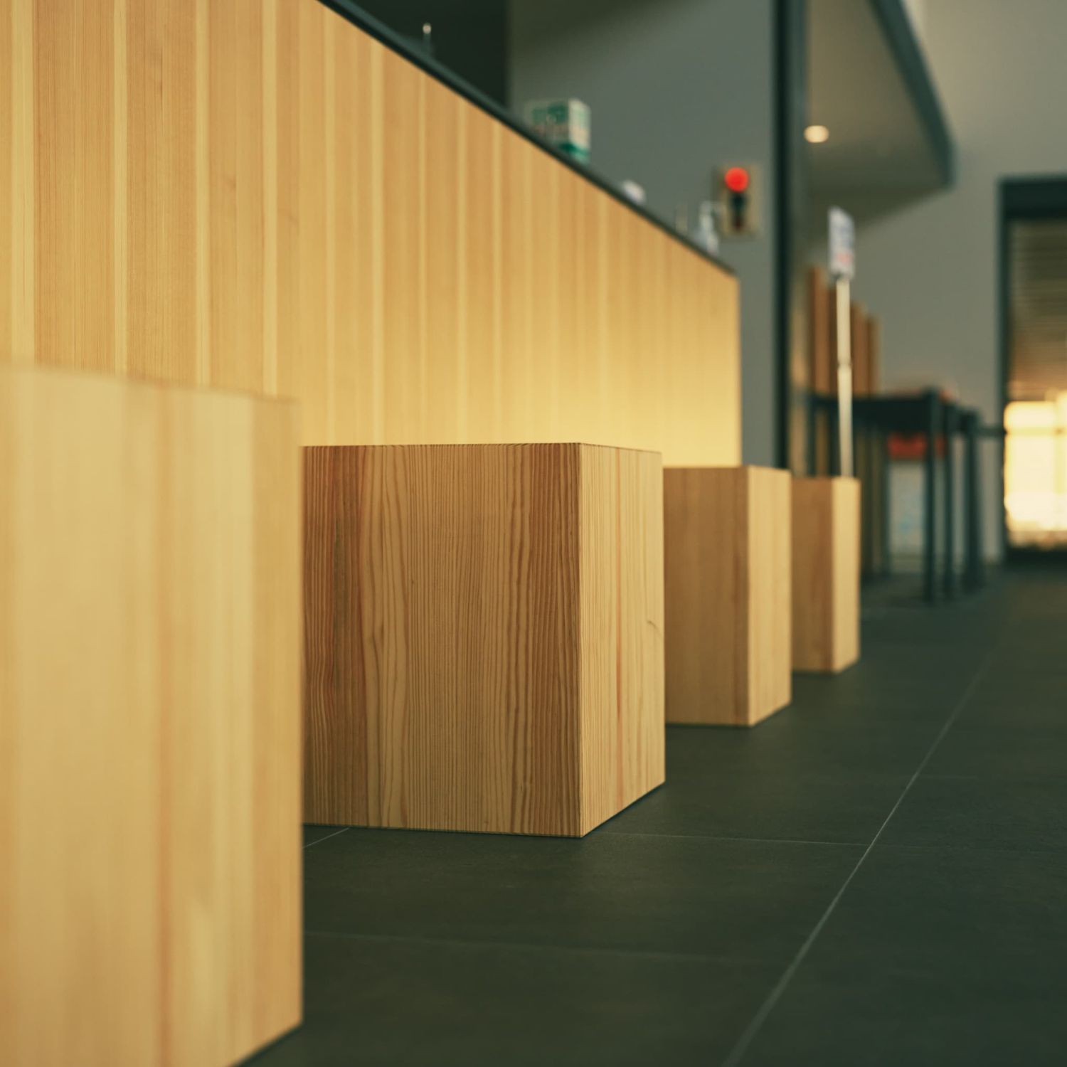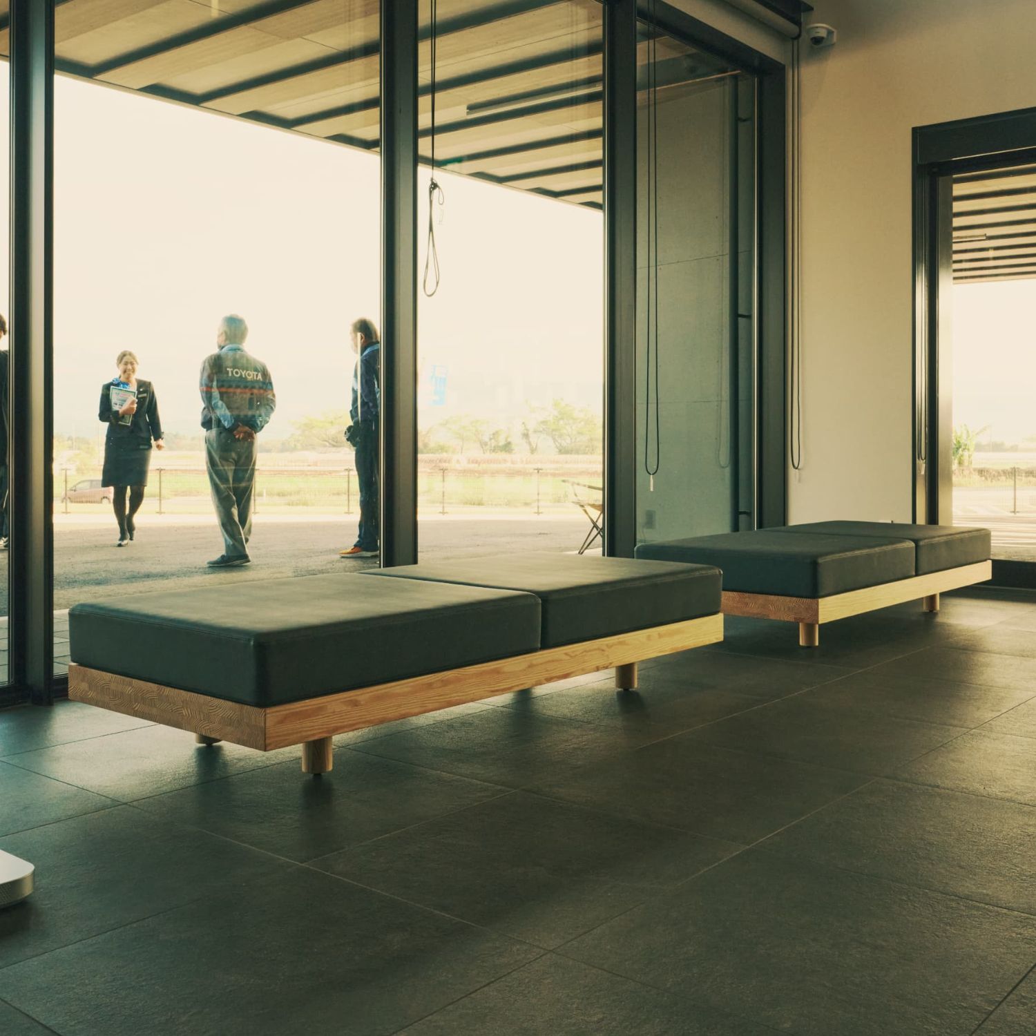 益城町産材は「バッゲージラック」だけでなく「ベンチ」も製造し、リラックスできるサイズ感を大事にしました。自然豊かな阿蘇との調和がとれる木の色によって運転前の心を穏やかにしてくれます。