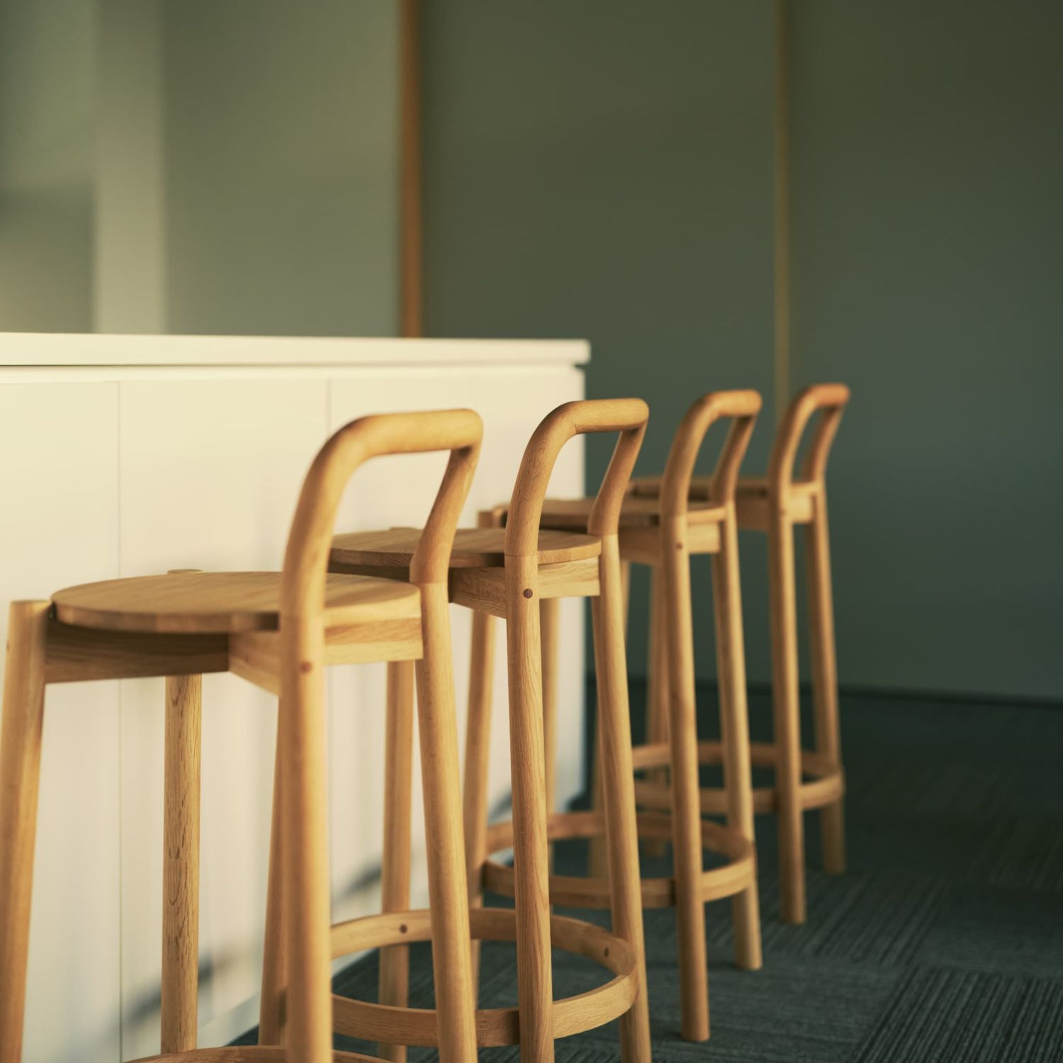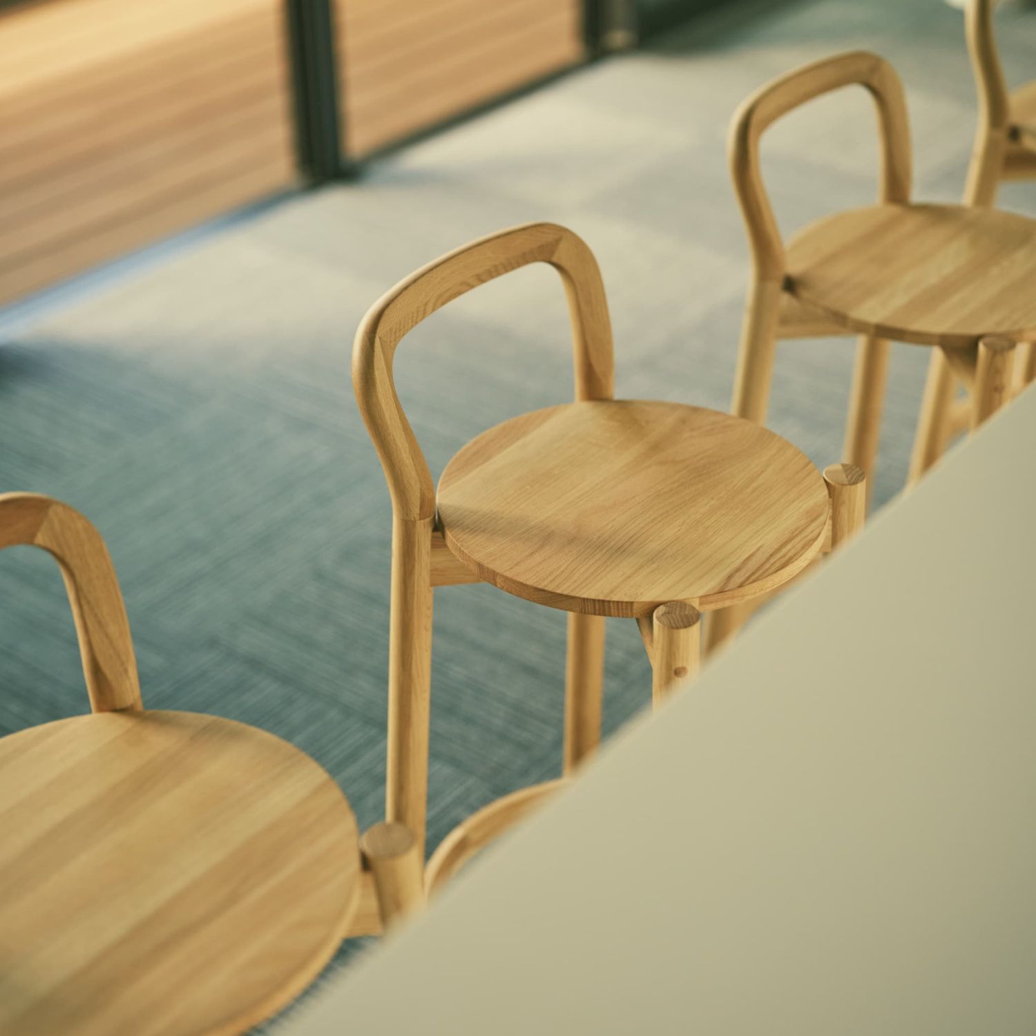 食堂エリアのカウンターには「快適さ」「効率的」をテーマに『Karimoku New Standard』の「キャストールバースツール」を採用しました。シンプルで華奢なサイズ感なので、空間へ順応しやすく、動線の邪魔にならないデザインです。また、小さなバックレストが背もたれとして体を支えてくれますので、食事の時間をさらにリラックスさせてくれます。