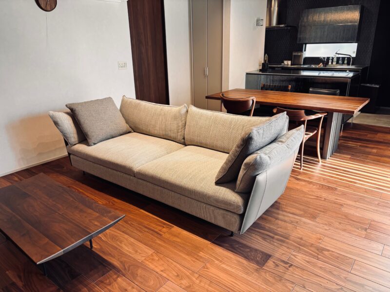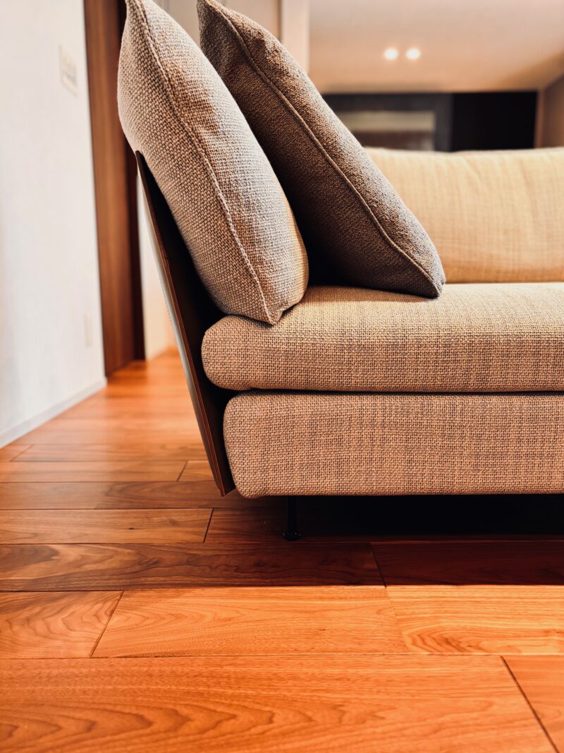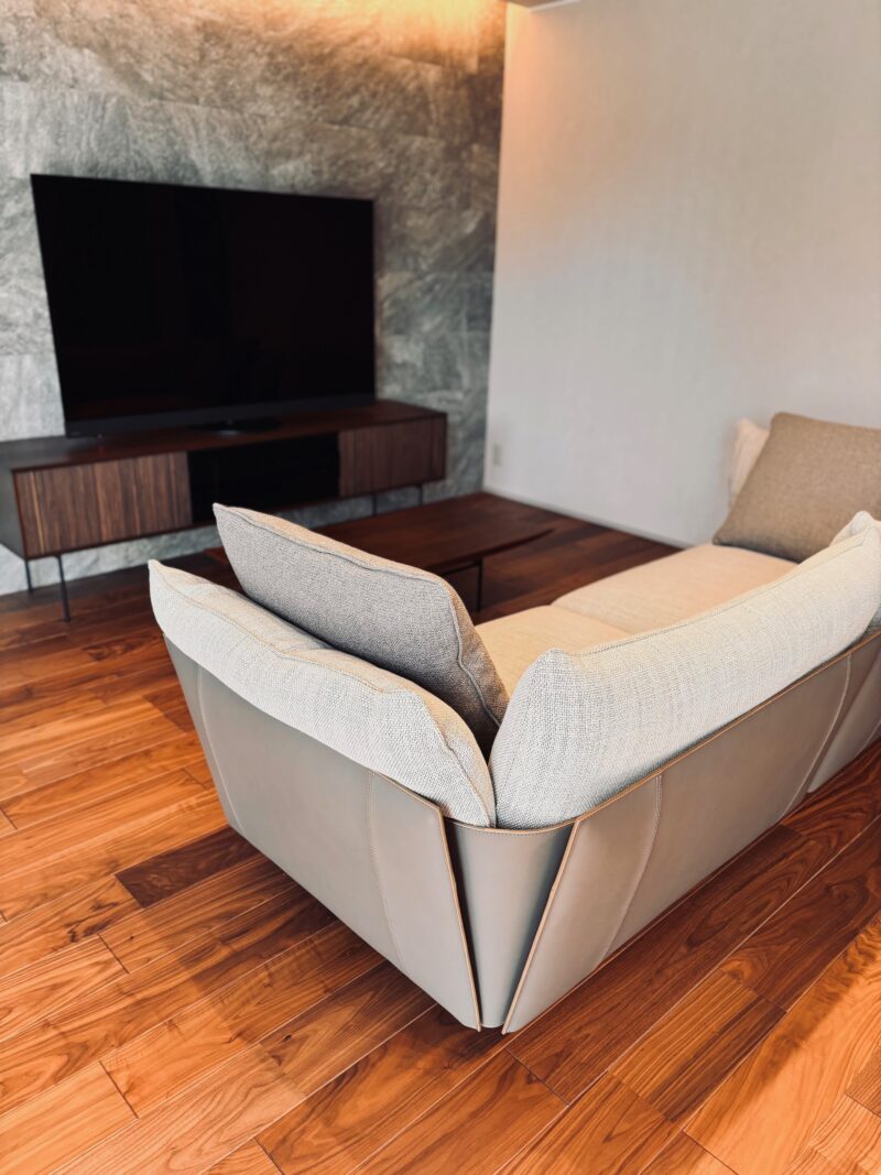 包み込まれるような心地よさを感じさせる大振りなクッションが、ソファ全体に柔らかさをプラスして、凛としたたたずまいの中に優美な印象を与えています。
