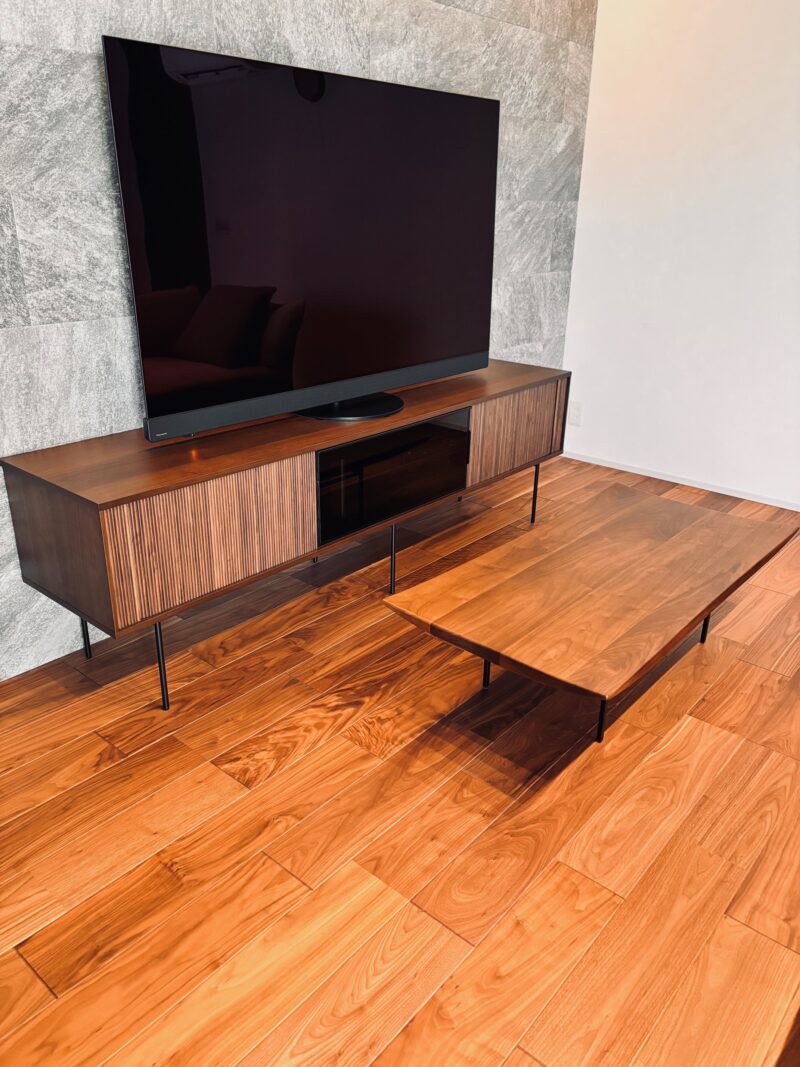 TVボード、リビングテーブルとソファはすべて「Ritzwell」で統一されています。