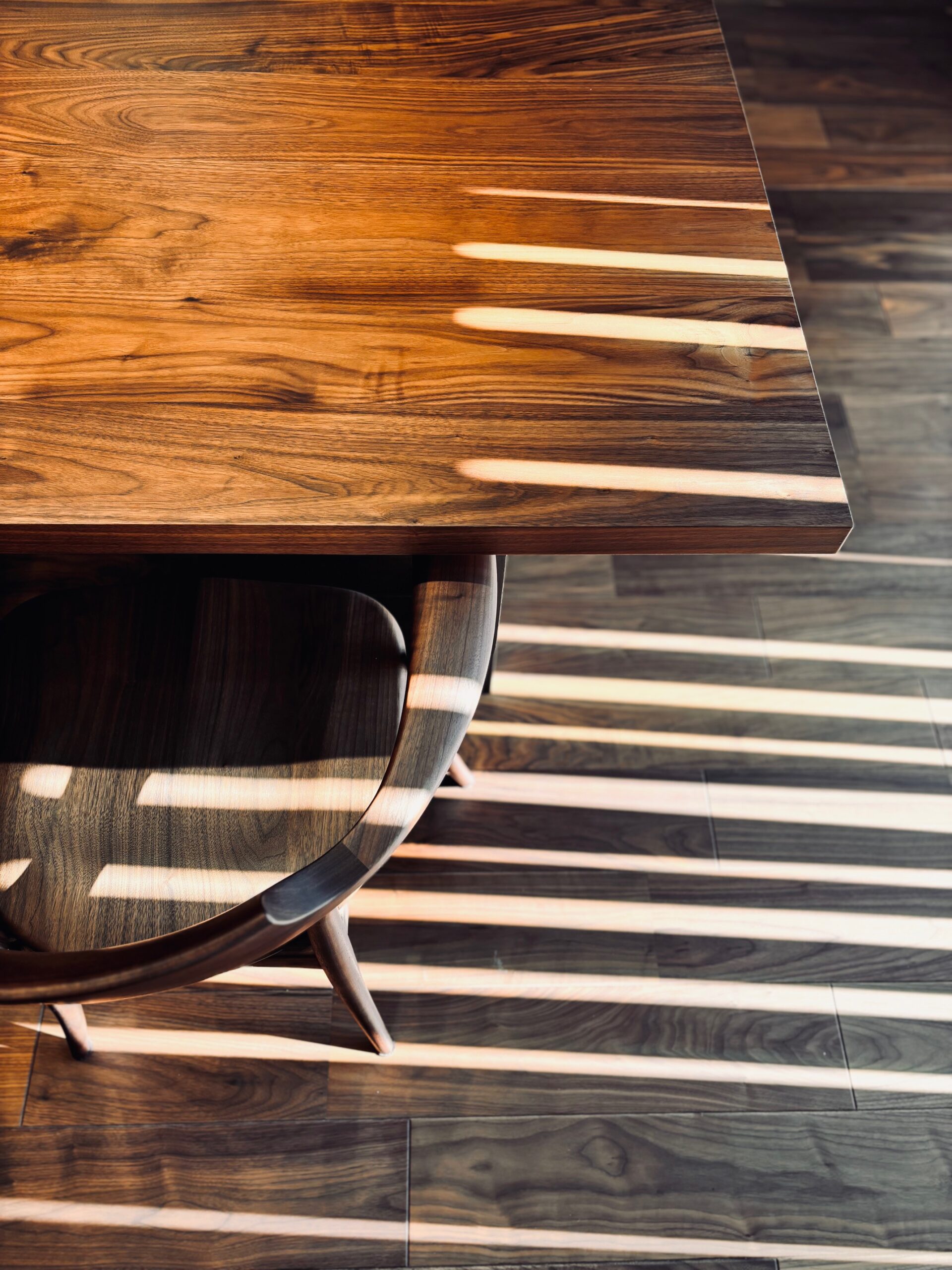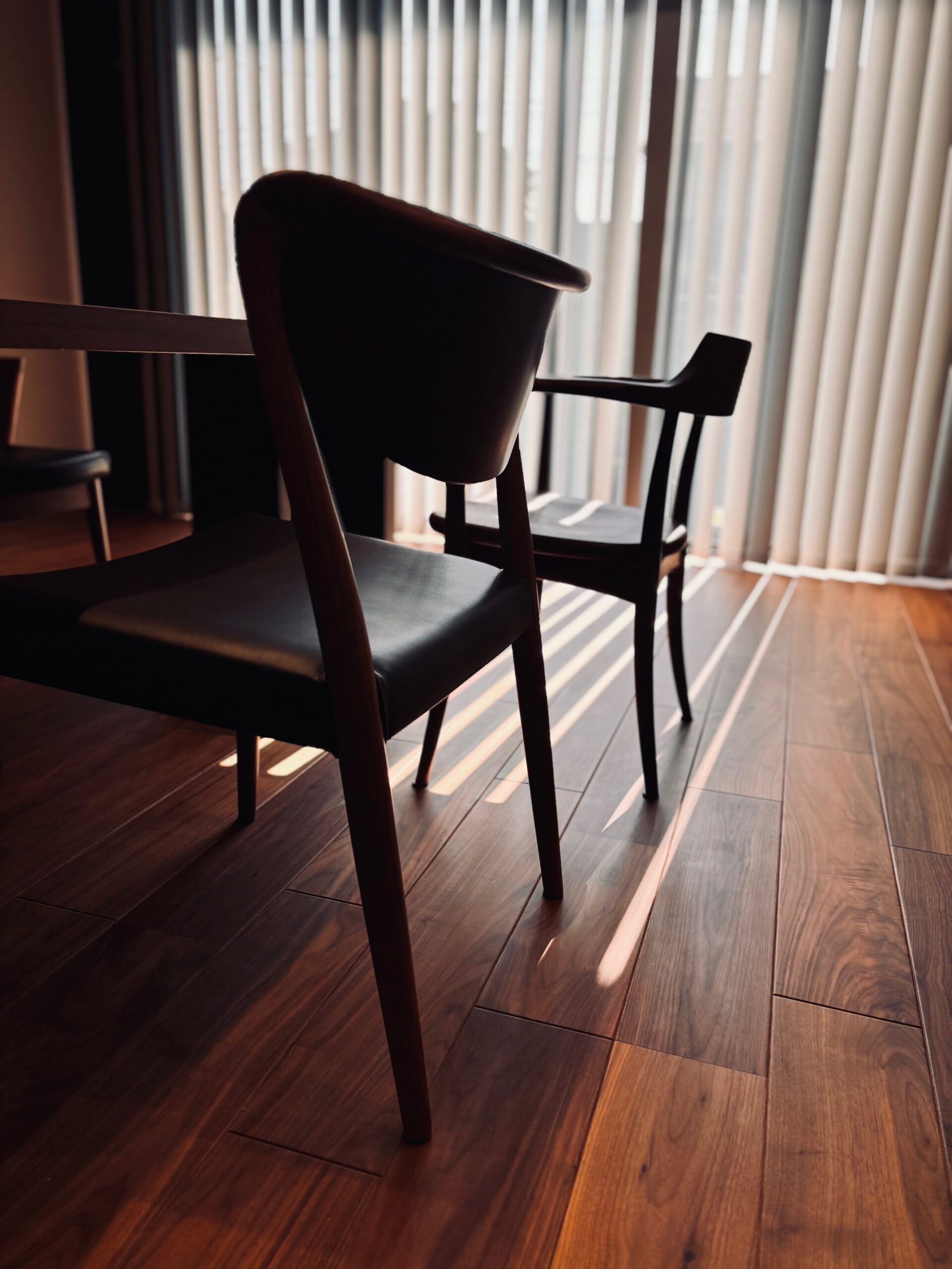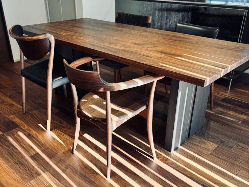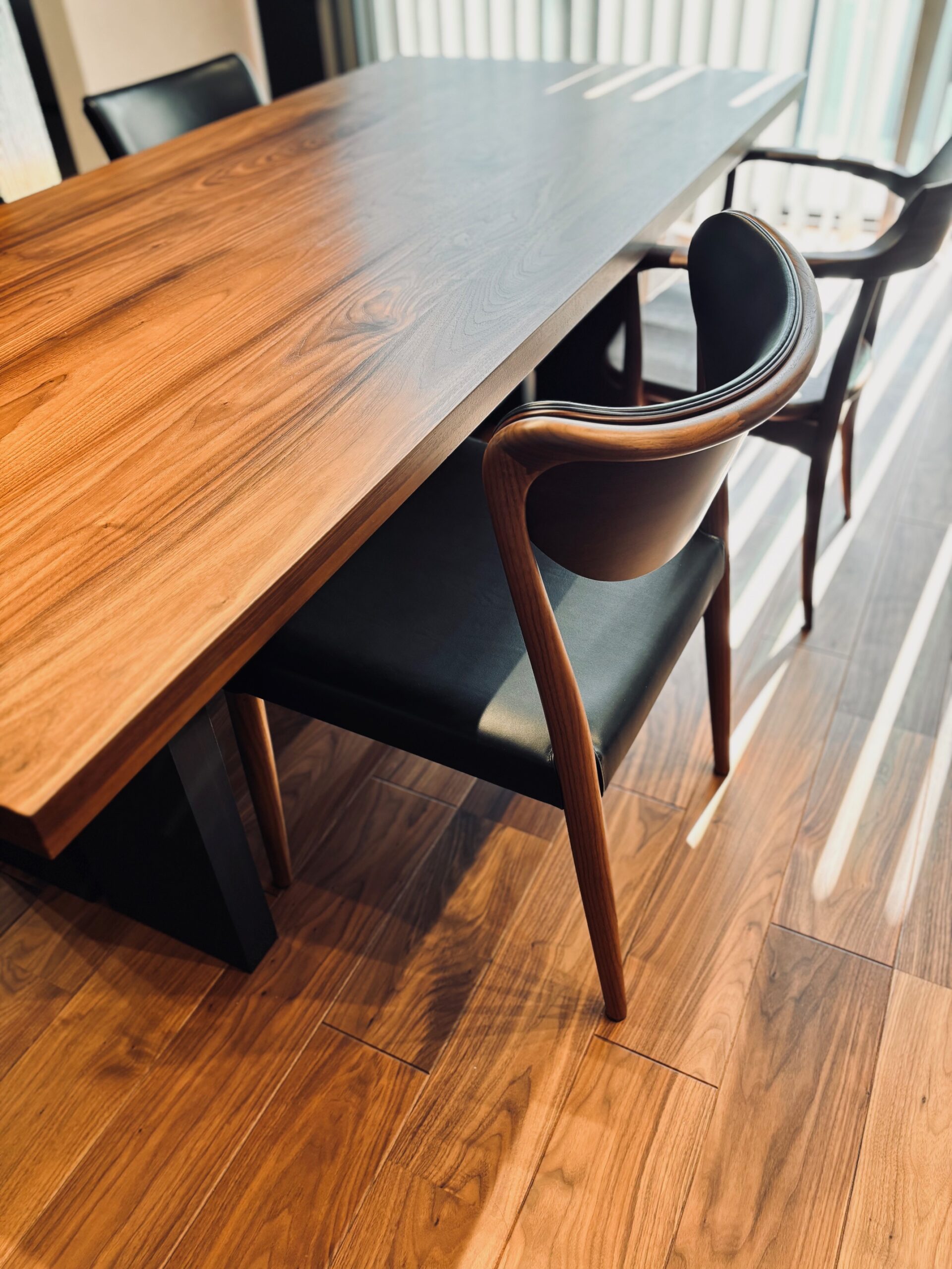 厚みのある無垢天板とそれを支える重厚な板脚。ボリュームのあるパーツ同士の絶妙なバランスが、抜群の安定感を感じさせるダイニングテーブルです。